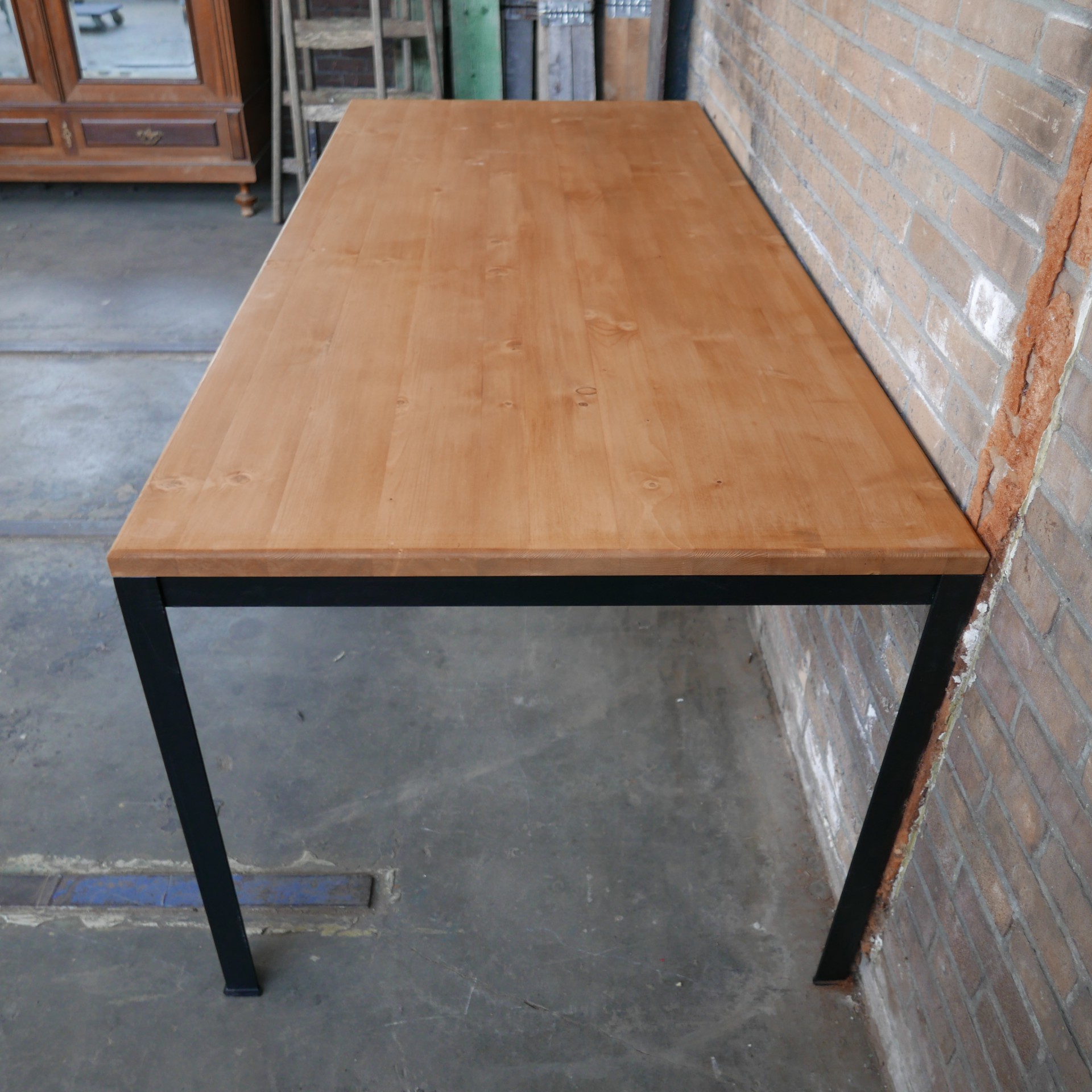 Industriële metalen tafel met houten blad.