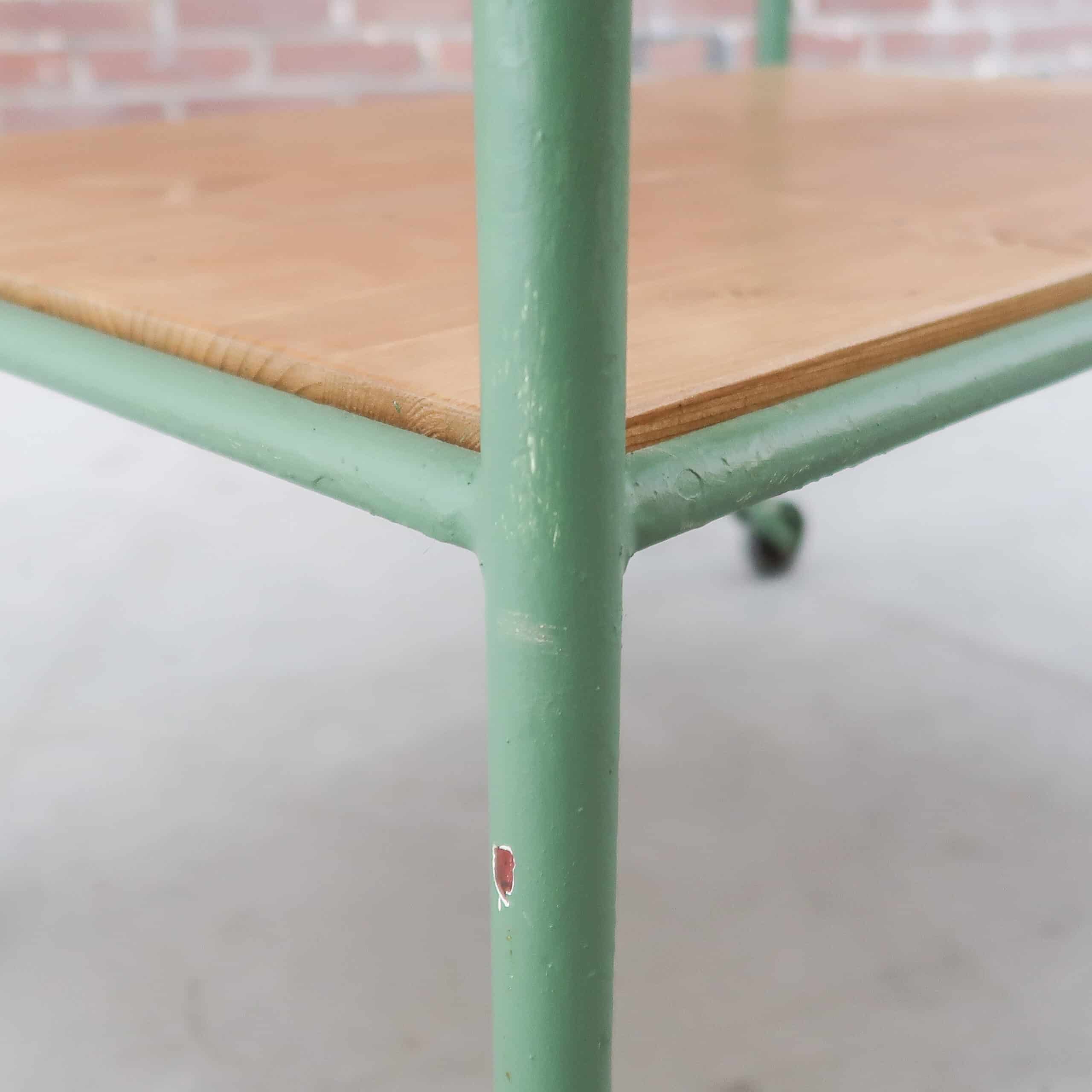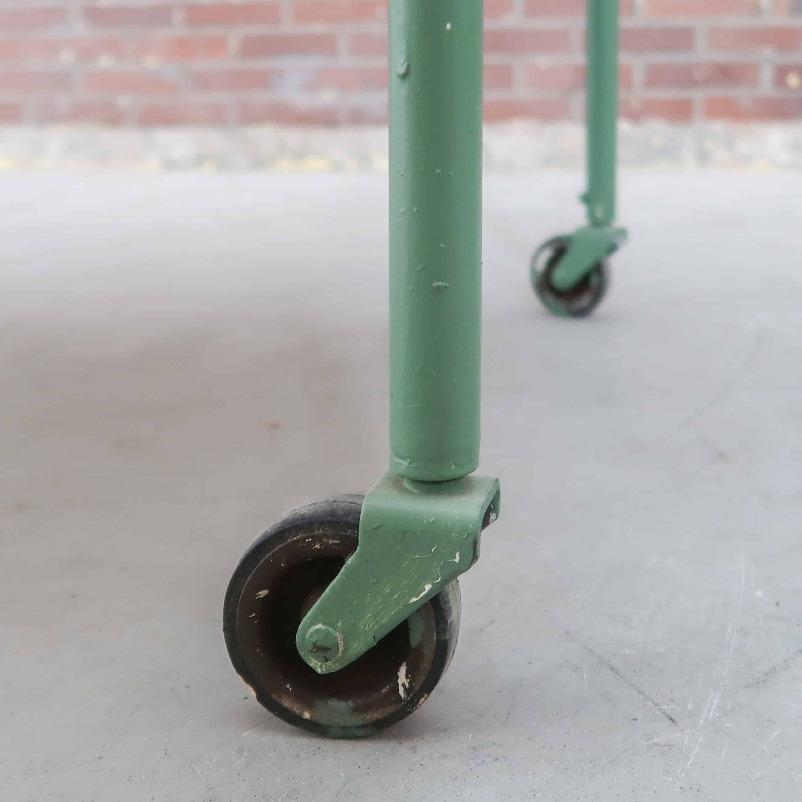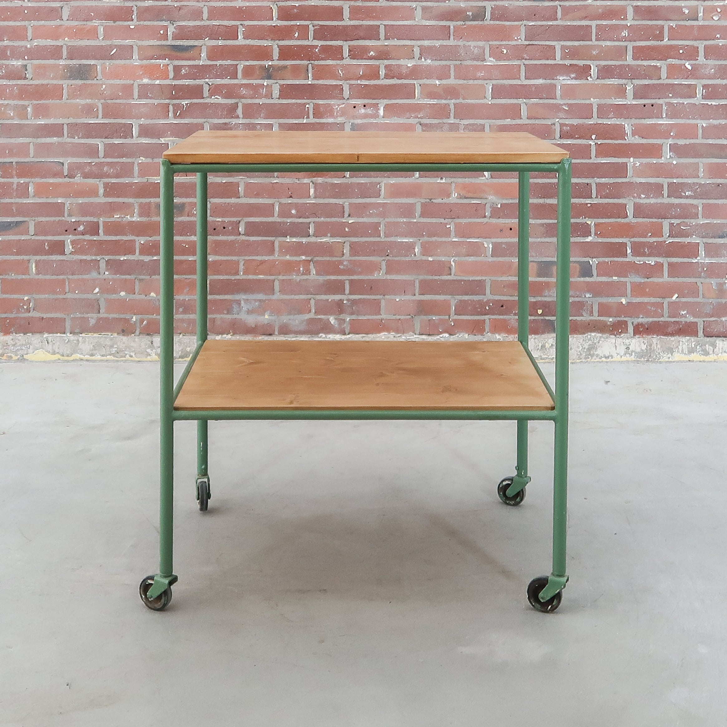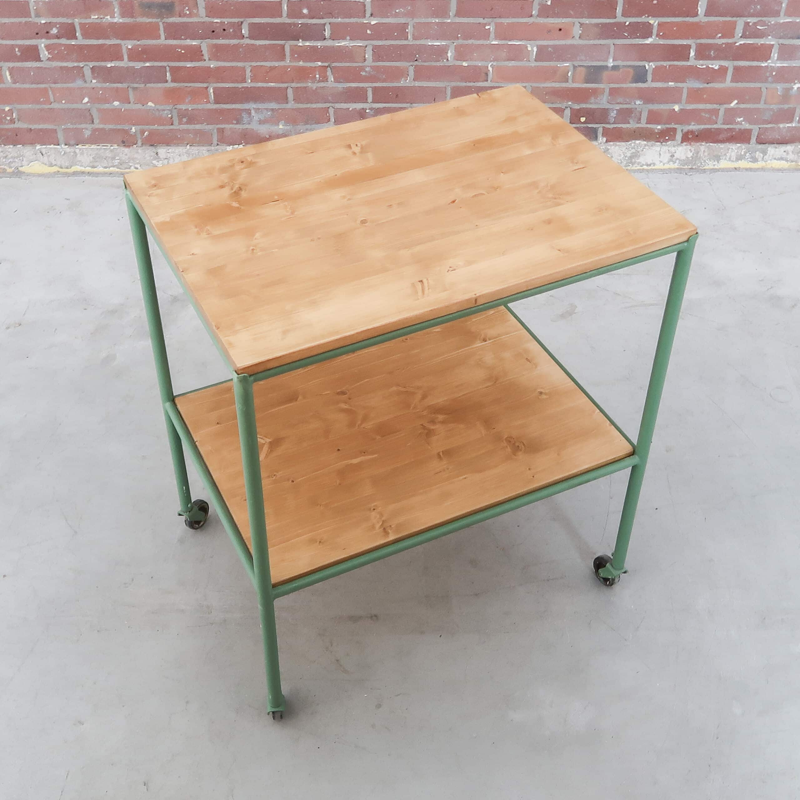 Stoere industriële trolley! Het oude metaal heeft een fris nieuw kleurtje en de planken zijn vervangen. Leuk als drank trolley in een mancave.