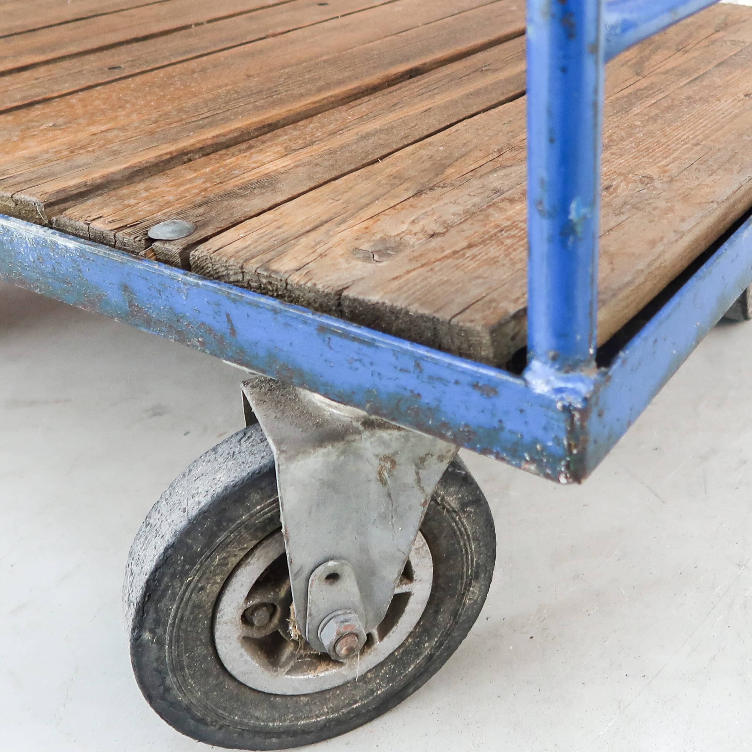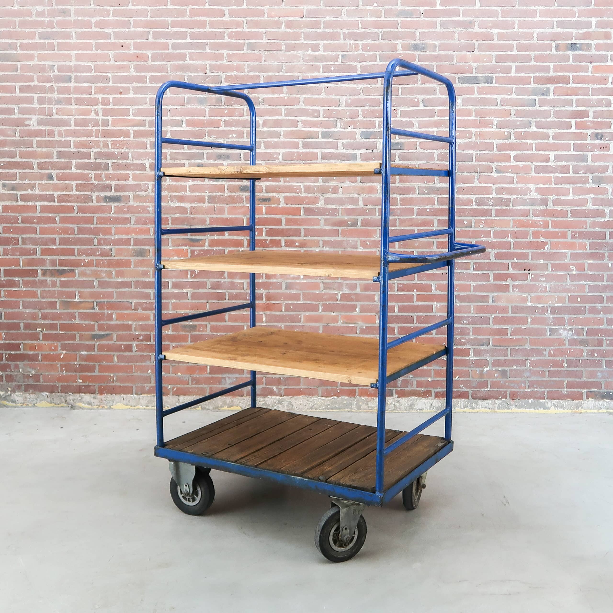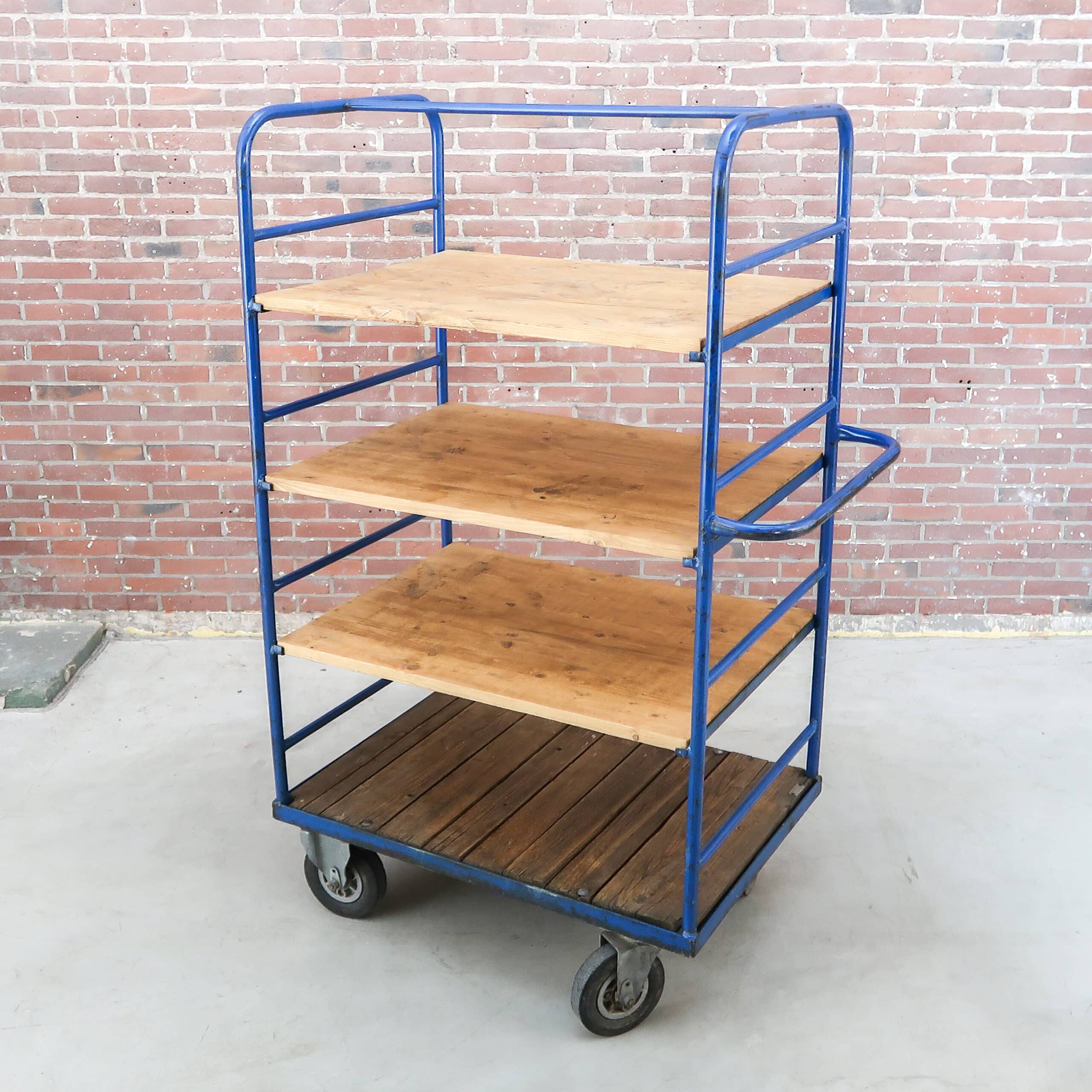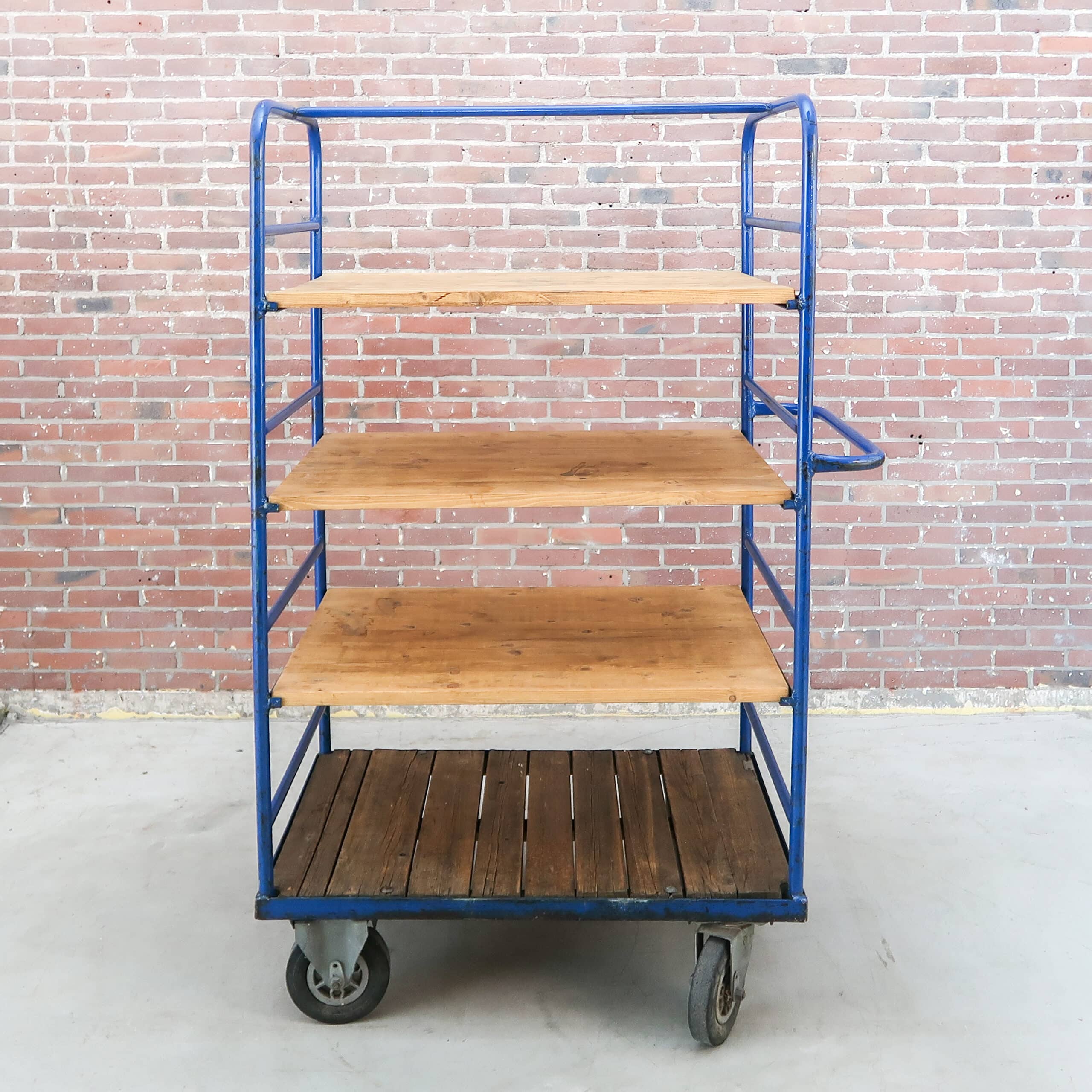 Stoere industriële trolley op wielen! Fijn als wandrek maar ook als room-divider in een kamer. Het hout en frame zijn door de jaren heen wat verweerd, zie foto’s.