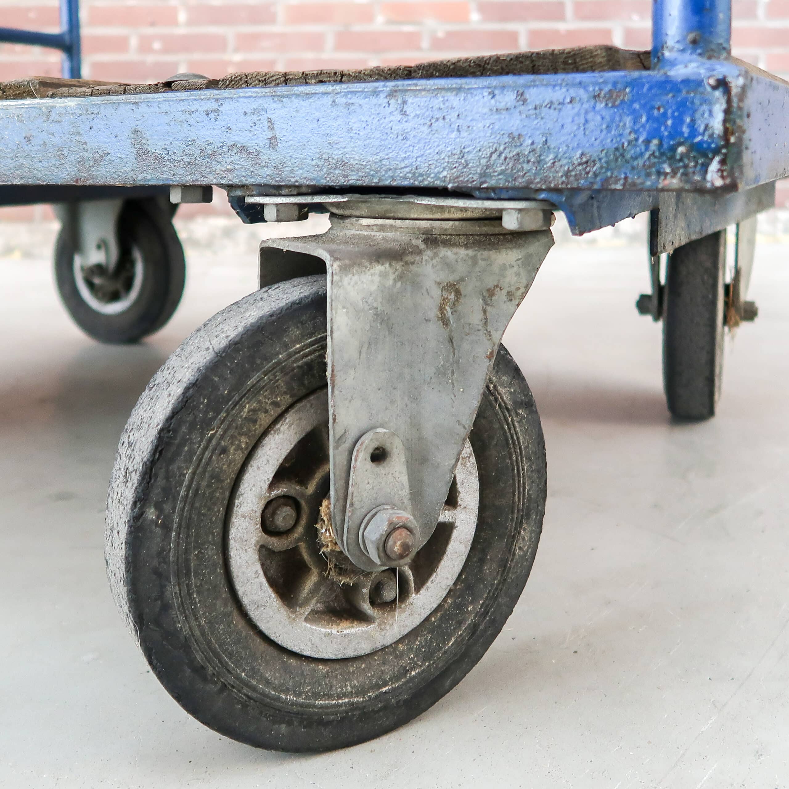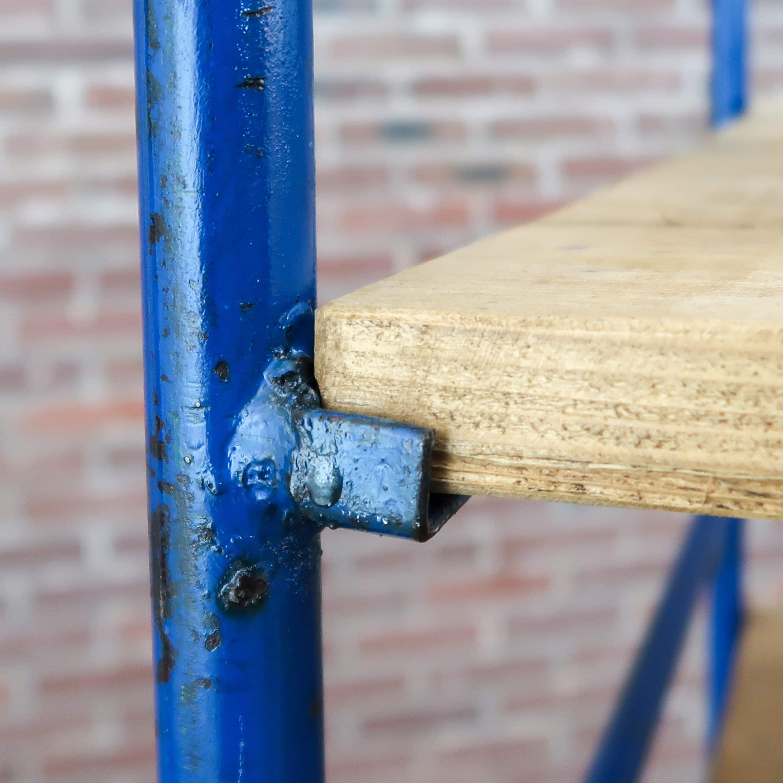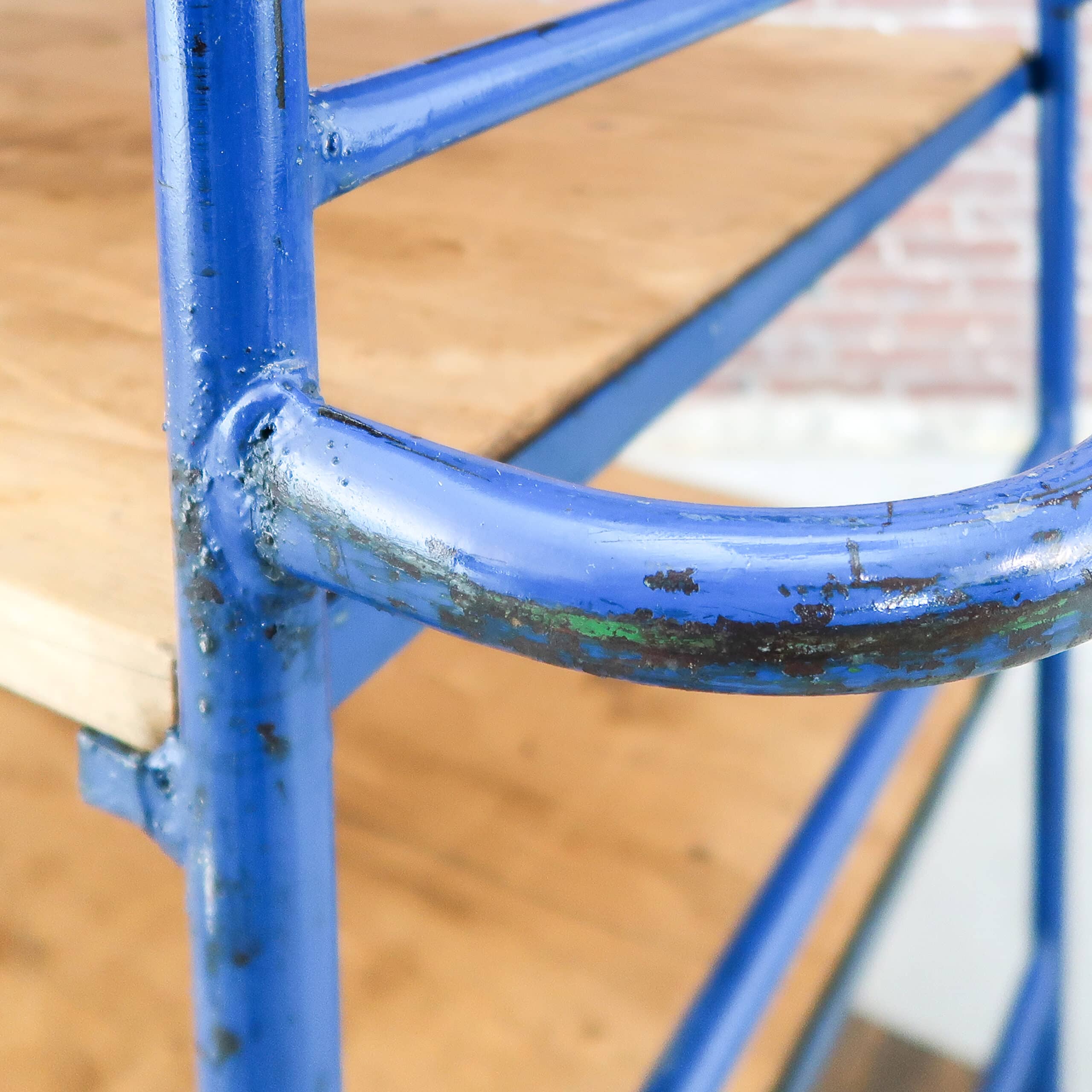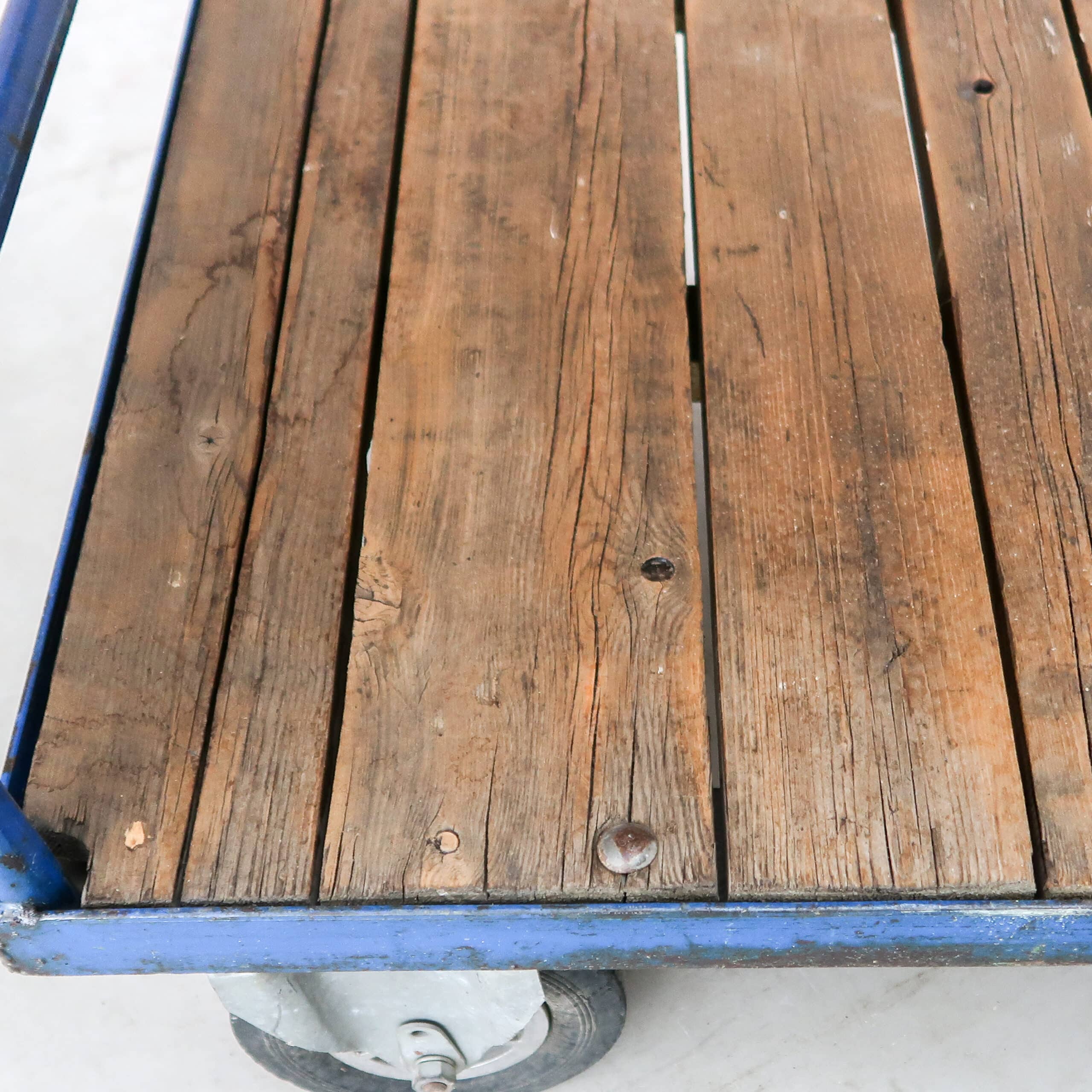 Stoere industriële trolley op wielen! Fijn als wandrek maar ook als room-divider in een kamer. Het hout en frame zijn door de jaren heen wat verweerd, zie foto’s.