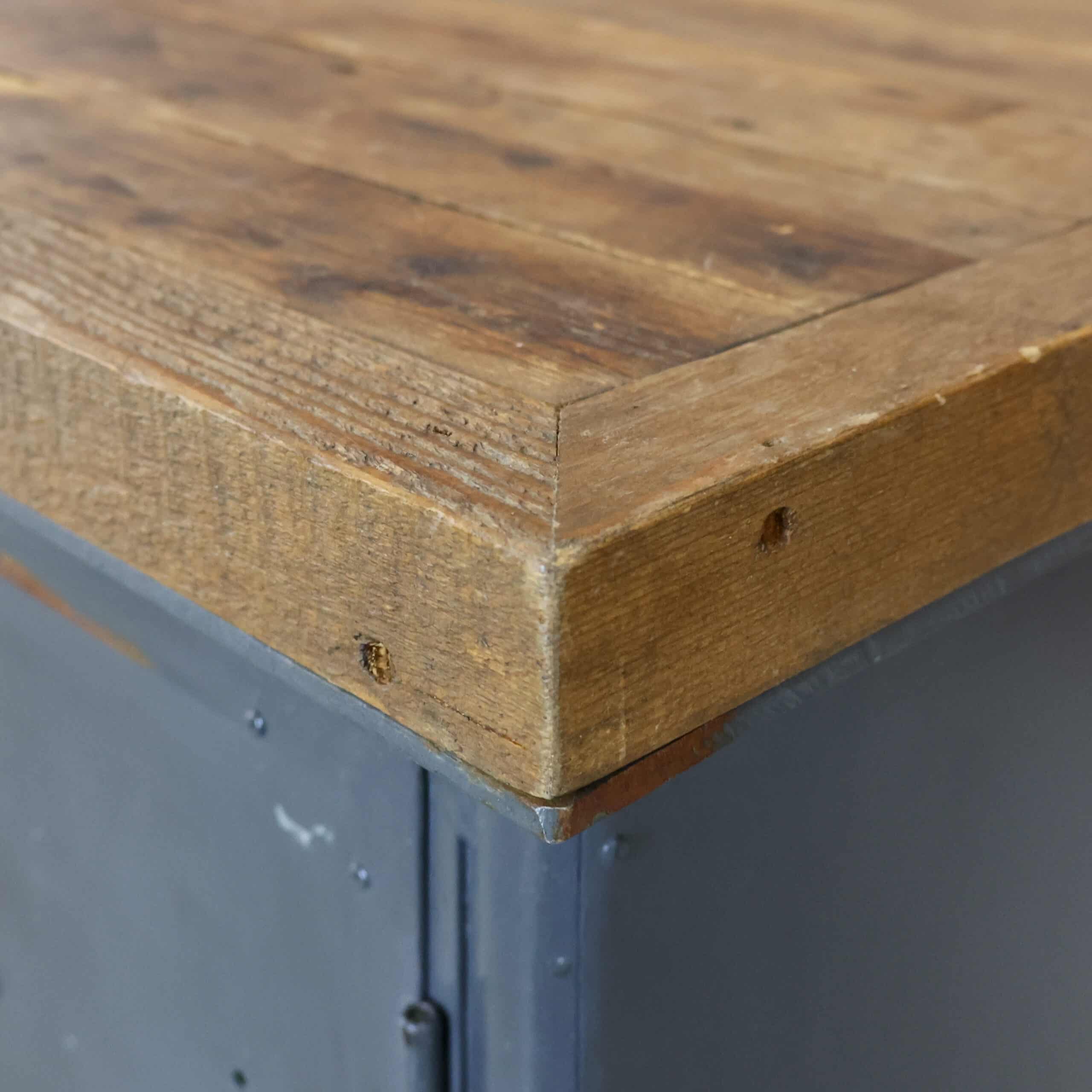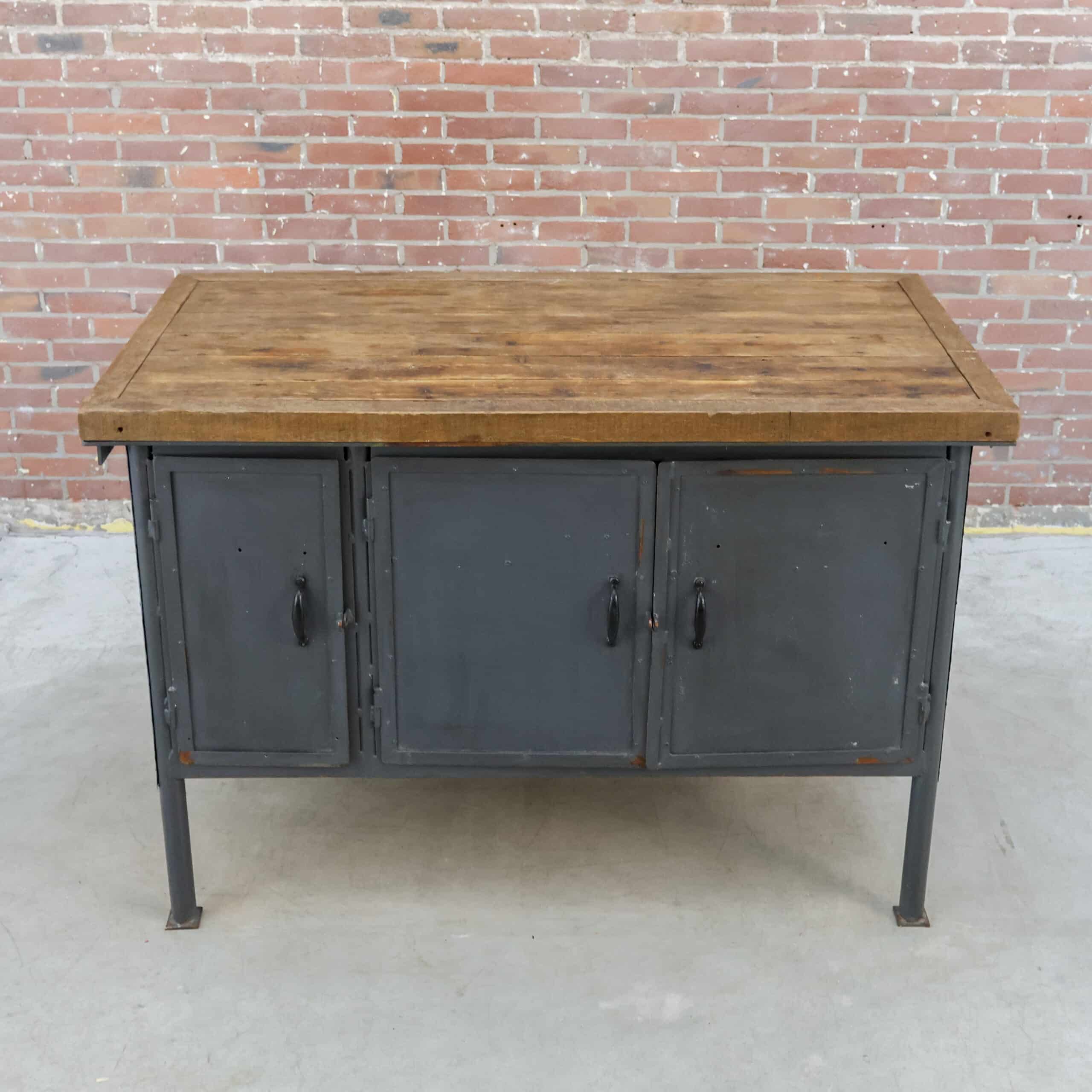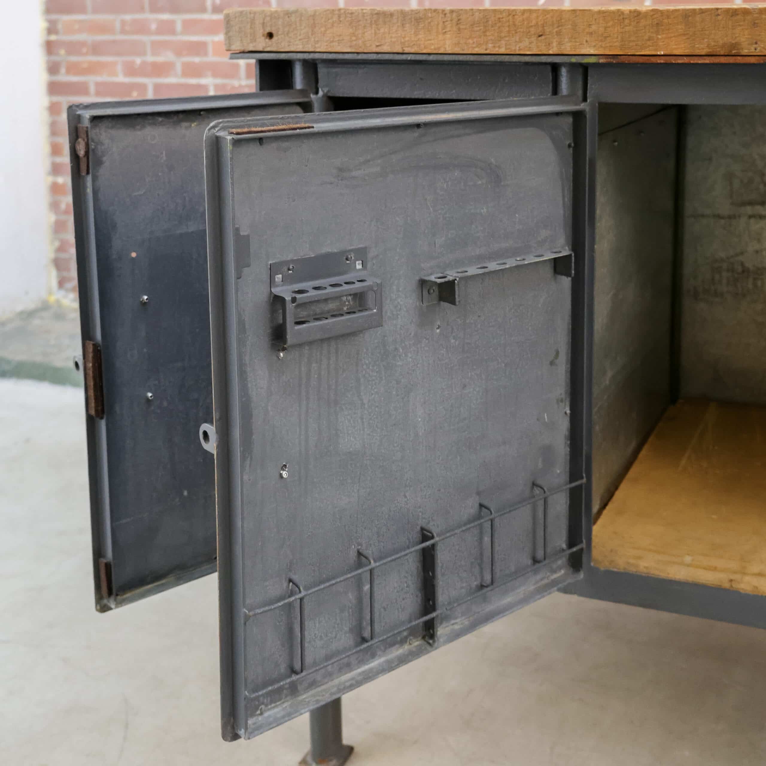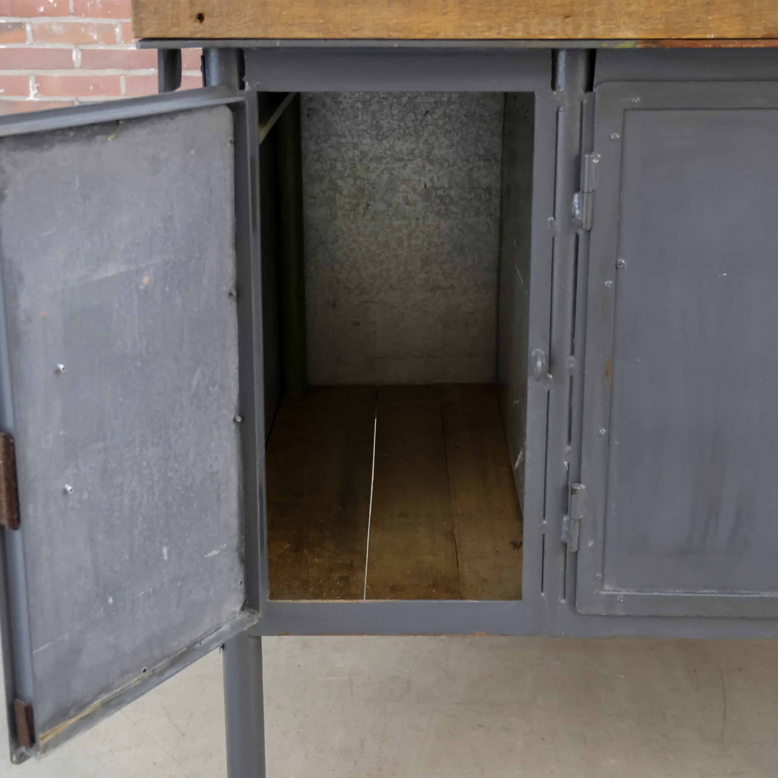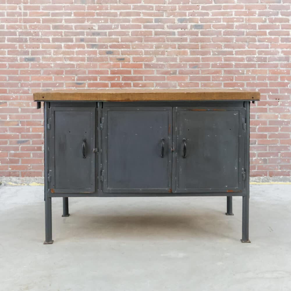 Deze industriële werkbank heeft een robuust metalen onderstel en een mooi doorleefd houten blad, precies zoals je het wil zien bij een echte old-school fabrieks werktafel. De grijze lak toont gebruikssporen en patina, wat hem die perfecte vintage uitstraling geeft. Een karaktervol en stijlvol meubel dat geweldig werkt als keukeneiland, dressoir, plantentafel of stoere side table.