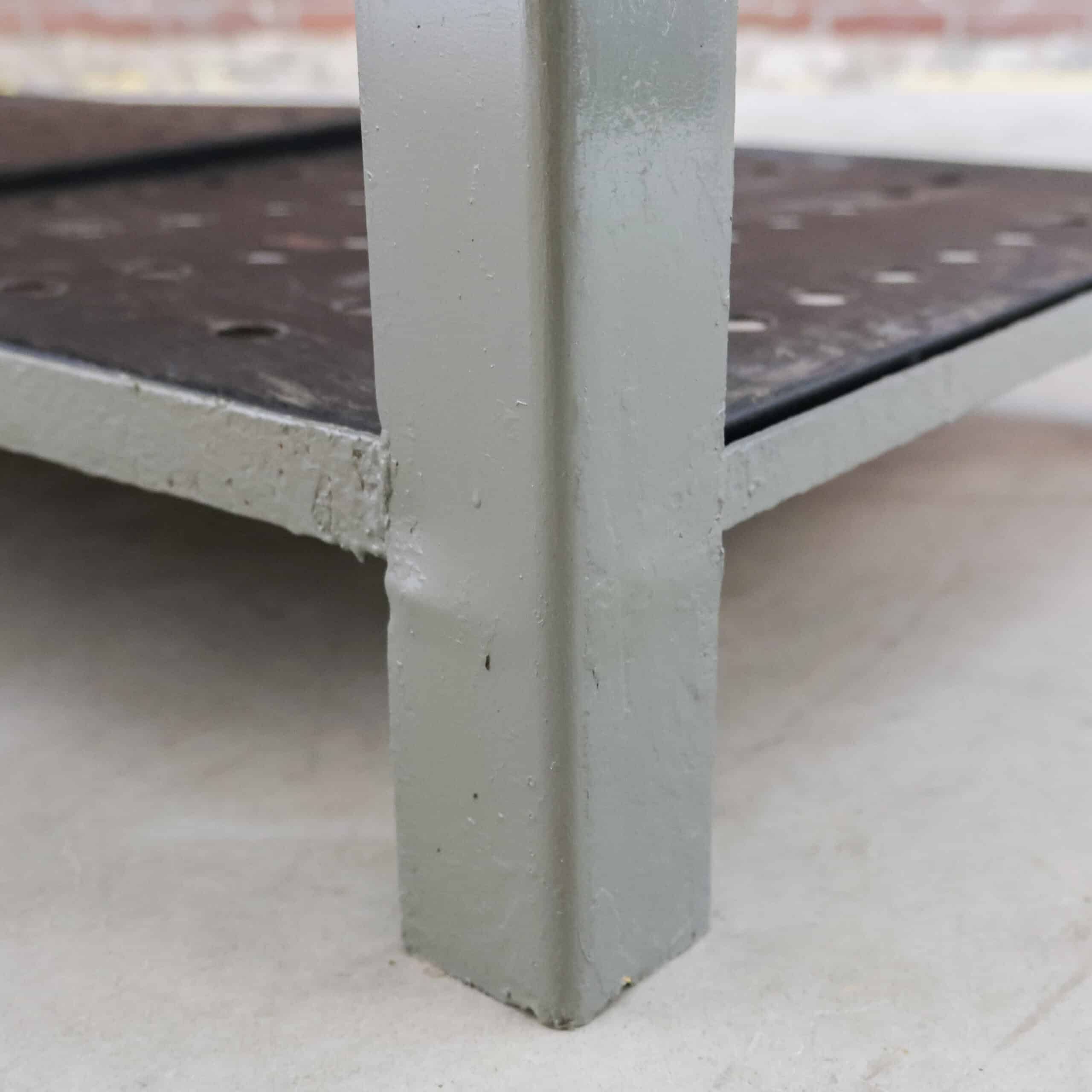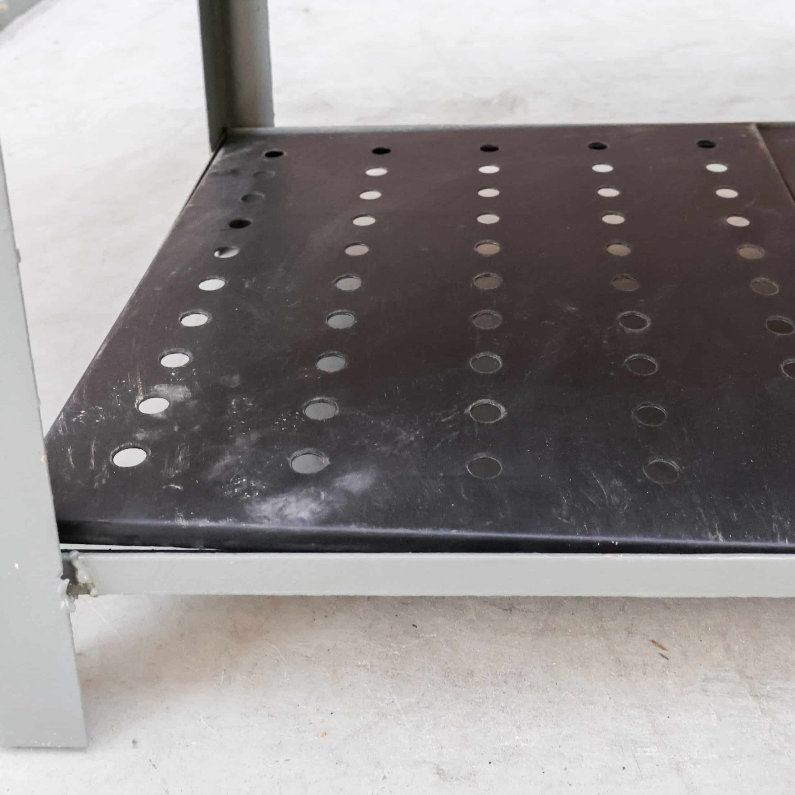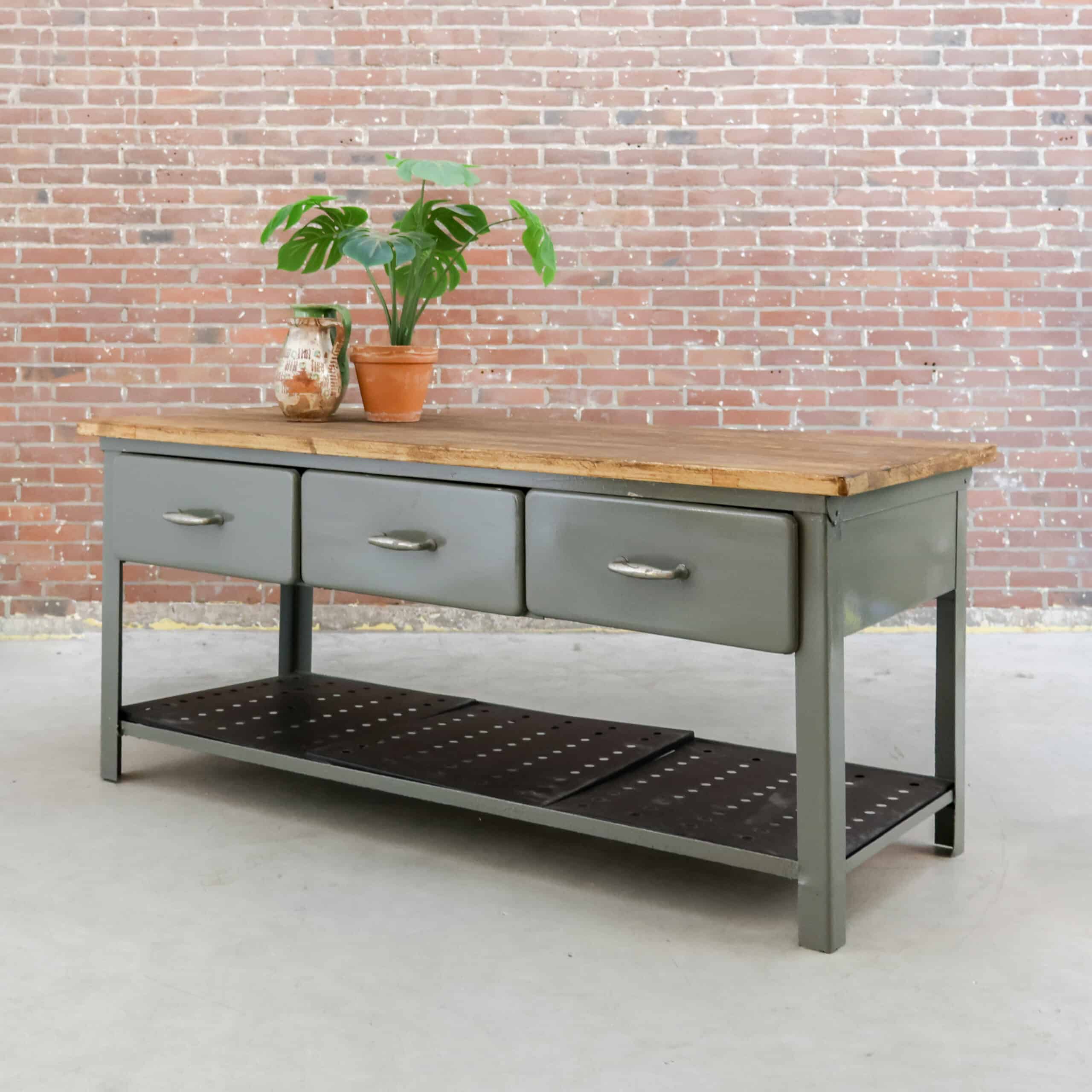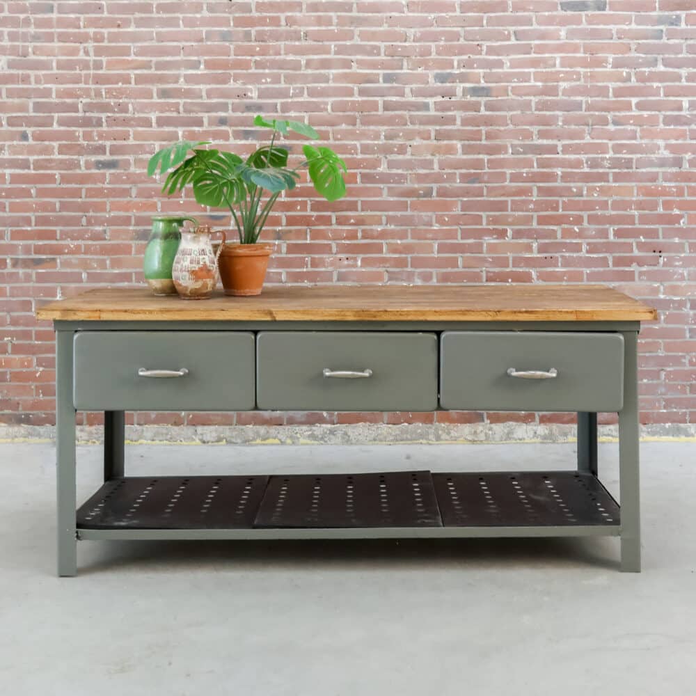 Deze industriële werkbank heeft een robuust metalen onderstel en een mooi doorleefd houten blad, precies zoals je het wil zien bij een echte old-school fabrieks werktafel. Een karaktervol en stijlvol meubel dat geweldig werkt als keukeneiland, dressoir, plantentafel of stoere side-table.