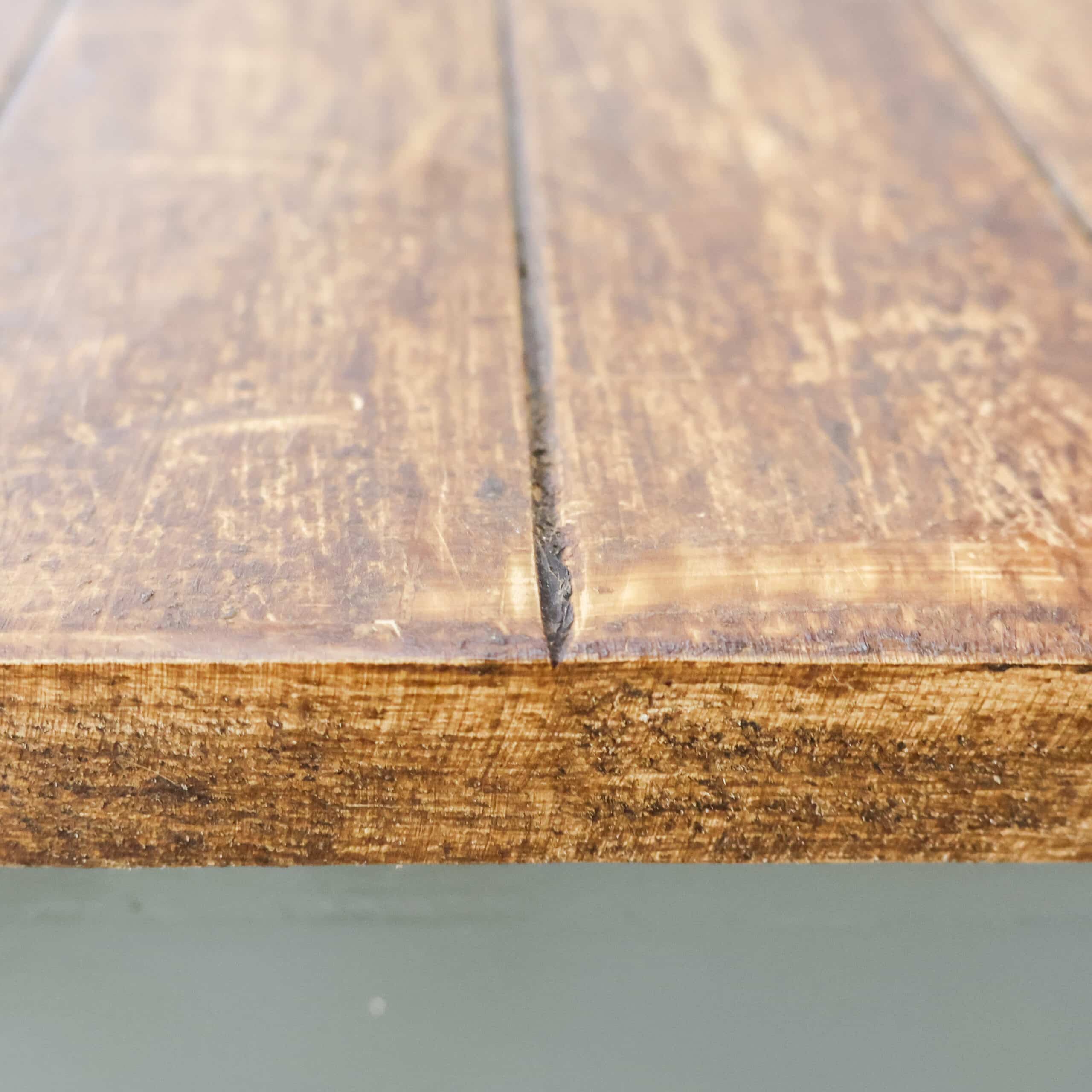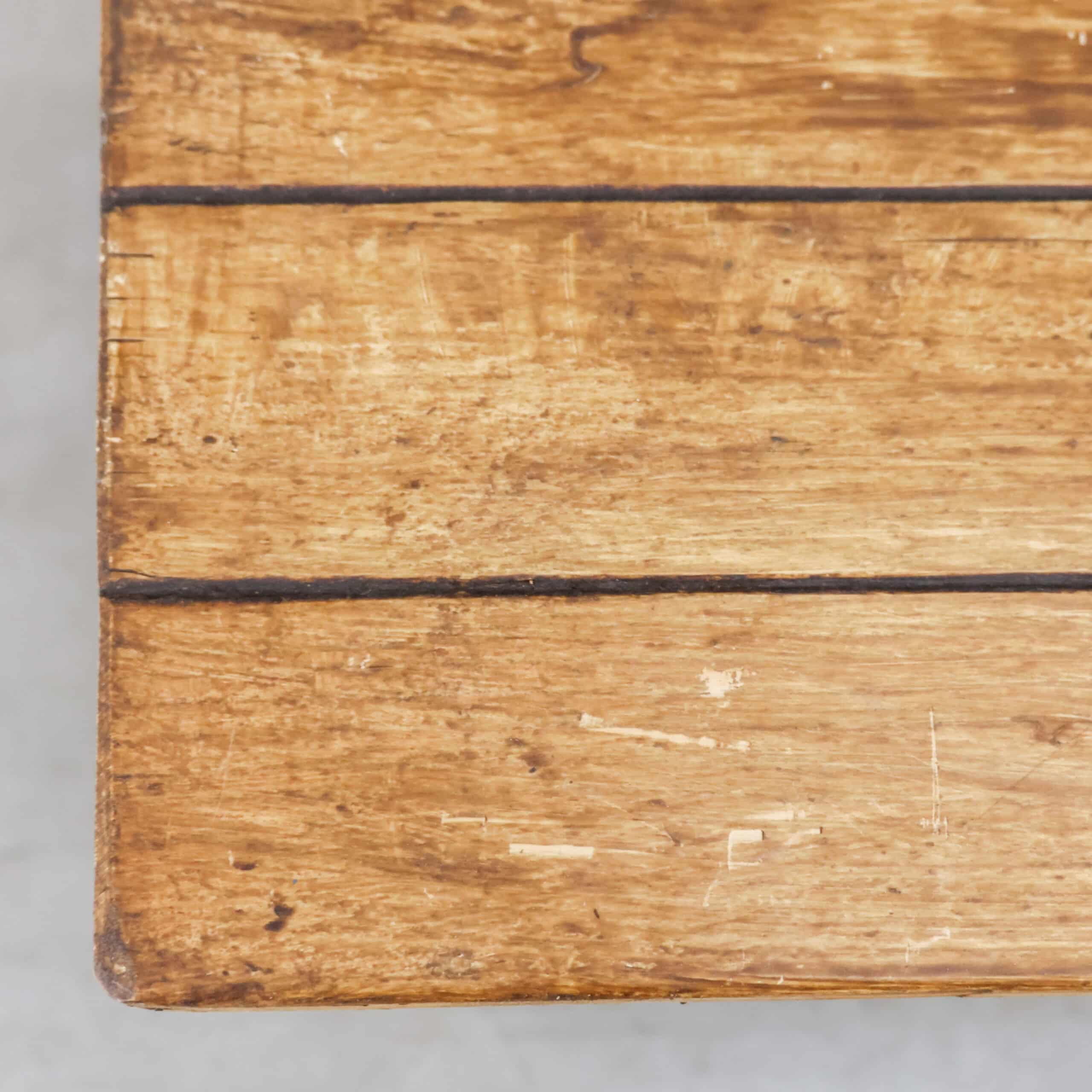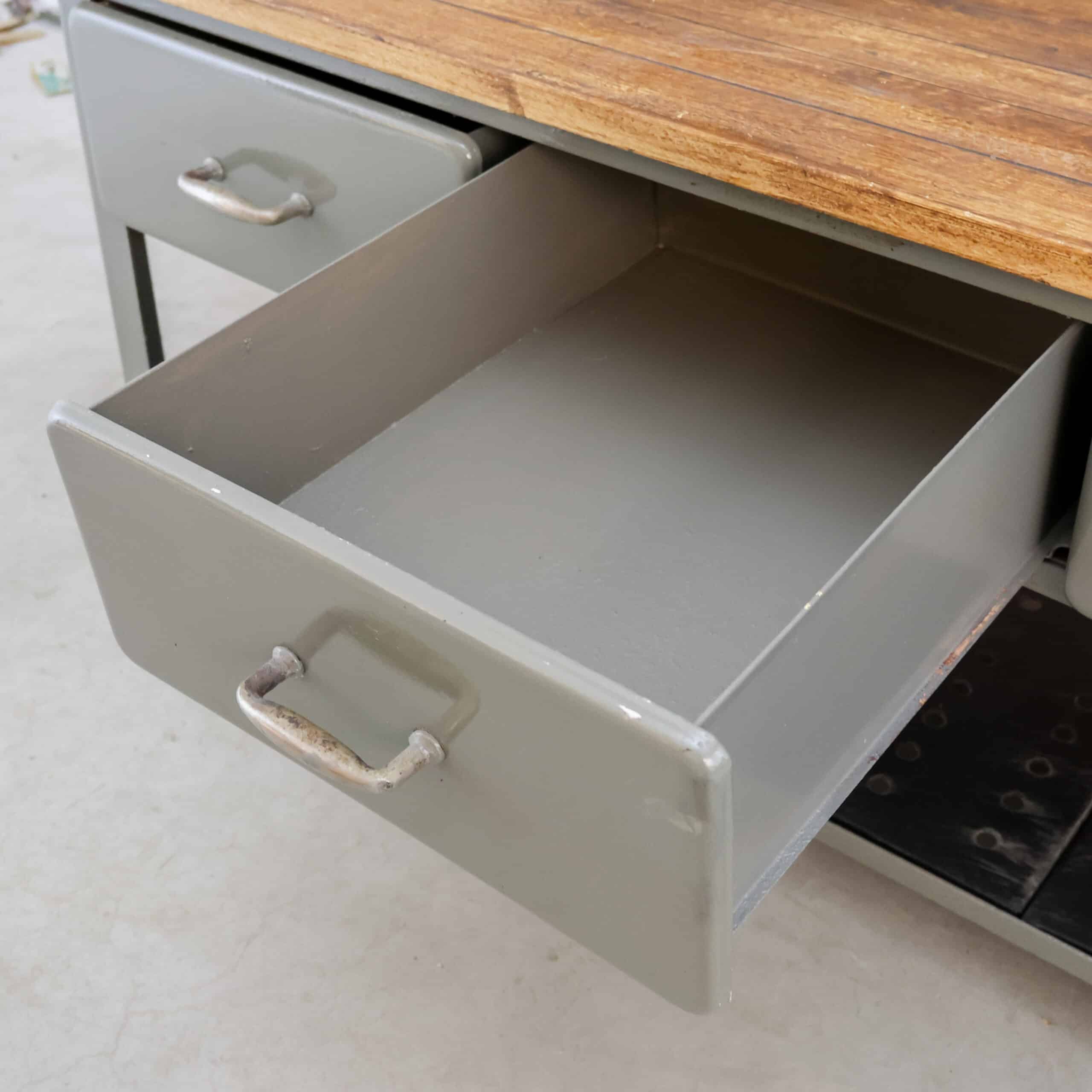 Deze industriële werkbank heeft een robuust metalen onderstel en een mooi doorleefd houten blad, precies zoals je het wil zien bij een echte old-school fabrieks werktafel. Een karaktervol en stijlvol meubel dat geweldig werkt als keukeneiland, dressoir, plantentafel of stoere side-table.