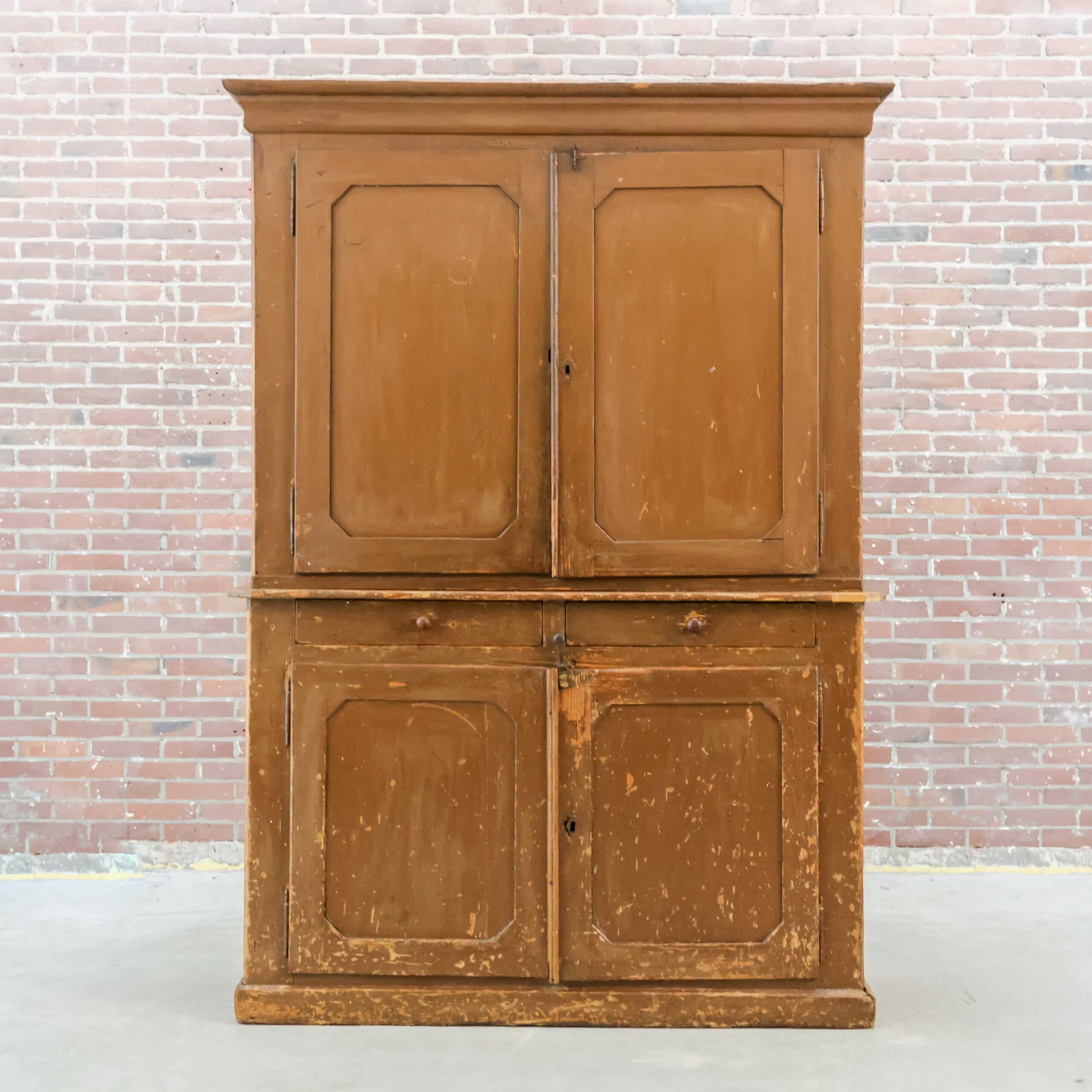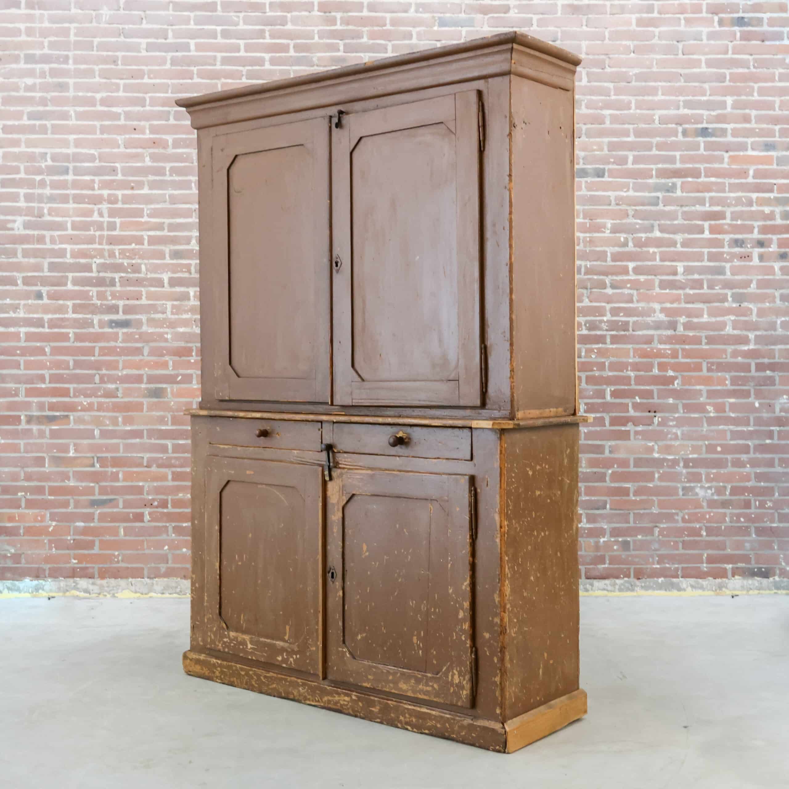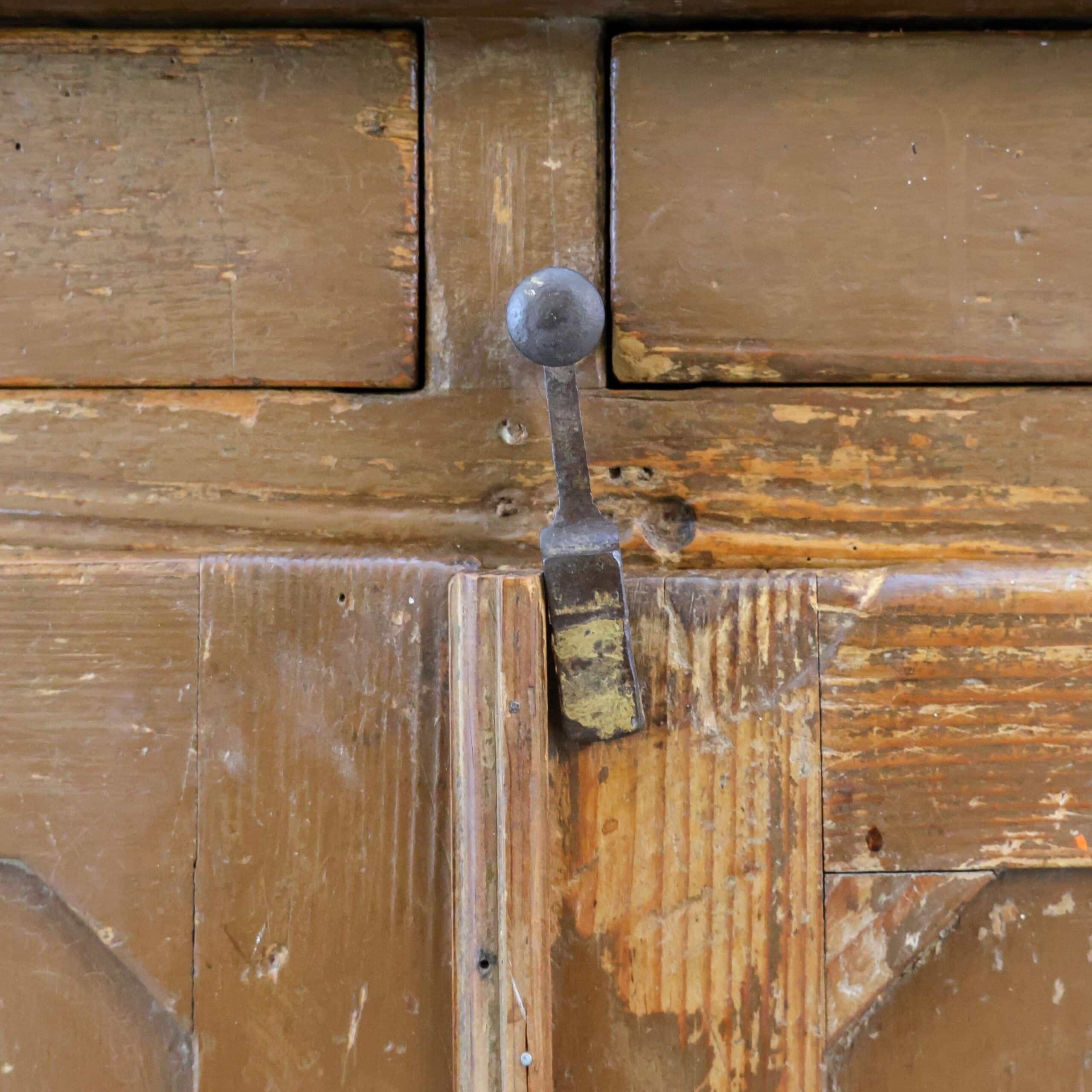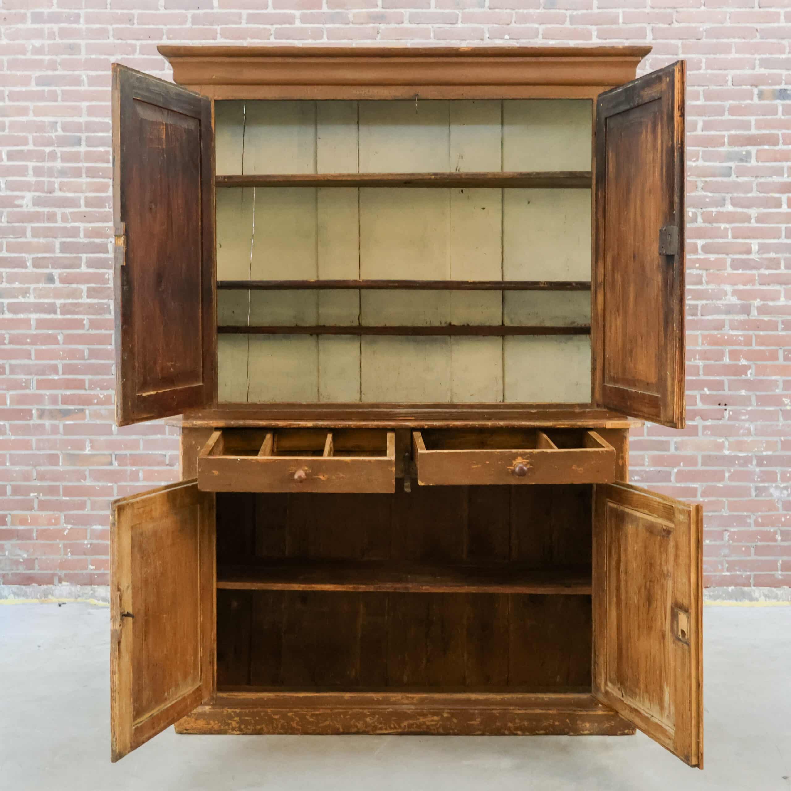 Authentieke landelijke buffetkast uit circa 1900, met een prachtige doorleefde uitstraling en originele details zoals de ijzeren sluiting en paneeldeuren. De kast heeft een warme, geleefde patina die perfect past binnen een wabi-sabi interieur waar karakter en geschiedenis zichtbaar mogen blijven. Binnenin praktische planken en lades, ideaal voor servies, linnengoed of als sfeervolle opbergkast.