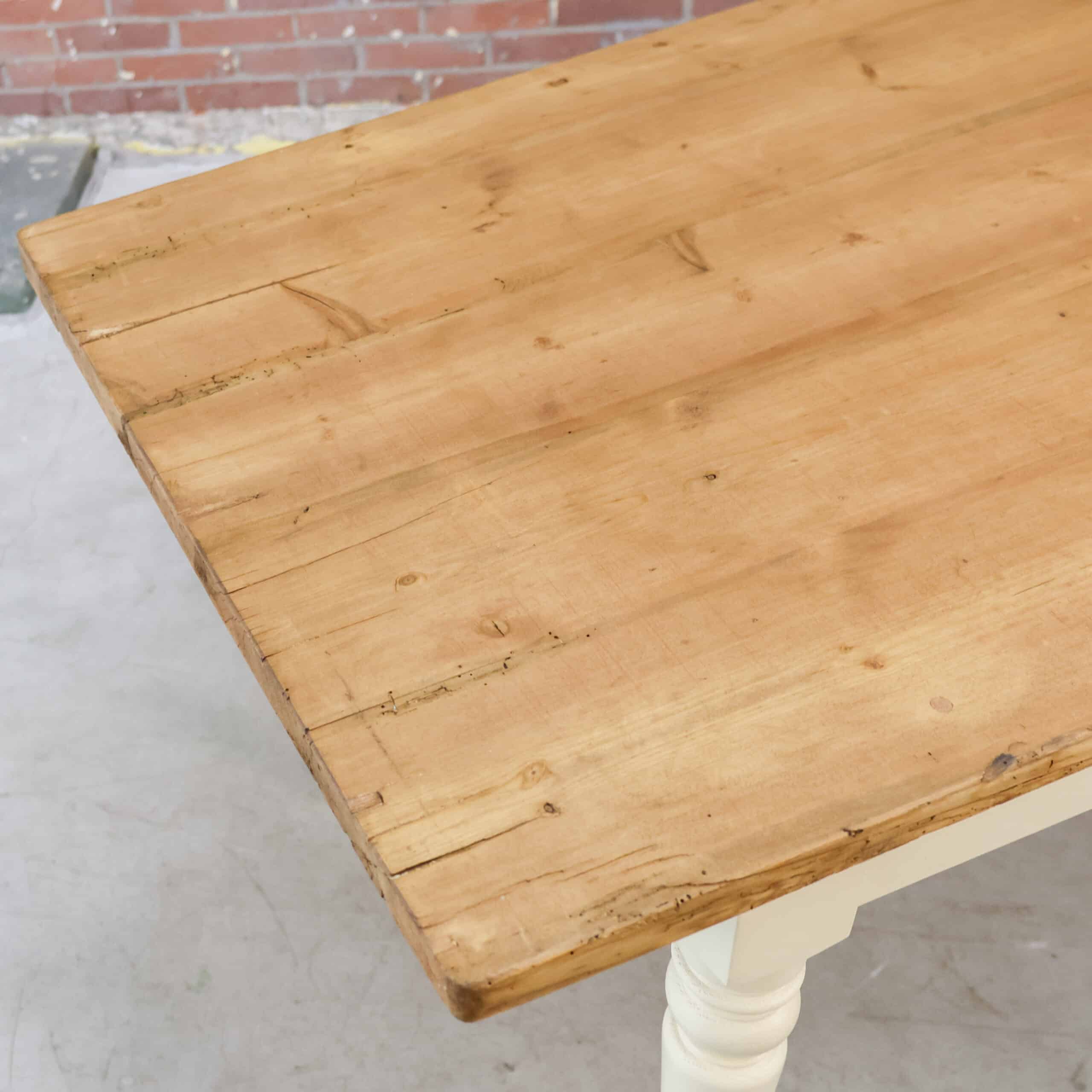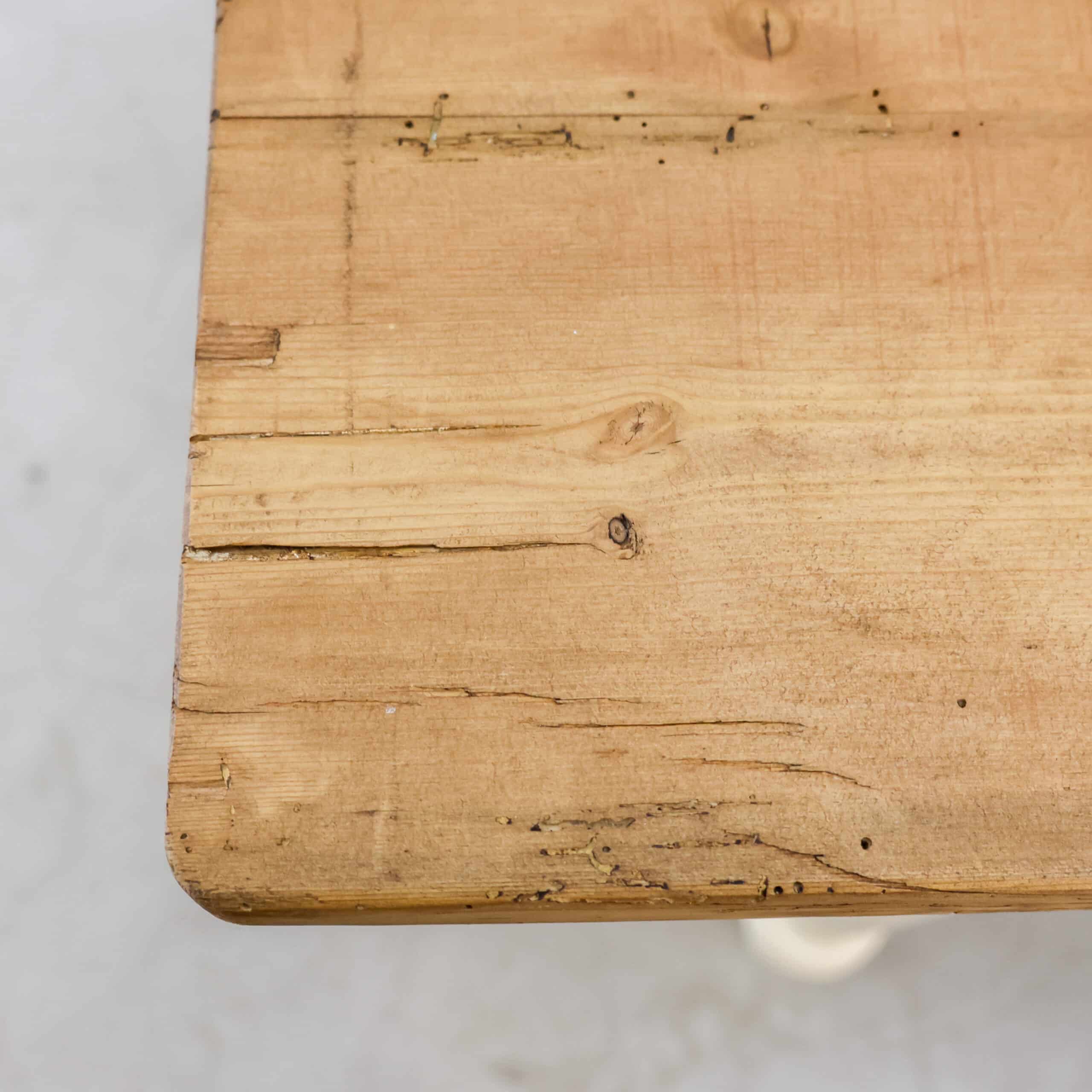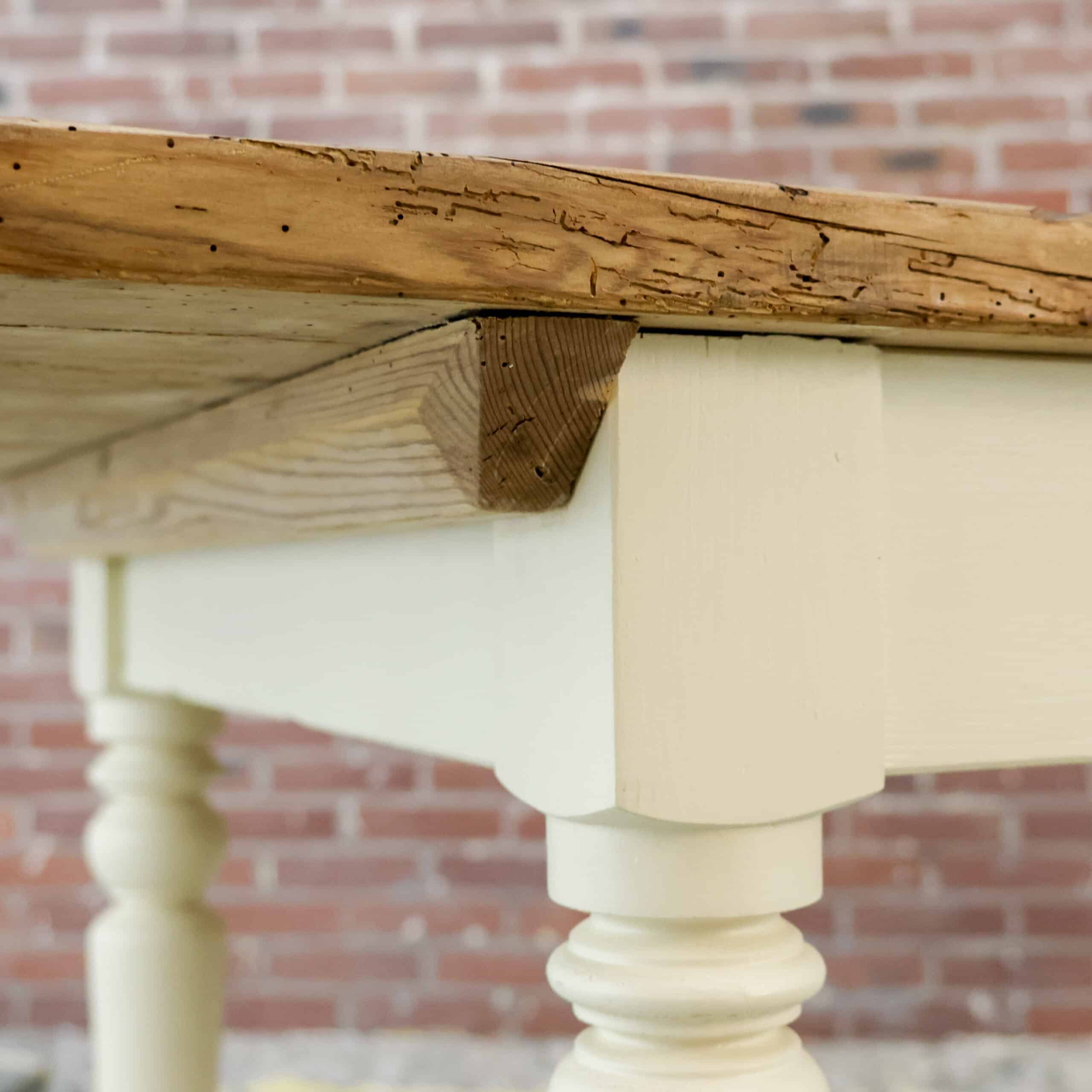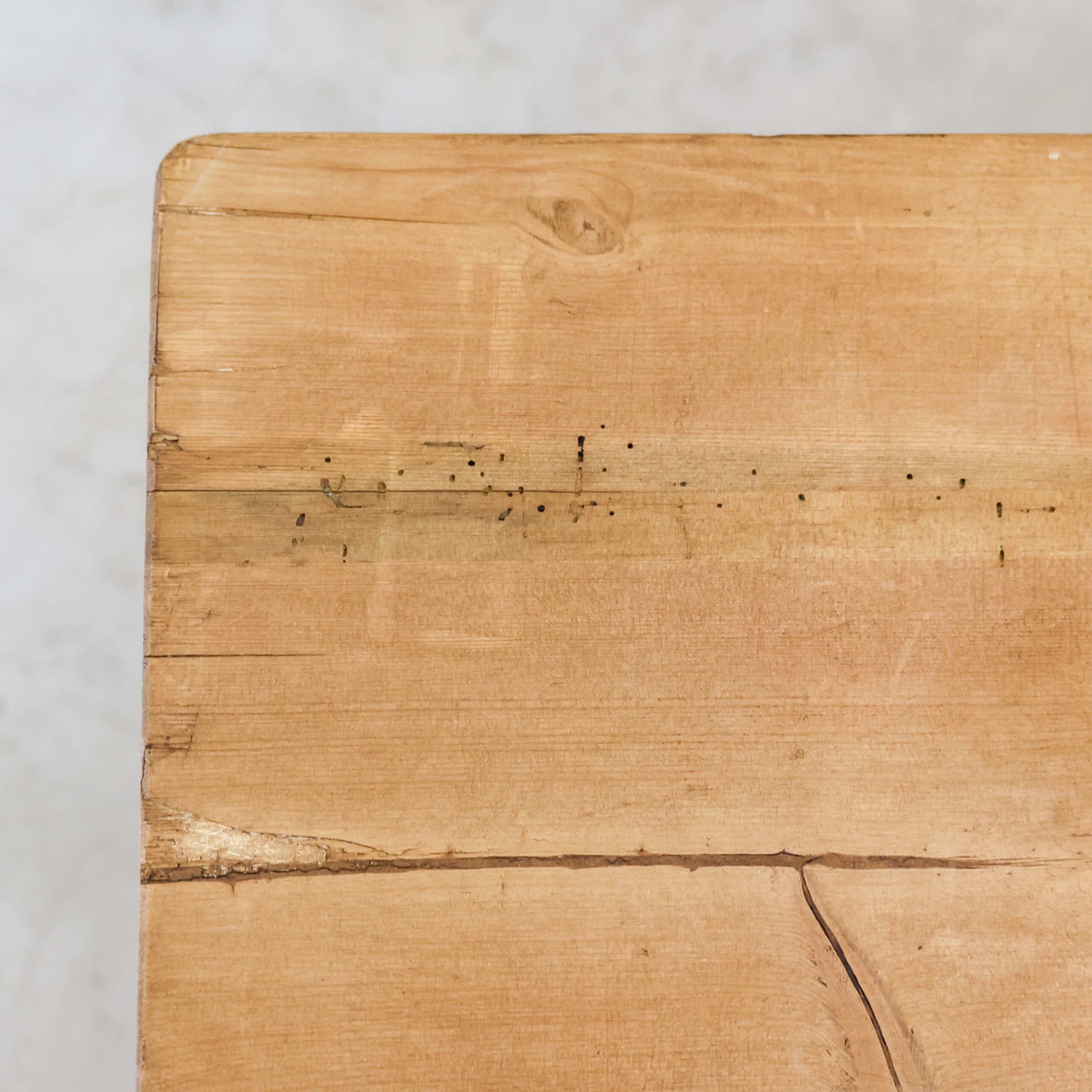 Sfeervolle landelijke eettafel met een licht houten onderstel en een oud houten blad. Perfect als keukentafel, werkplek of als pronkstuk in een landelijk interieur. Stevig, uniek en met een verhaal.