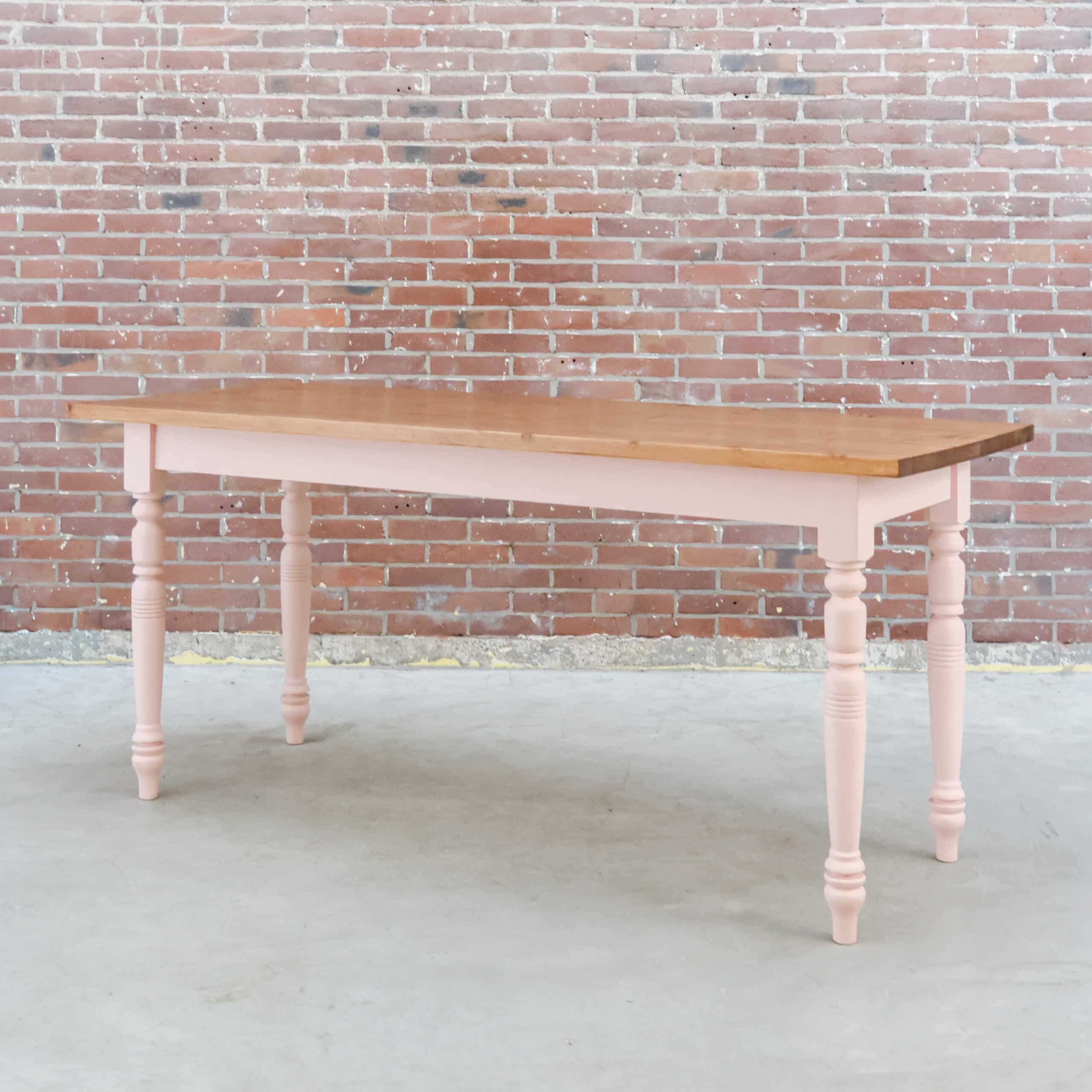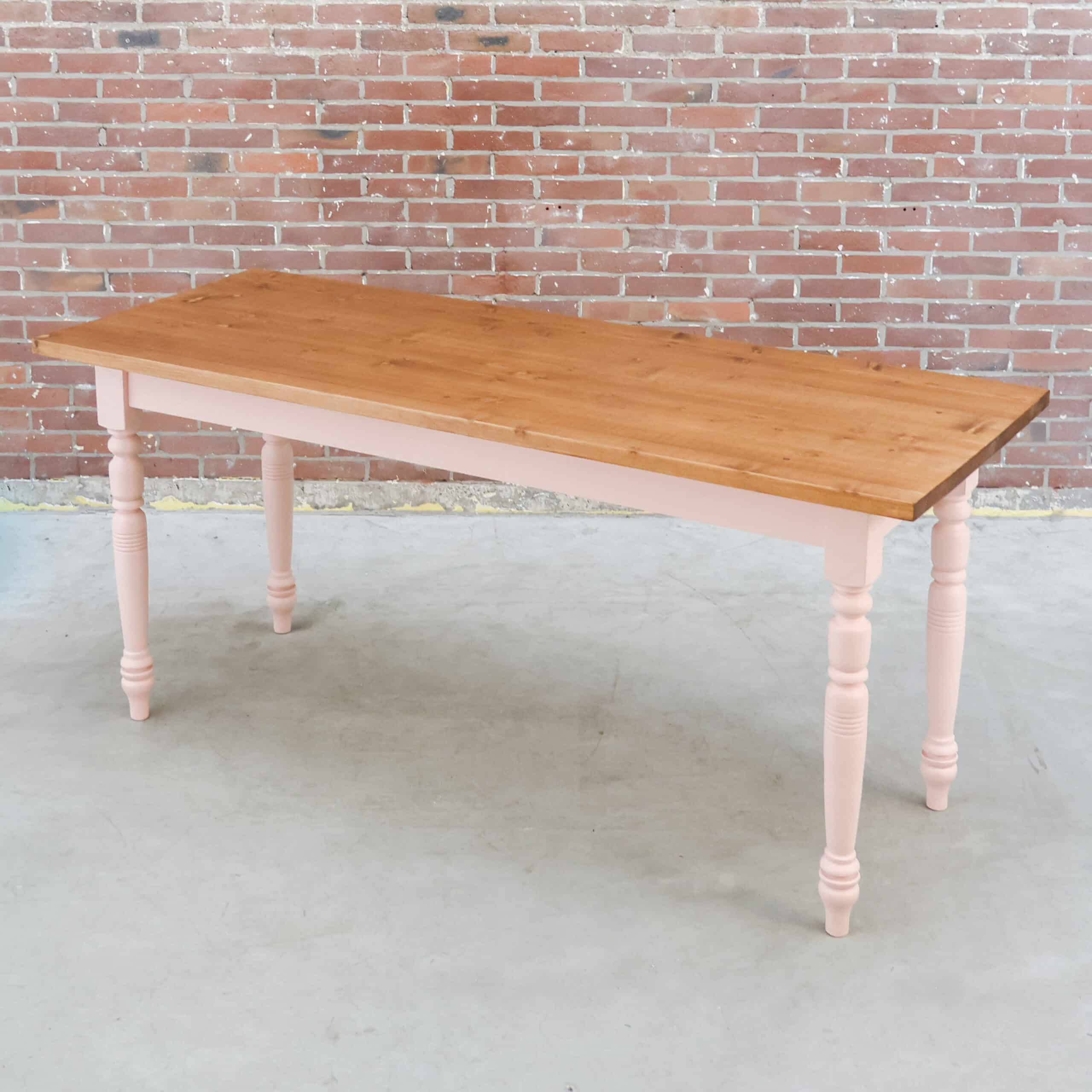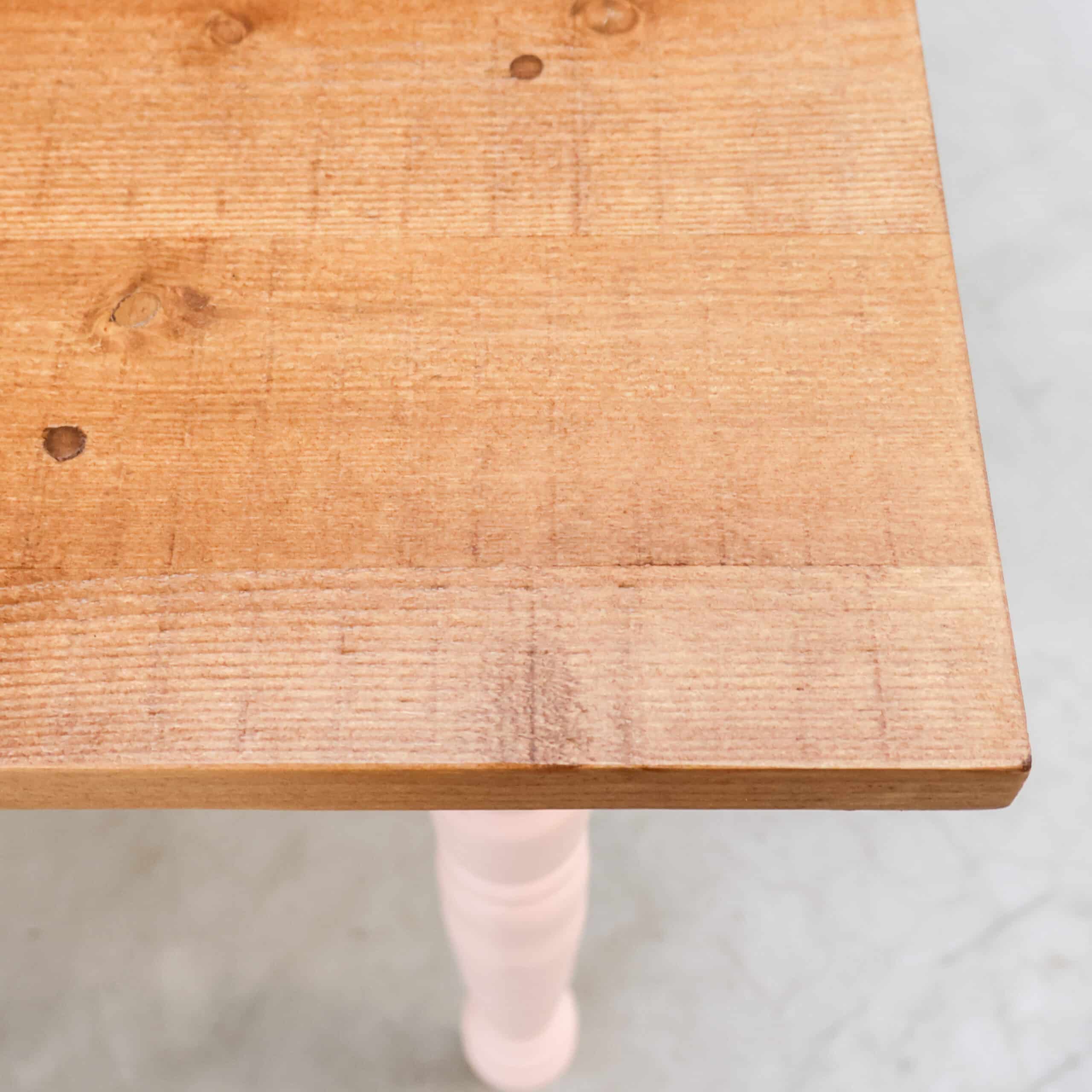 Sfeervolle landelijke eettafel met een licht roze houten onderstel en een houten blad. Perfect als keukentafel, werkplek of als pronkstuk in een landelijk interieur. Stevig, uniek en met een verhaal.