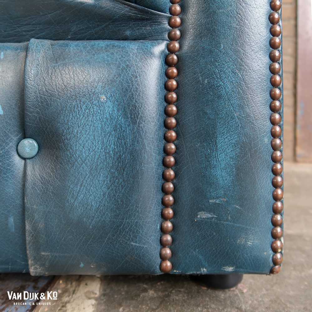Een blauwe leren bank is onmisbaar voor elke mancave! Deze 3-zits bank met chesterfield look is tijdloos en past bijna bij elke interieur. En hij zit ook nog heerlijk! Het leer is door de jaren heen wel sfeervol verweerd.
