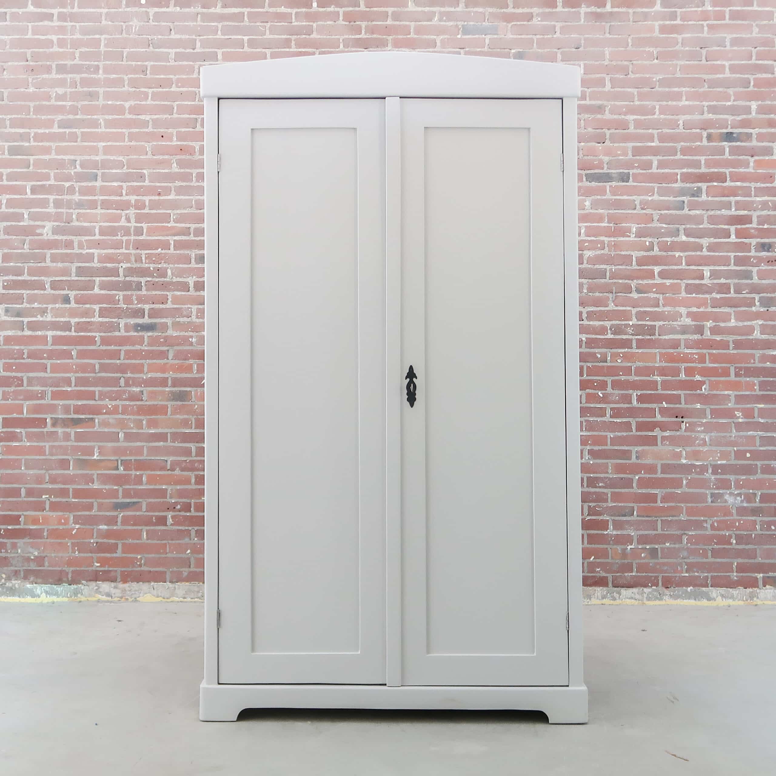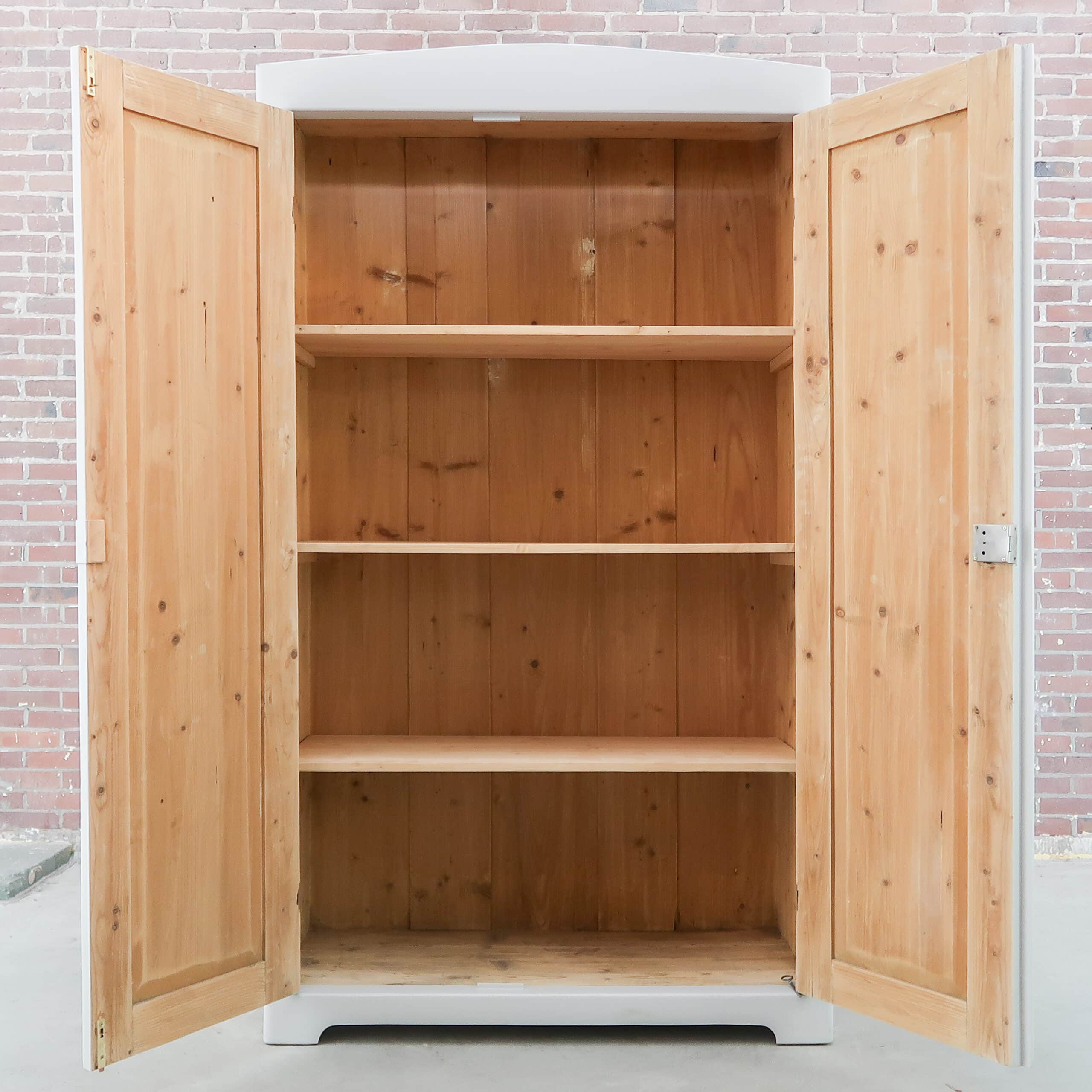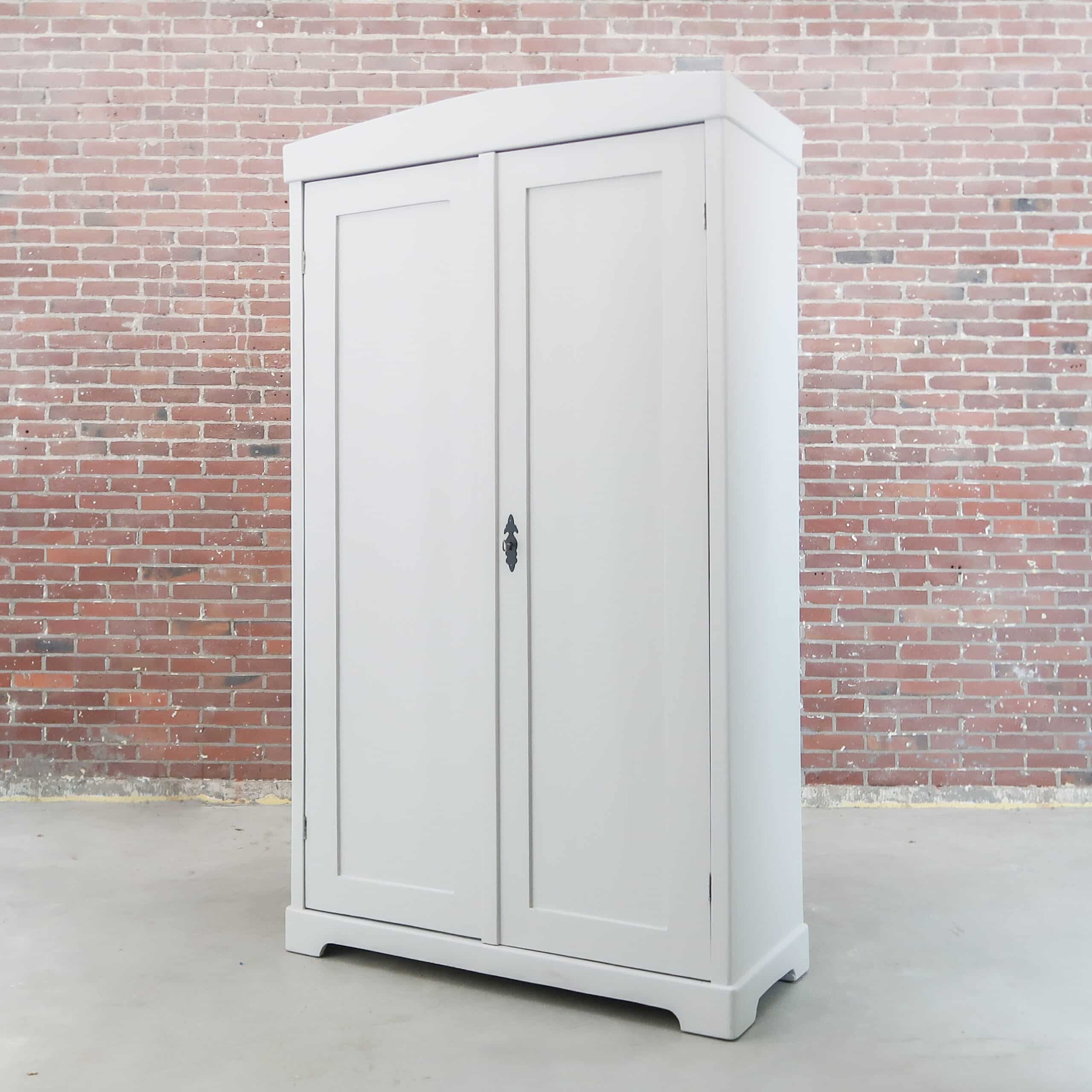 Wederom een prachtige lichtgrijze kledingkast uit Hongarije! We hebben haar opgeknapt waar nodig, zo heeft ze naast nieuwe planken ook een zacht grijs kleurtje gekregen.