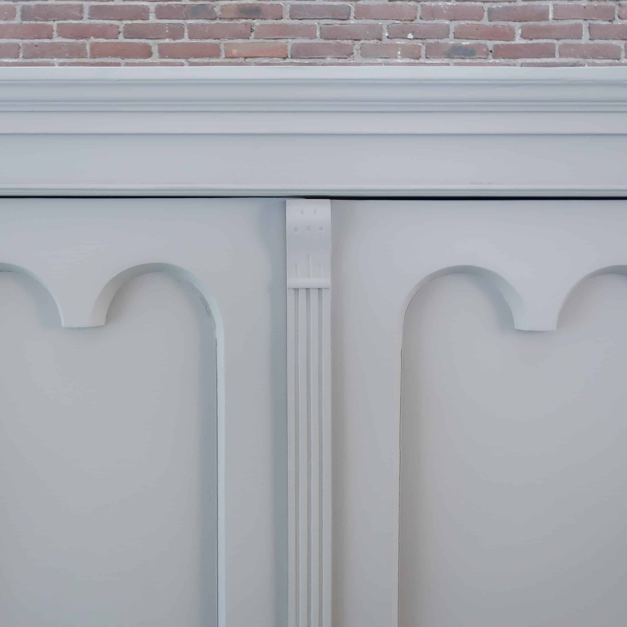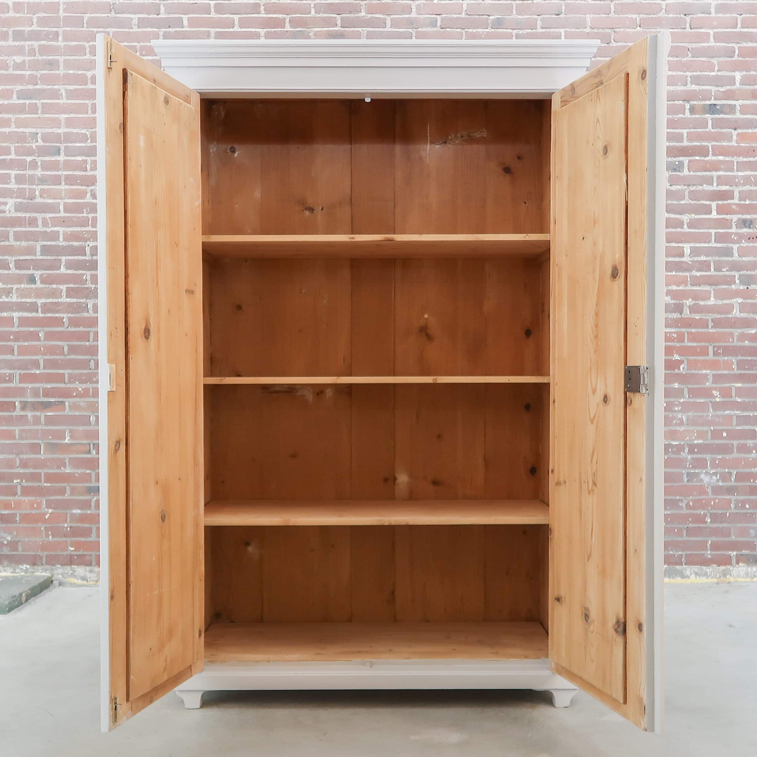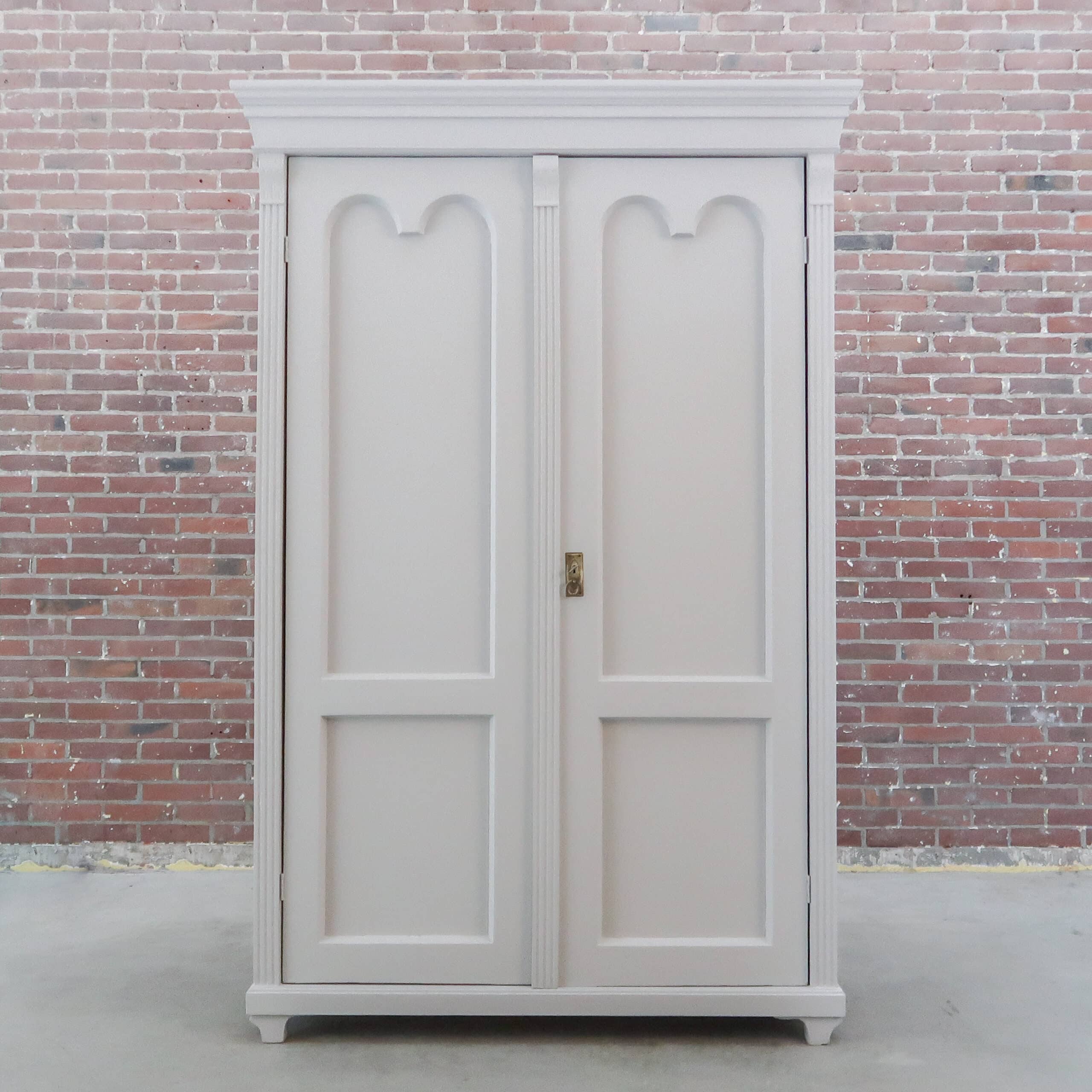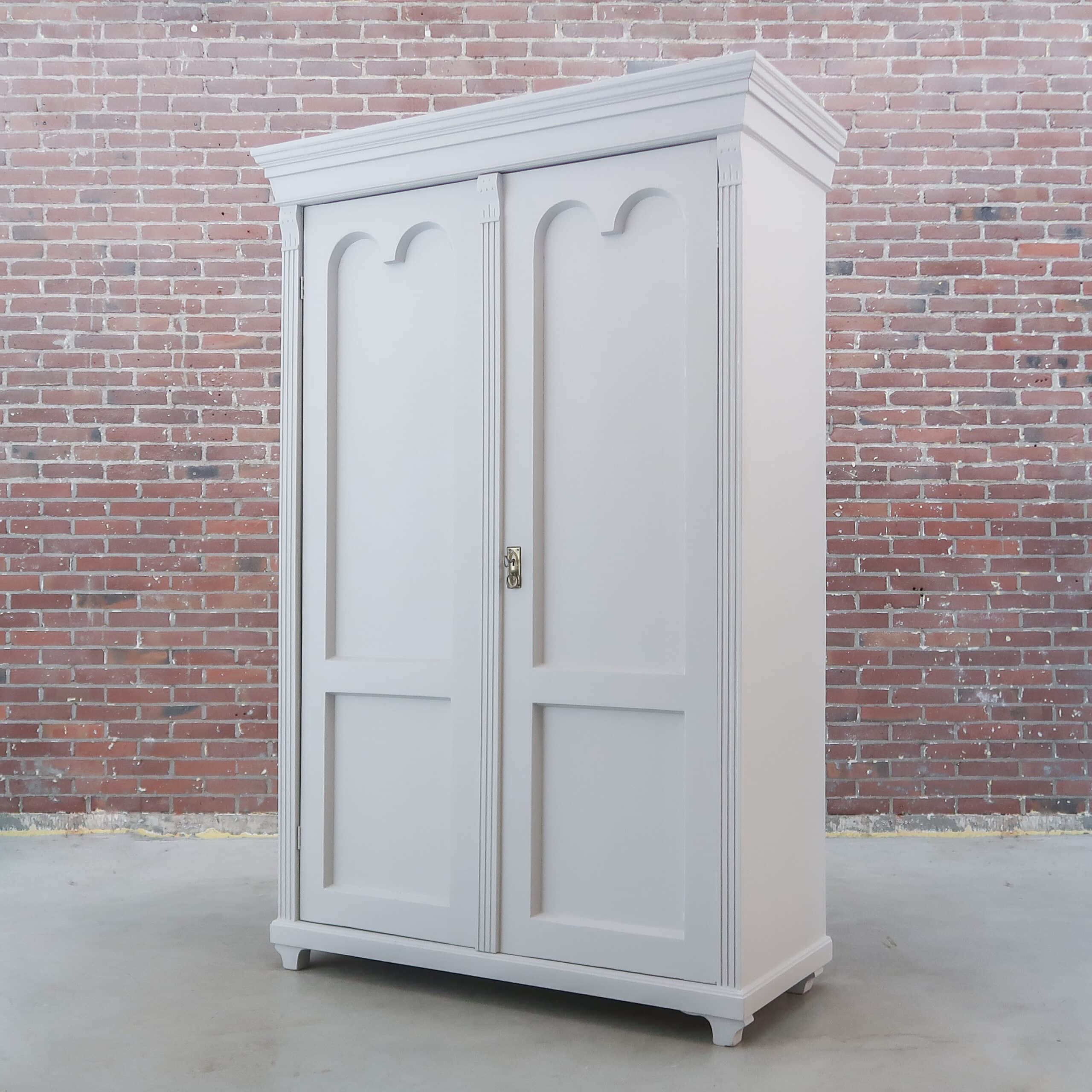 Wederom een prachtige lichtgrijze kledingkast uit Hongarije! We hebben haar opgeknapt waar nodig, zo heeft ze naast nieuwe planken ook een zacht grijs kleurtje gekregen.