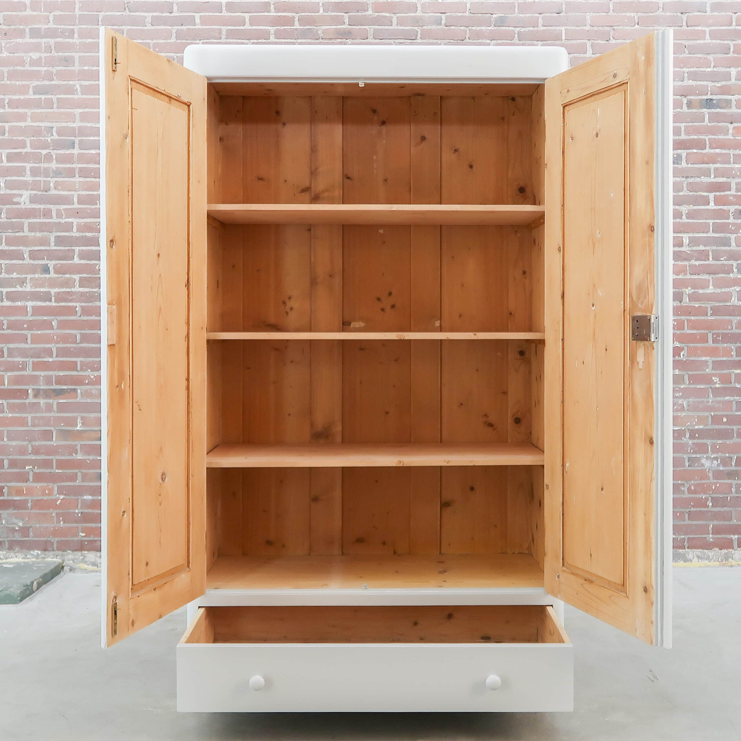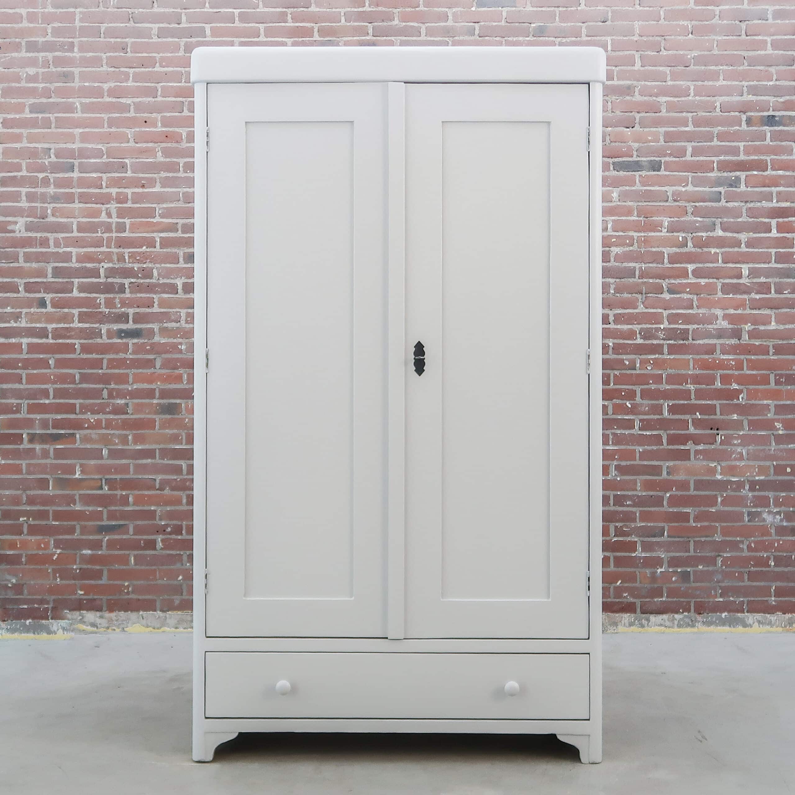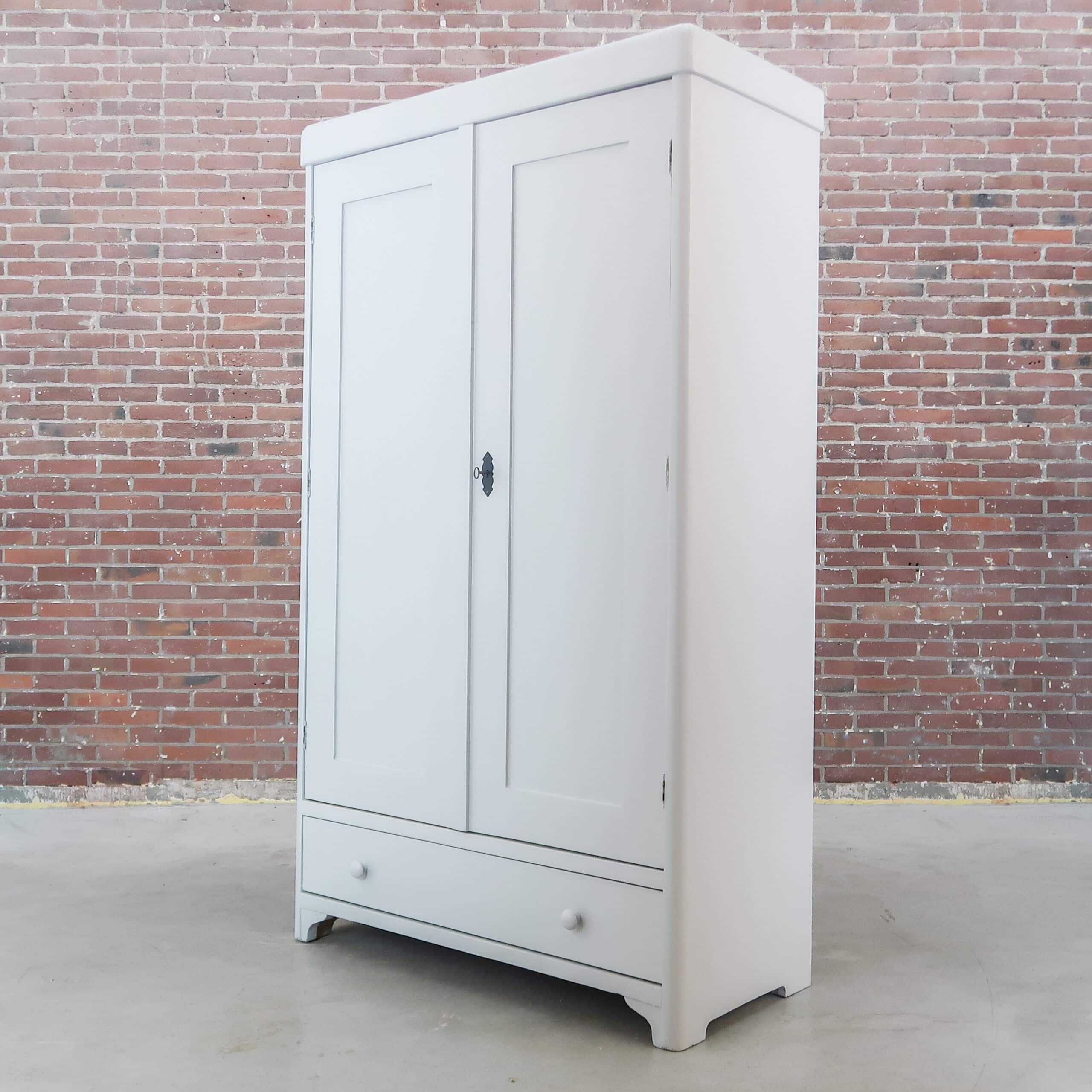 Wederom een prachtige lichtgrijze kledingkast uit Hongarije! We hebben haar opgeknapt waar nodig, zo heeft ze naast nieuwe planken ook een zacht grijs kleurtje gekregen.