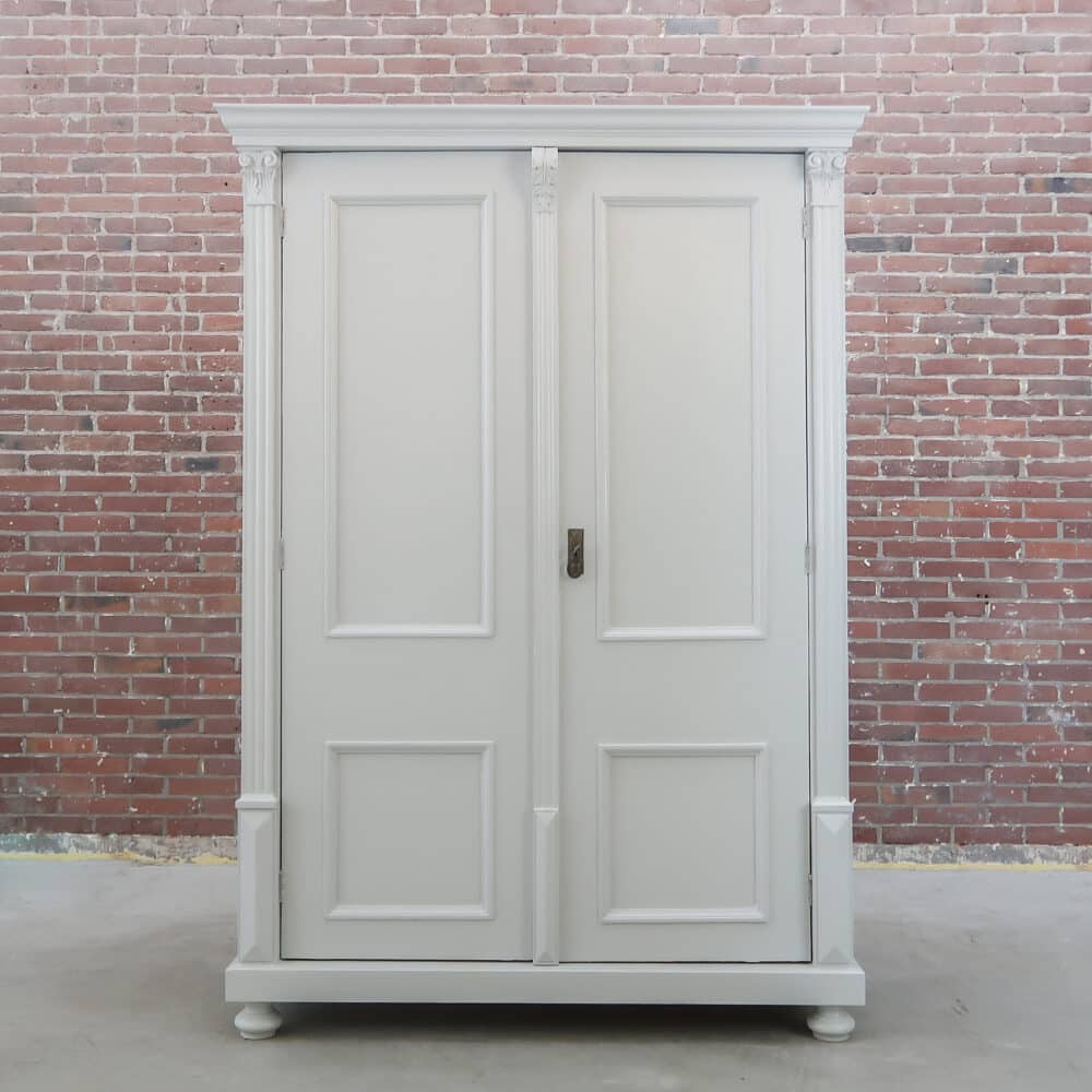 Wederom een prachtige lichtgrijze kledingkast uit Hongarije! We hebben haar opgeknapt waar nodig, zo heeft ze naast nieuwe planken ook een zacht grijs kleurtje gekregen.