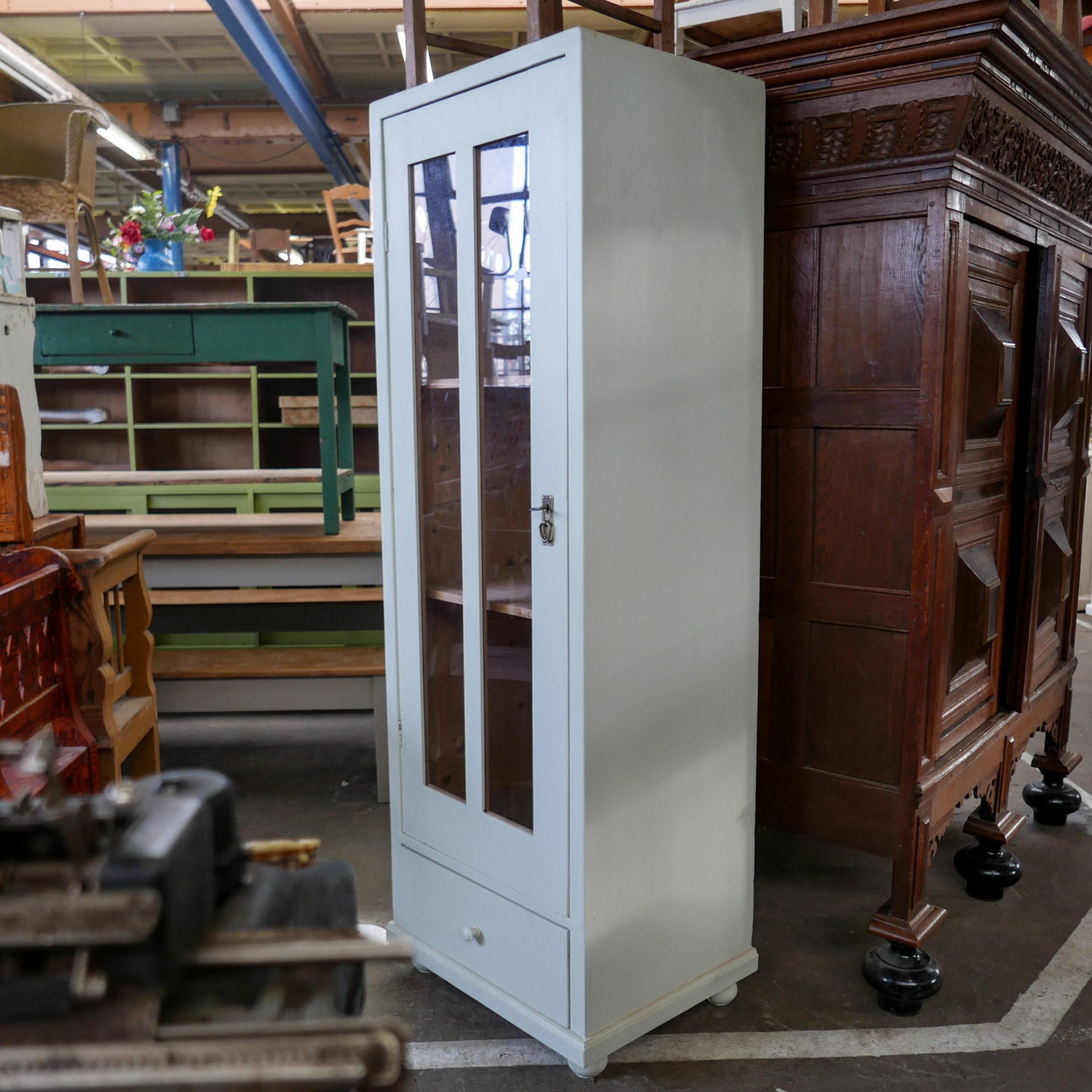 Deze vintage vitrinekast is gemaakt van hout en lichtgrijs. De kast heeft één deur, die naar links opent, met binnenin twee nieuwe planken. De deur heeft twee prachtig uitgesneden ramen van glas. Onder de deur een lade met een houten knop. De kast is af te sluiten met een slot.