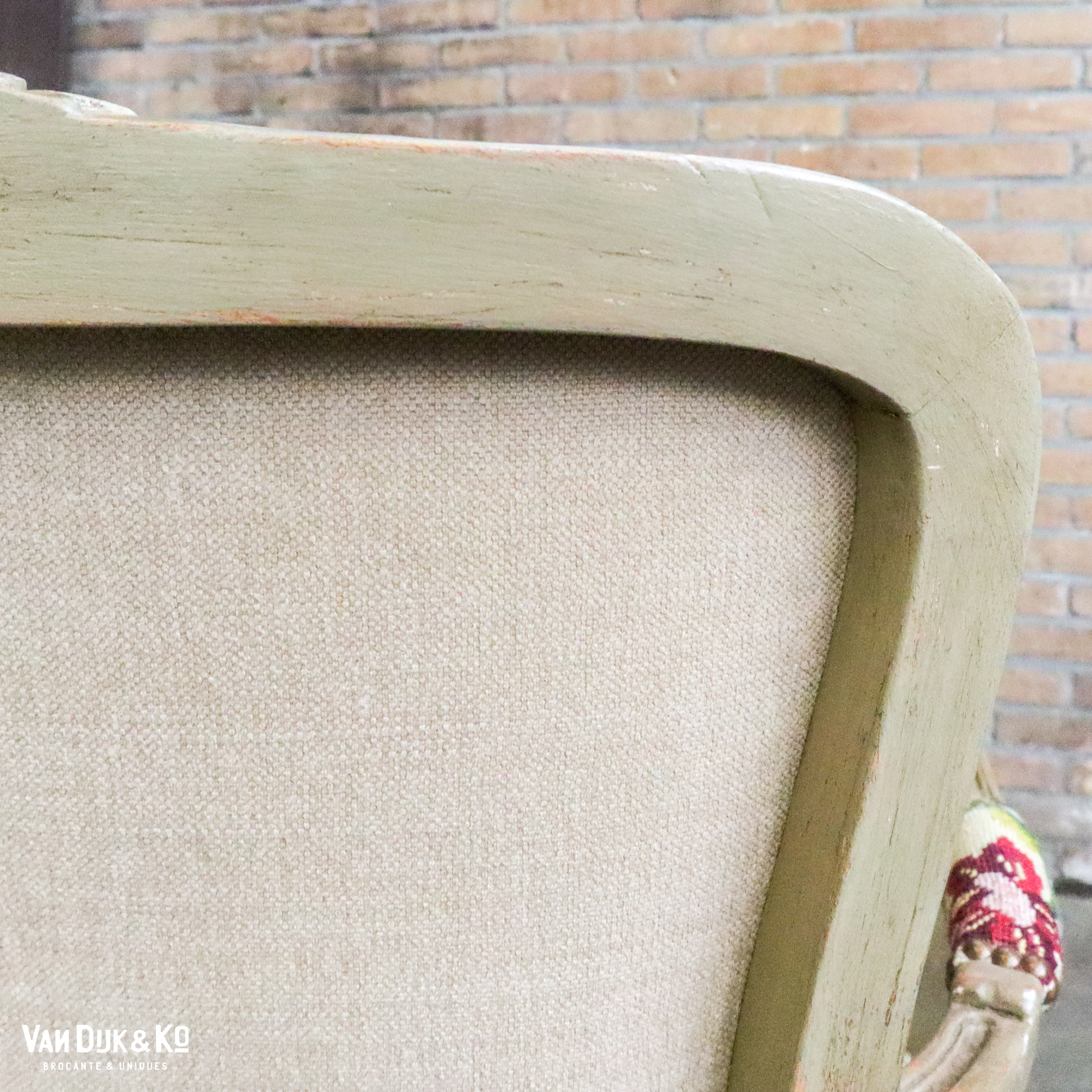 Deze mooie Louis XV stoel heeft prachtige geborduurde bloemen! Ze is nog in een prima vintage staat. De katoenen geborduurde stof is afgezet met kopspijkers. Het houten frame van de stoel heeft mooie houtsnede details! Deze rococo fauteuil fleurt elke kamer in huis op.