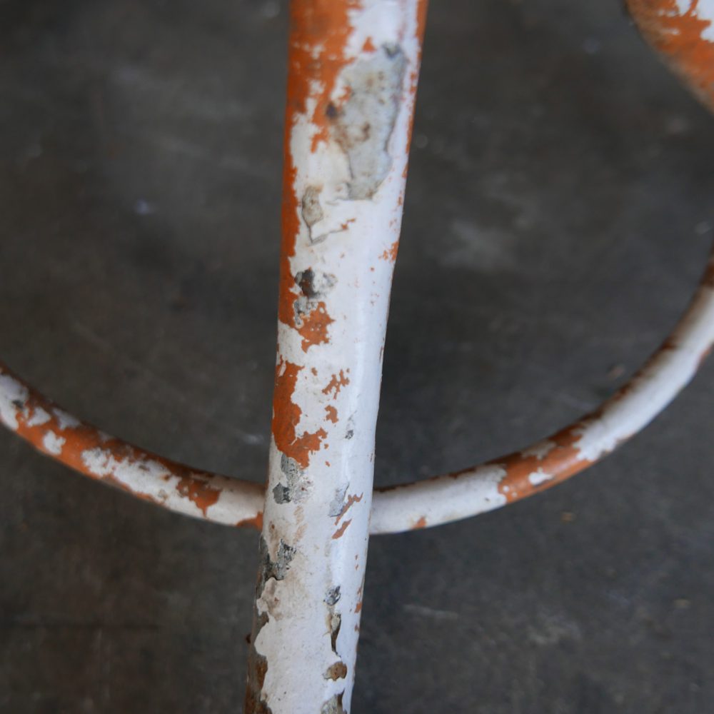 Oranje zware metalen kapstok met krullentooi. De kapstok heeft een tooi met 12 haken en vertoont gebruikerssporen op zijn poten.