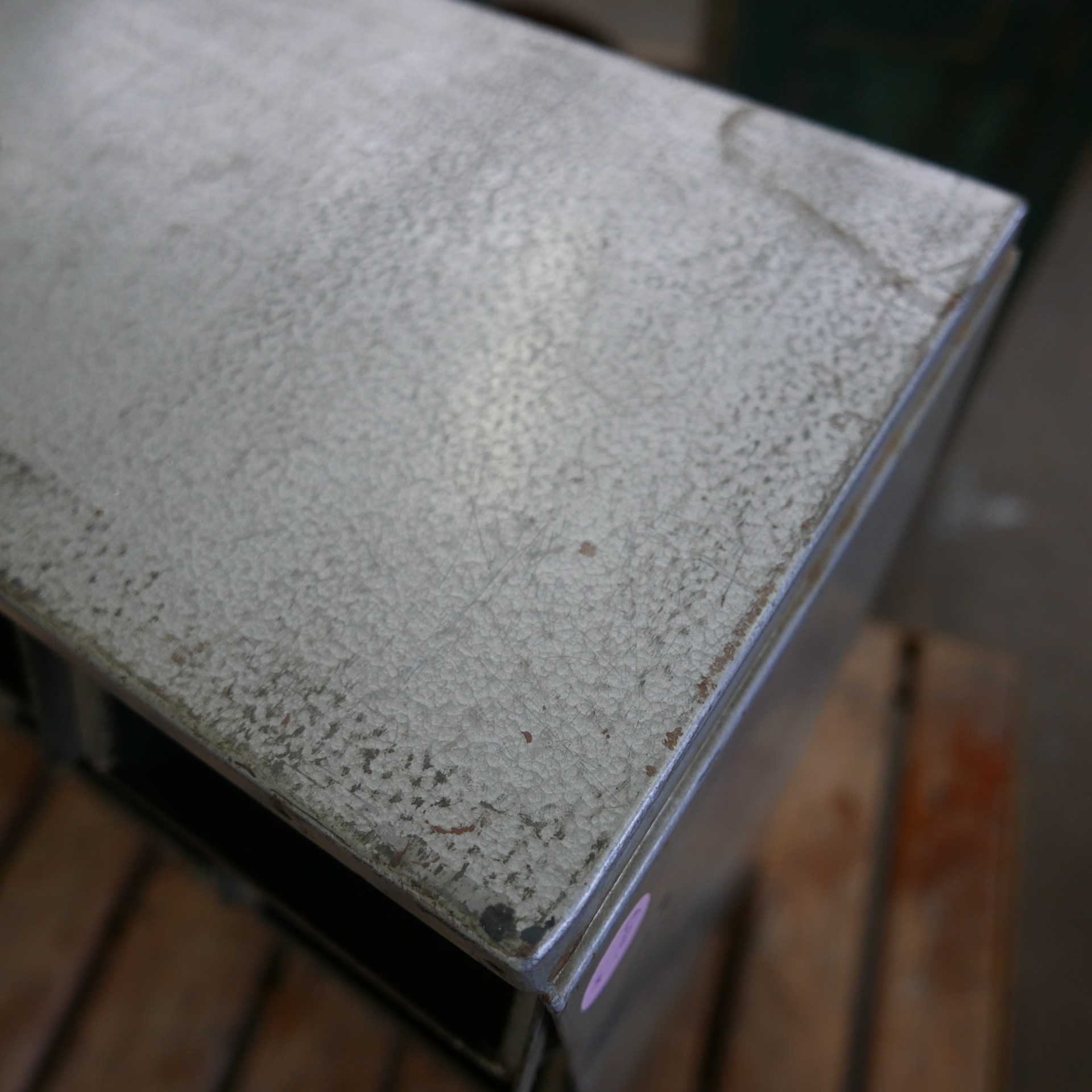 Prachtige industrieel grijs ladekastje gemaakt van metaal. De kast heeft zestien vakken gemaakt met grijpbakken.  De kast vertoont gebruikerssporen in de vorm van tape wat op sommige lades is geplakt.
