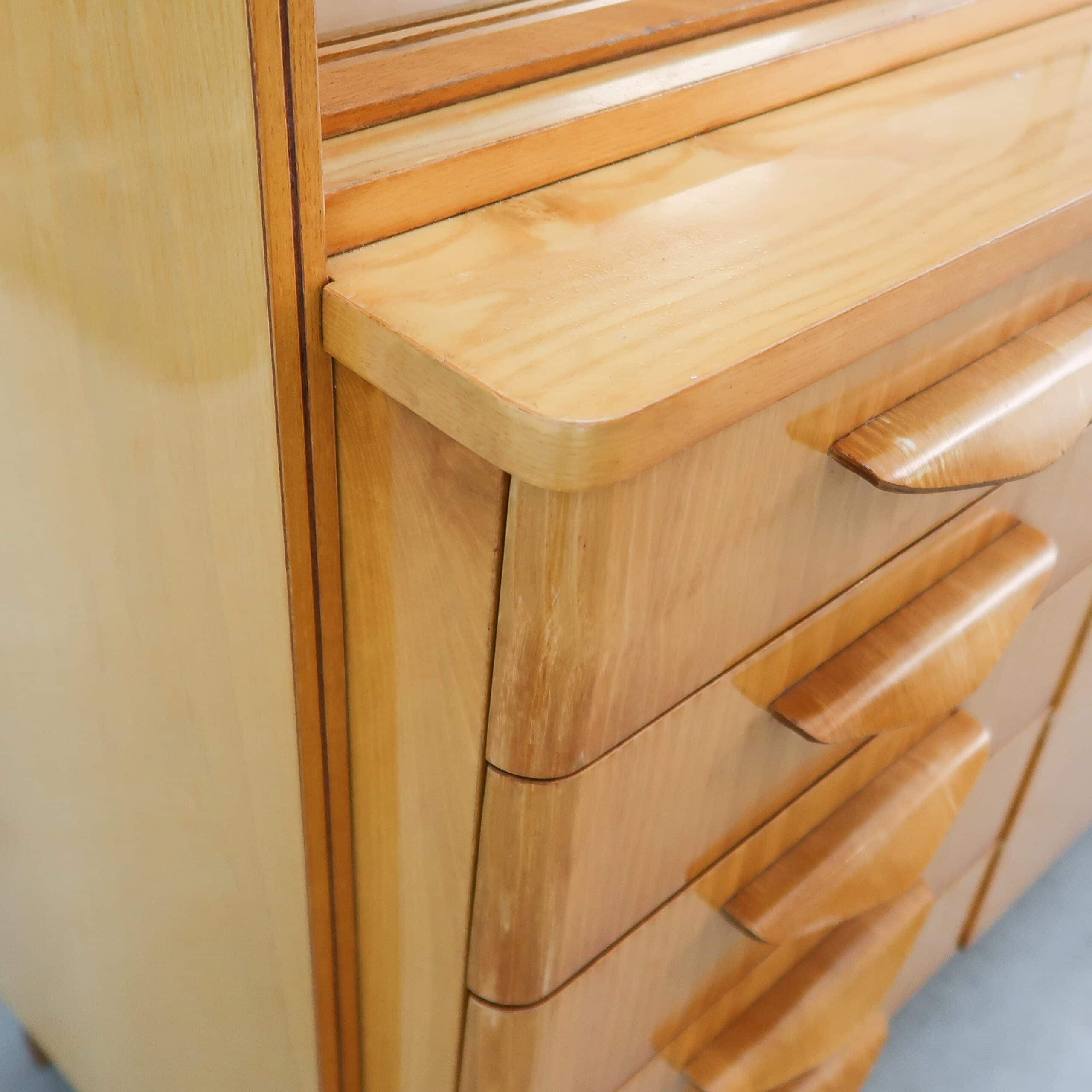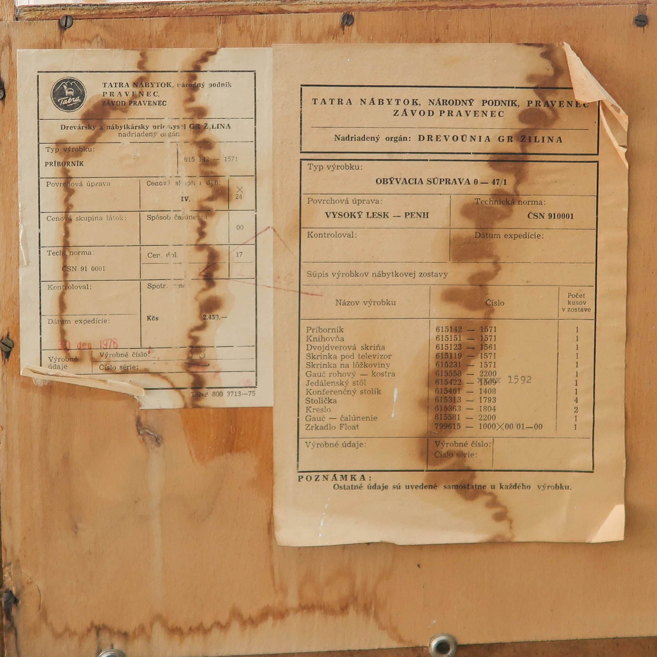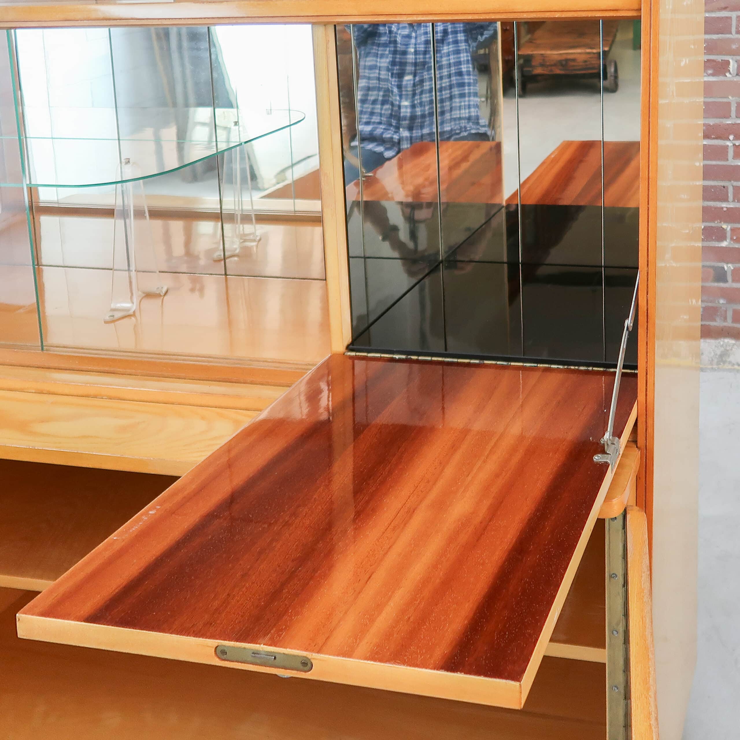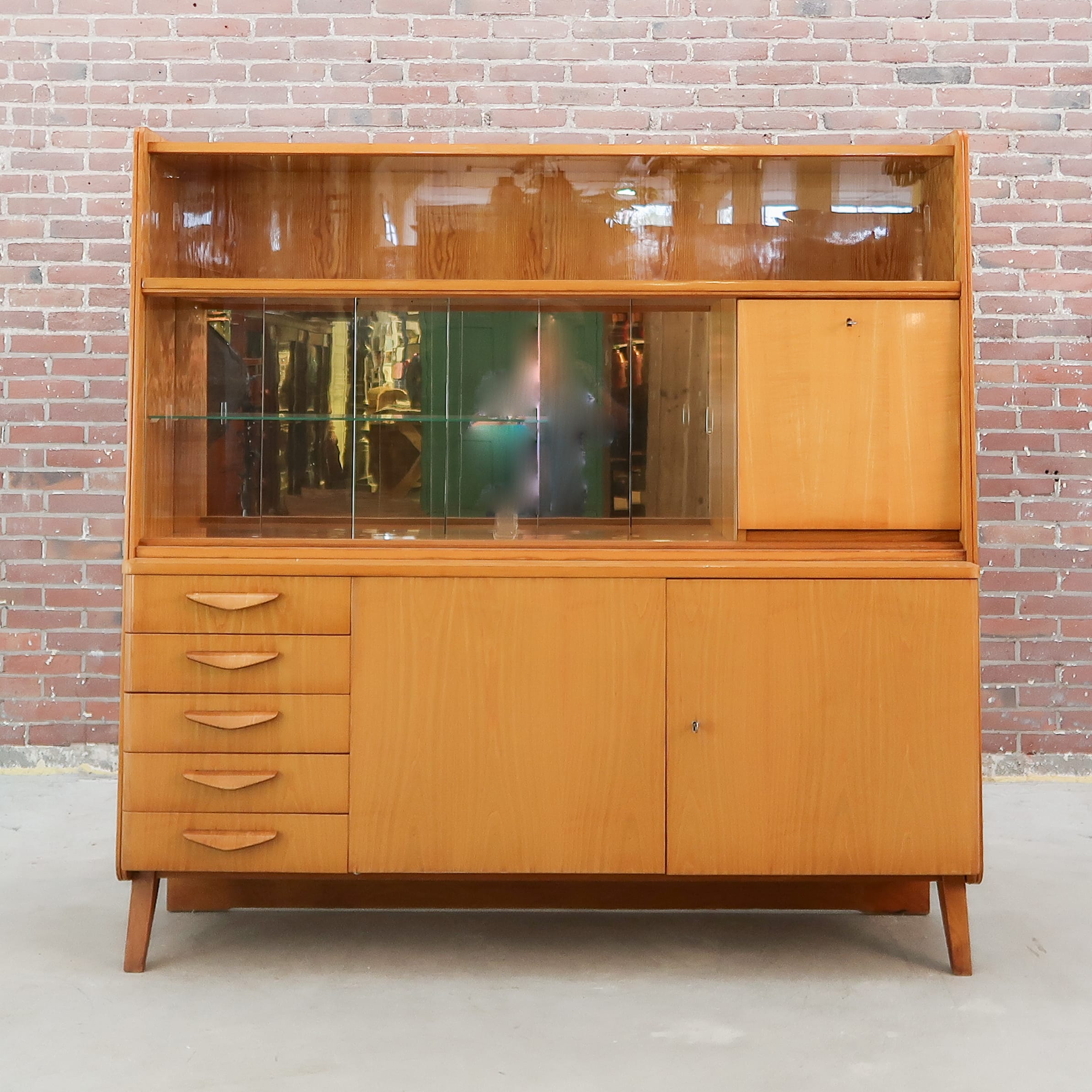 Zeldzame Tatra Nábytok buffetkast uit de jaren ’60, geproduceerd in Pravenec, Tsjechoslowakije. Hoogglans fineer met schuine poten en elegante handgrepen. De kast heeft een gespiegelde vitrine en een opvallende uitklapbare barplank. Mooi vintage stuk met karakter en subtiele gebruikssporen.