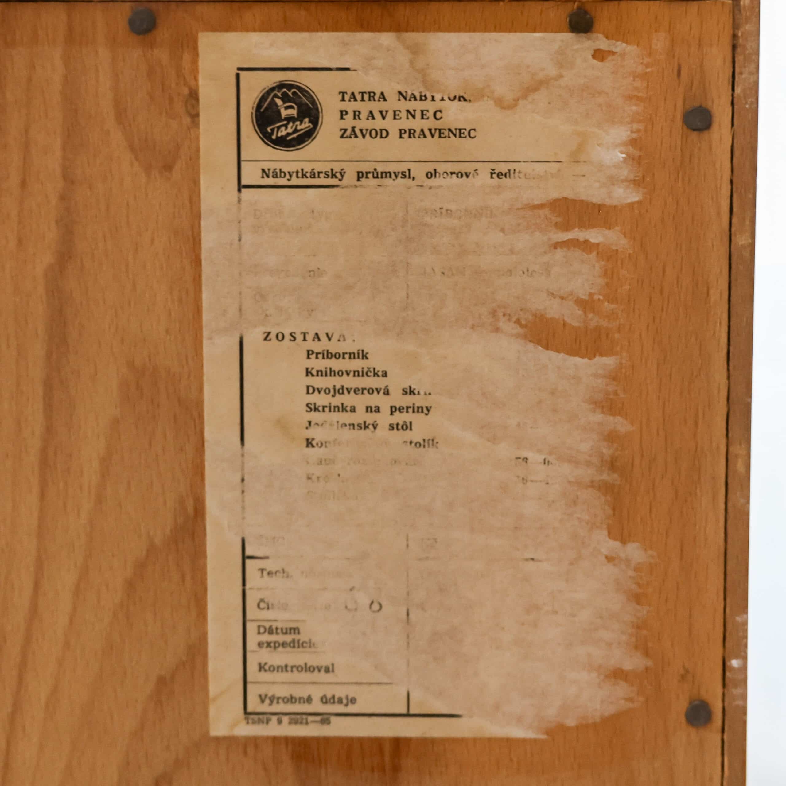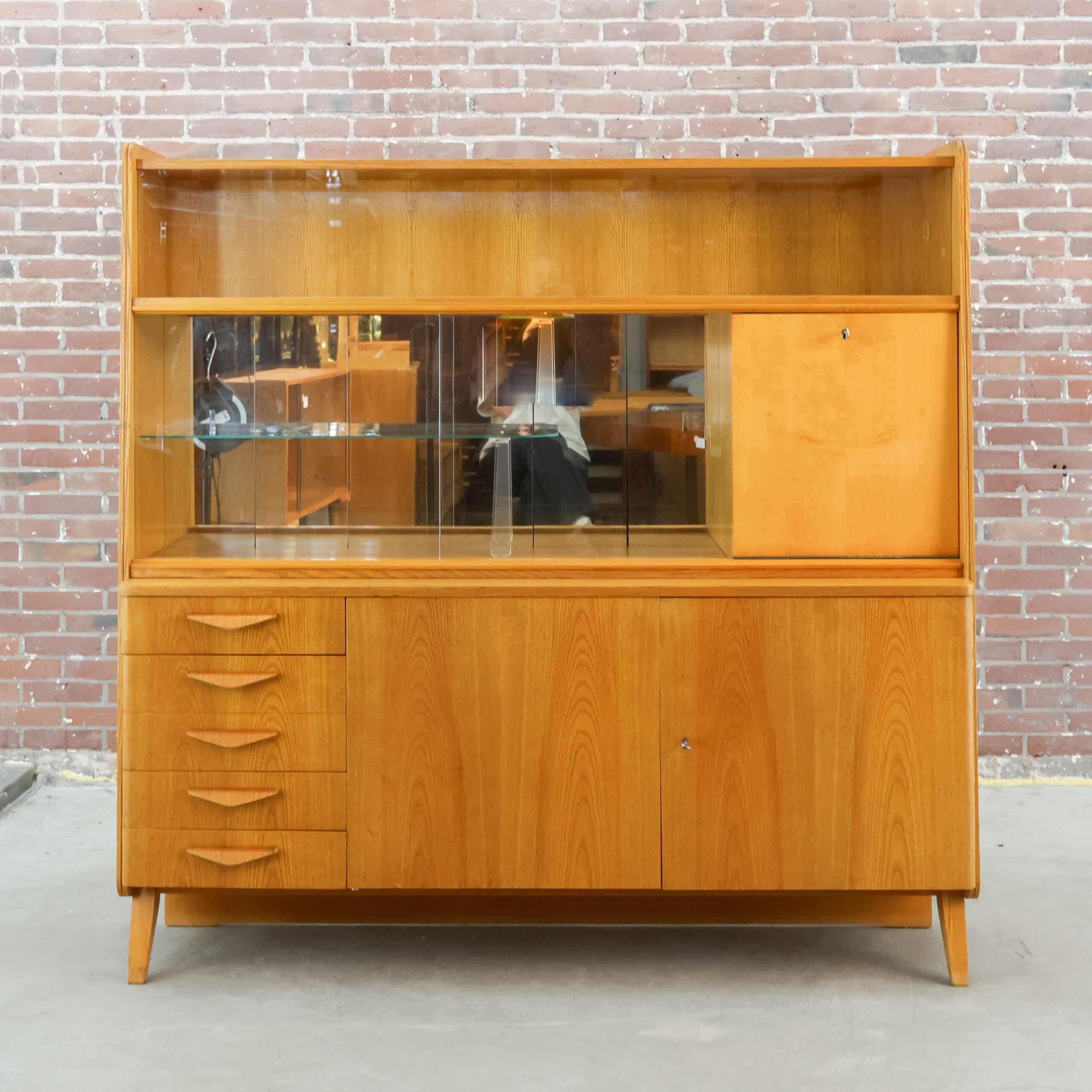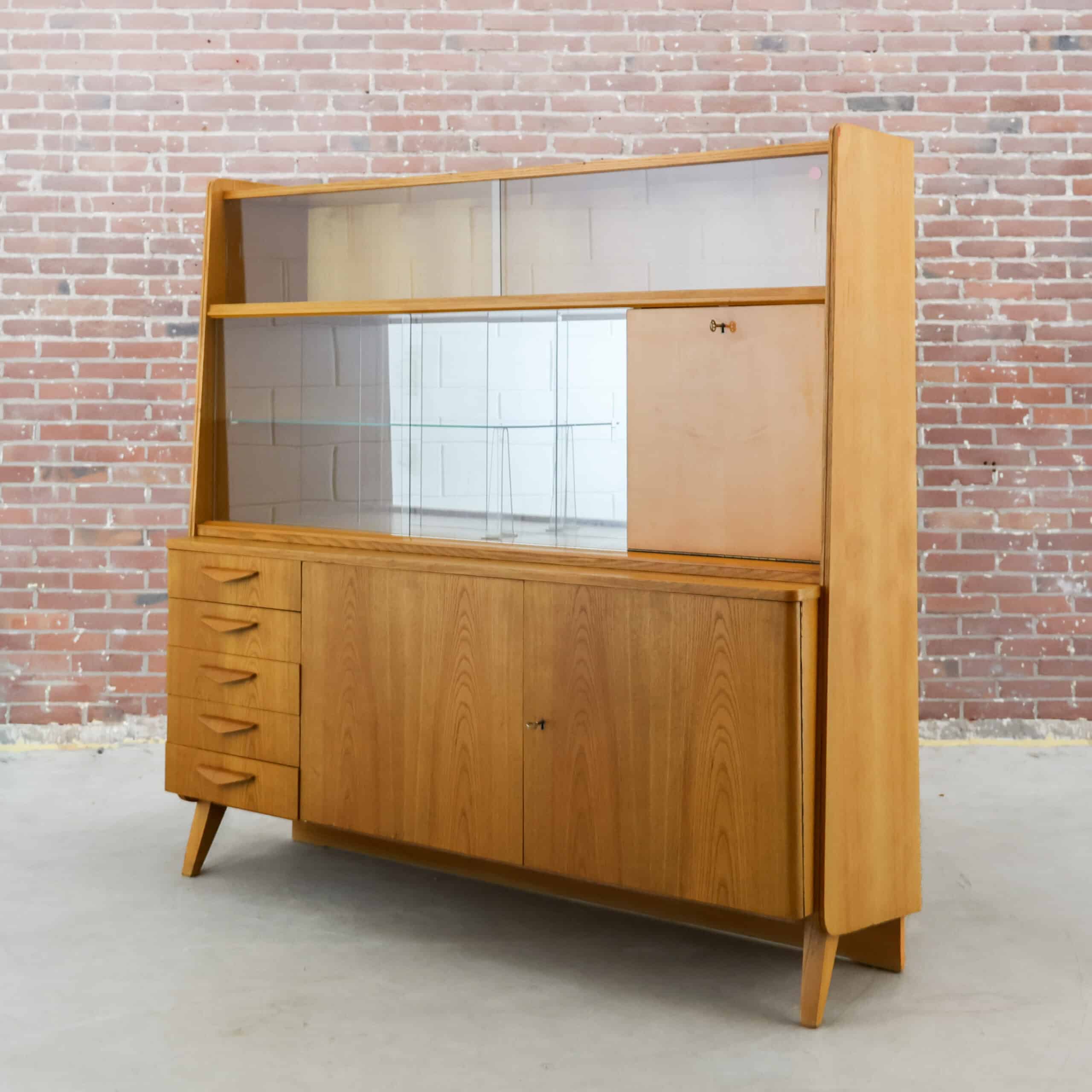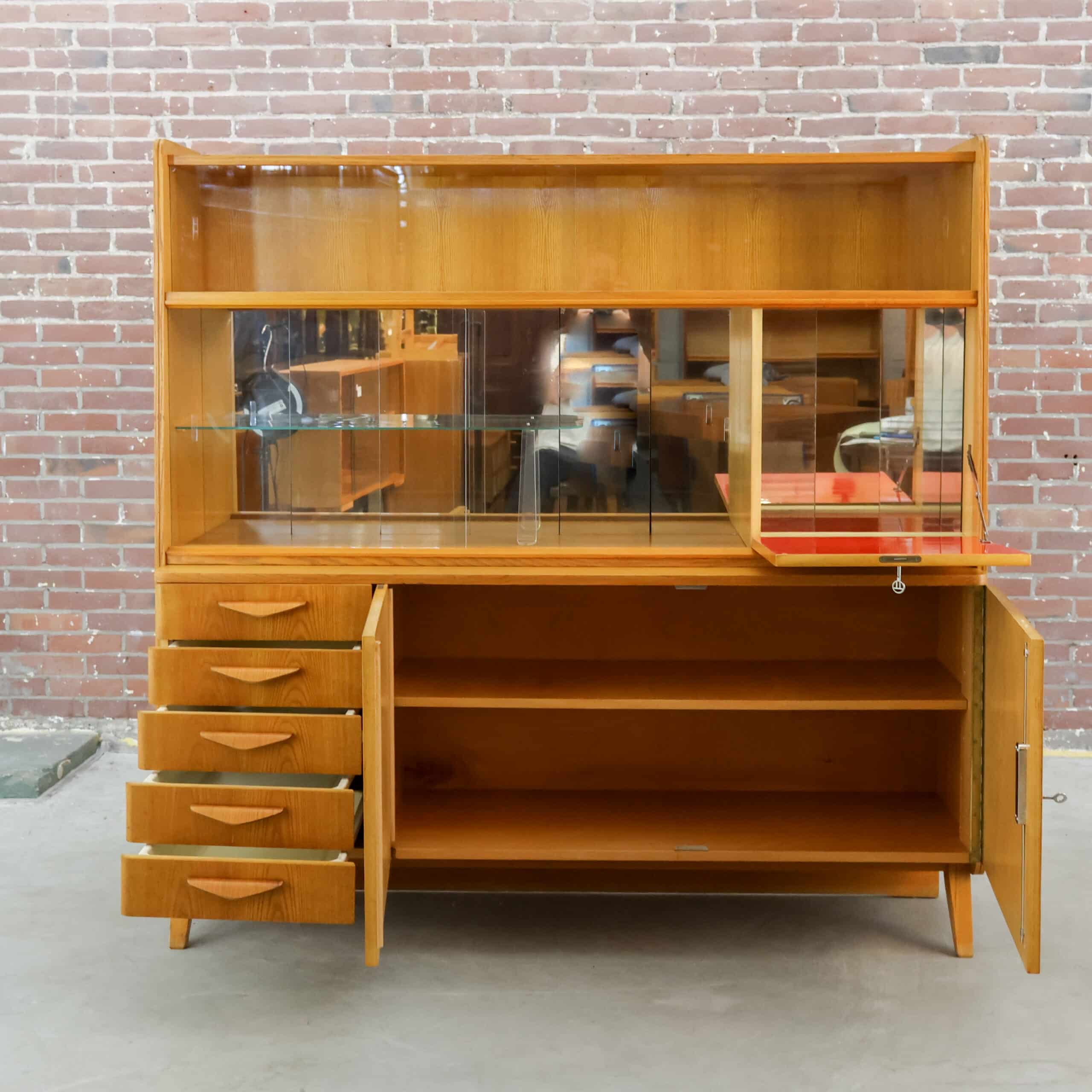 Mooie buffetkast uit de jaren ‘60 van Tatra Nábytok geproduceerd in Pravenec, Tsjechoslowakije. Hoogglans fineer met schuine poten en elegante handgrepen. De kast heeft een gespiegelde vitrine en een opvallende uitklapbare barplank. Bijzonder vintage stuk met karakter en subtiele gebruikssporen. Perfect als barkast maar ook als boekenkast.