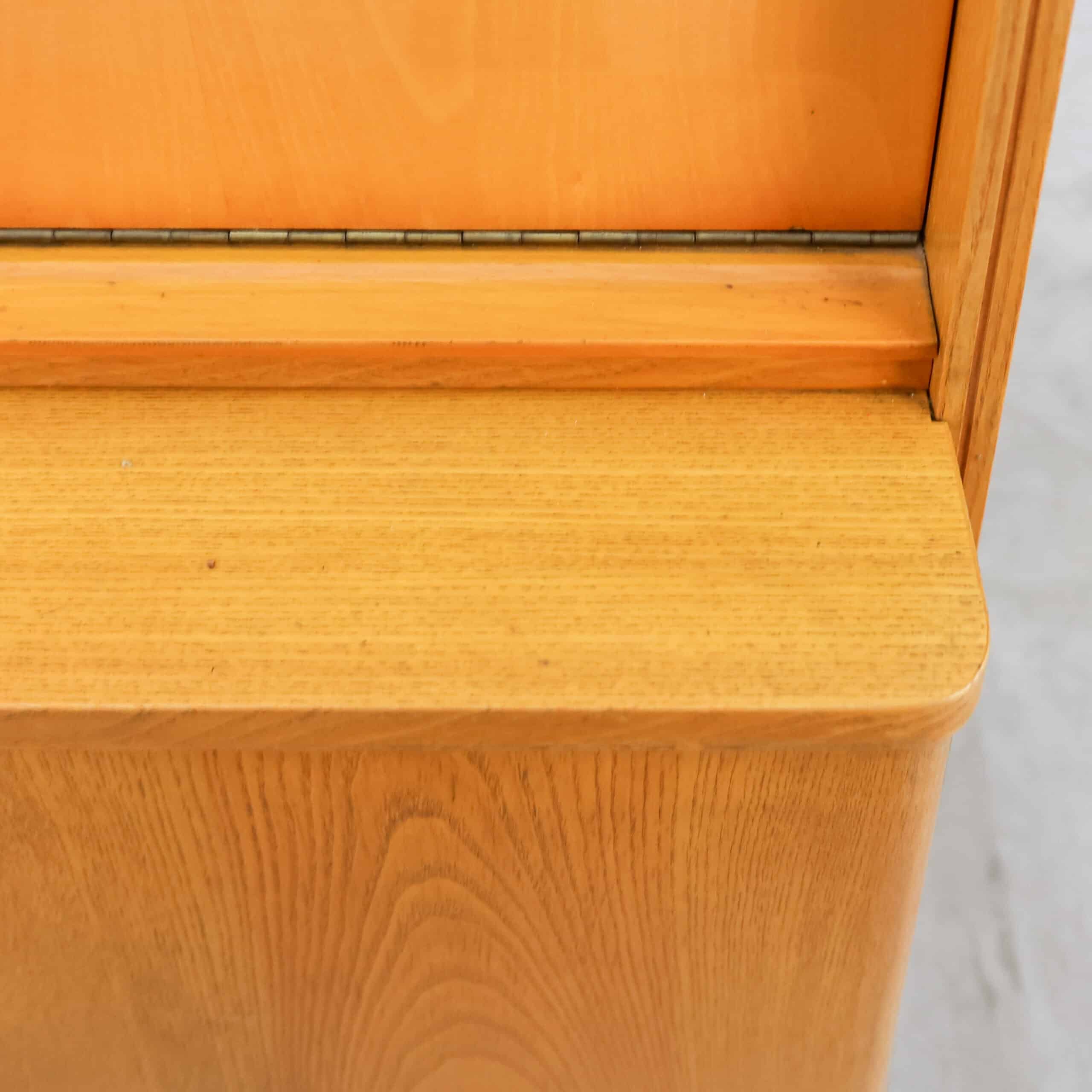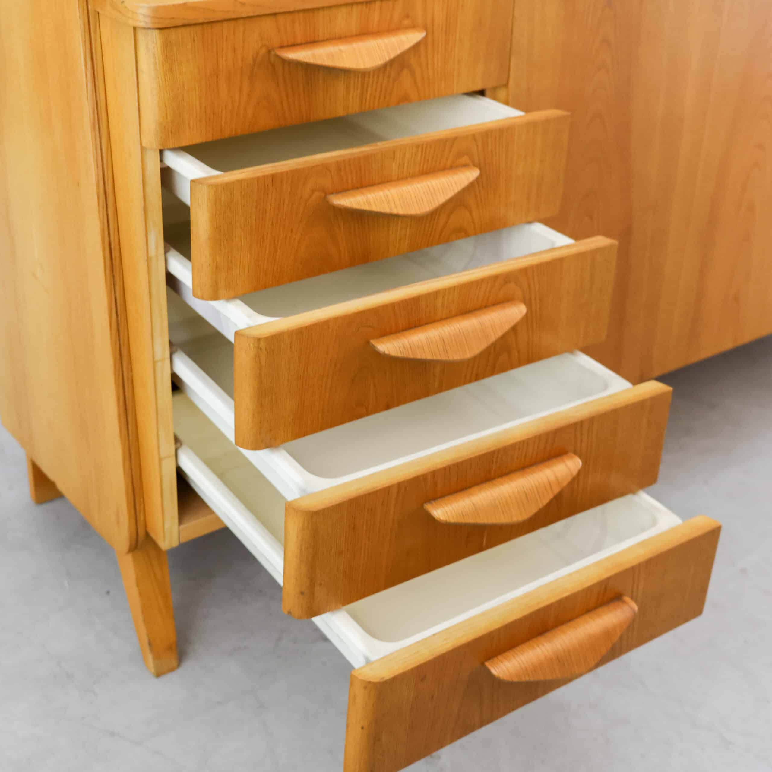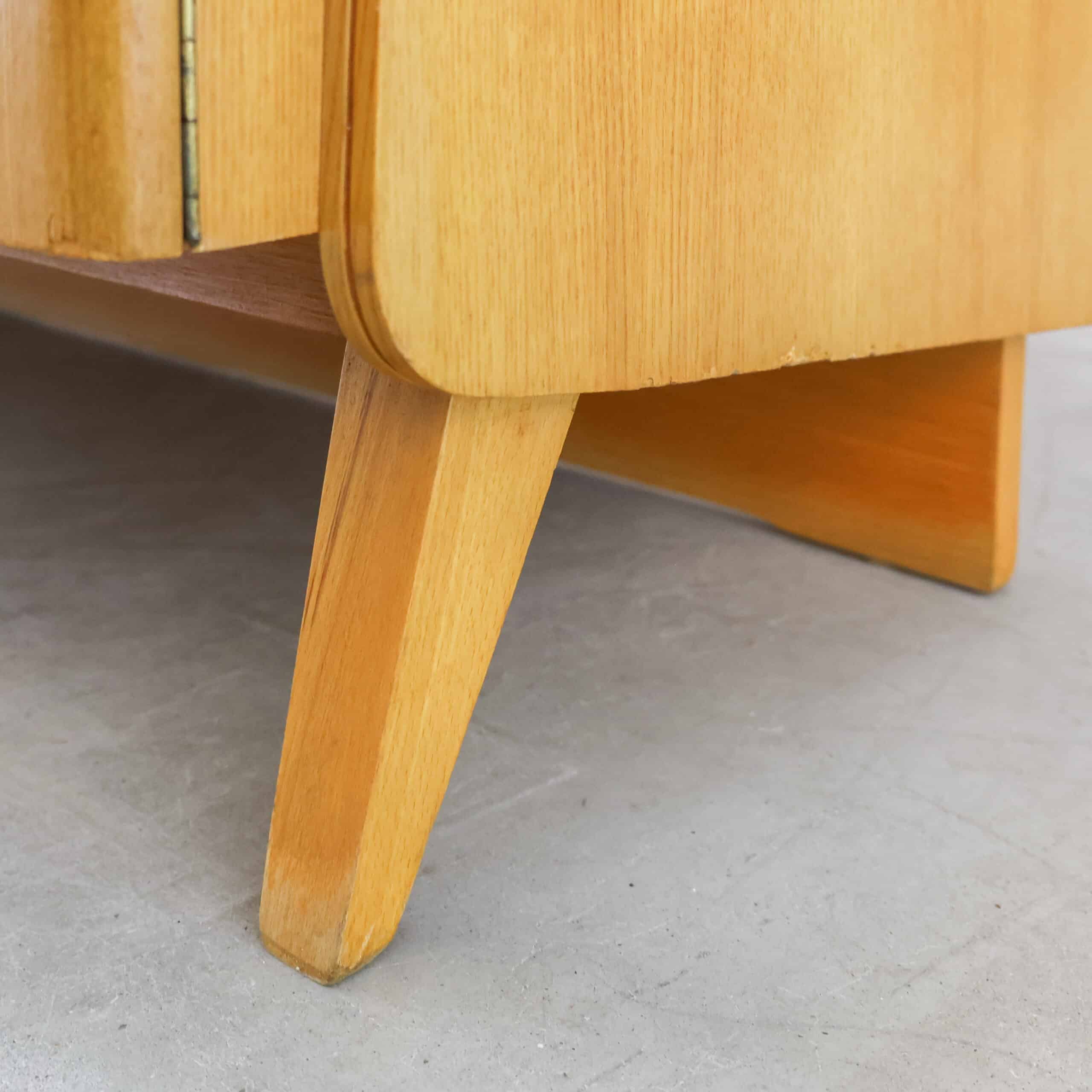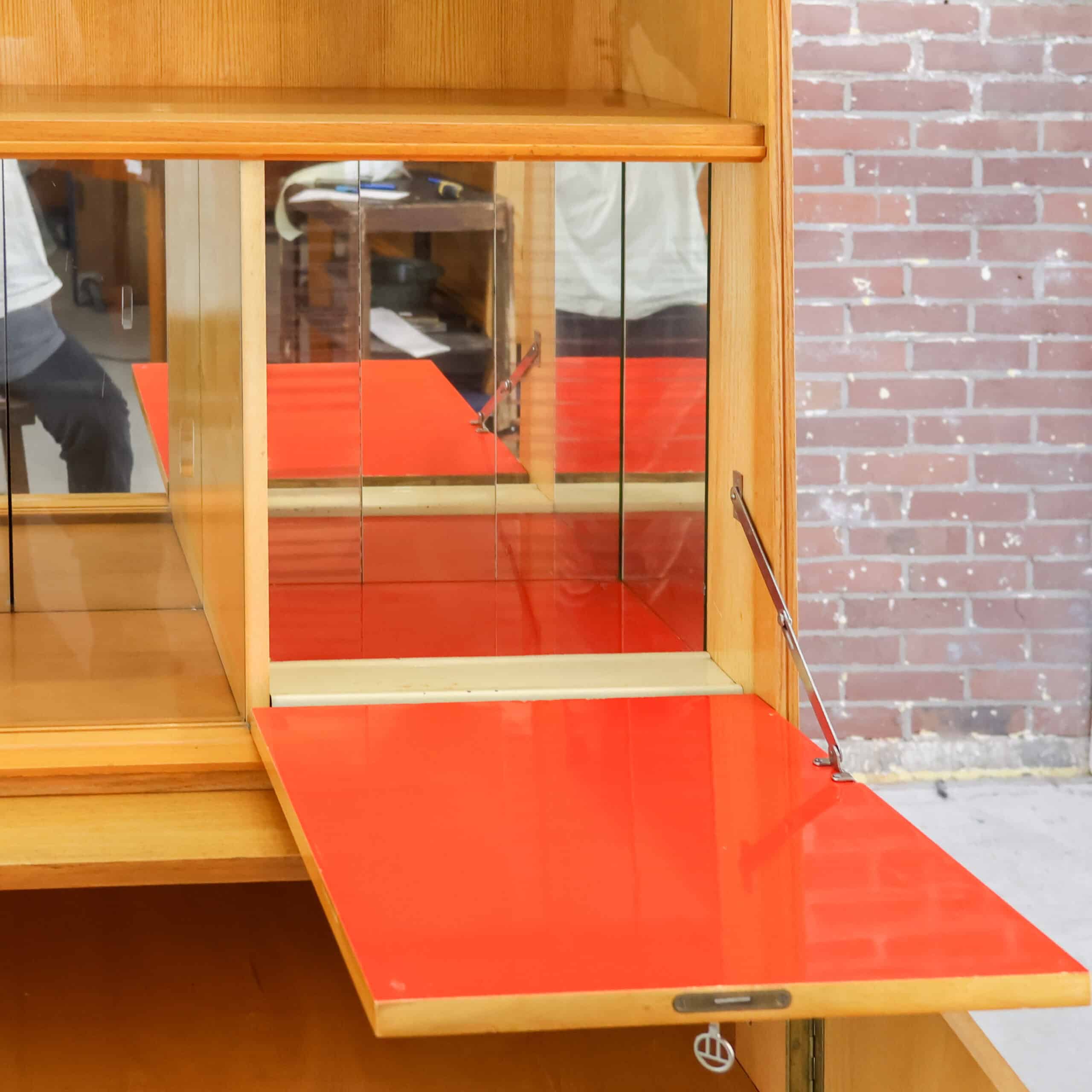 Mooie buffetkast uit de jaren ‘60 van Tatra Nábytok geproduceerd in Pravenec, Tsjechoslowakije. Hoogglans fineer met schuine poten en elegante handgrepen. De kast heeft een gespiegelde vitrine en een opvallende uitklapbare barplank. Bijzonder vintage stuk met karakter en subtiele gebruikssporen. Perfect als barkast maar ook als boekenkast.