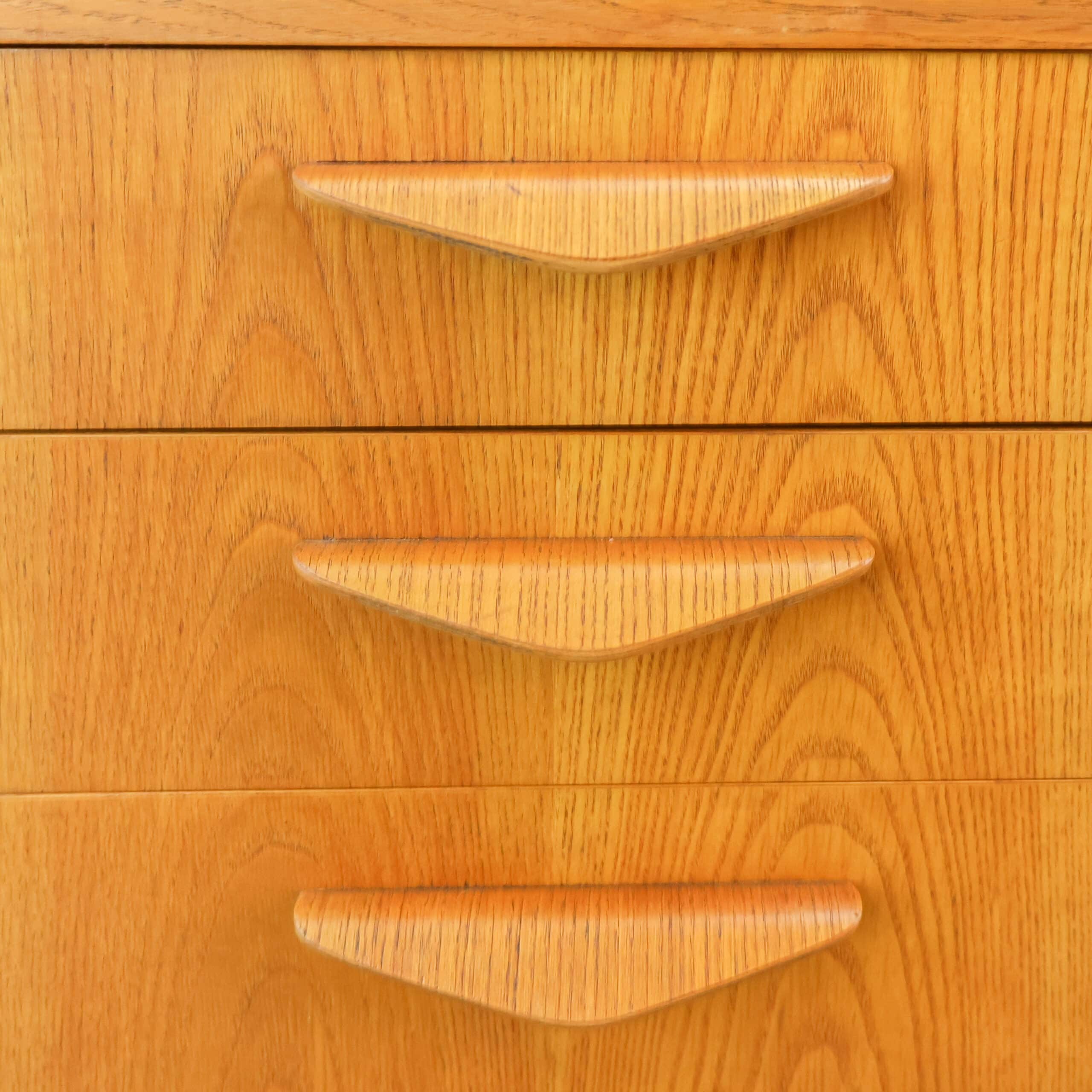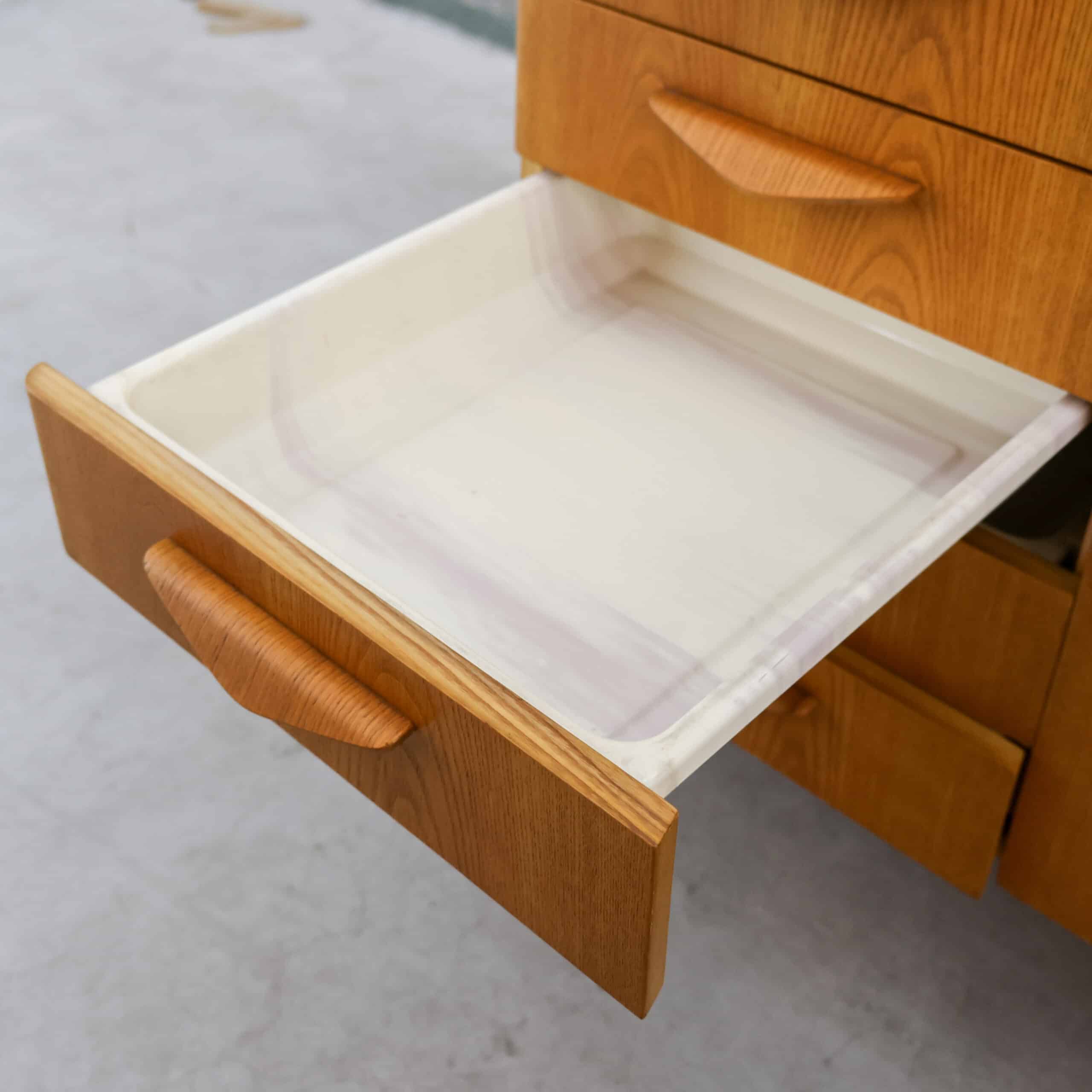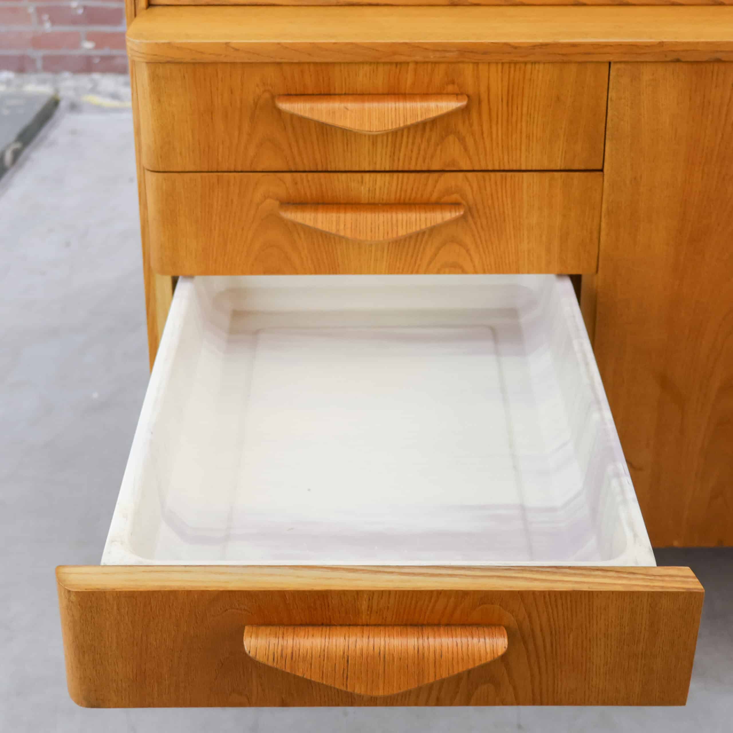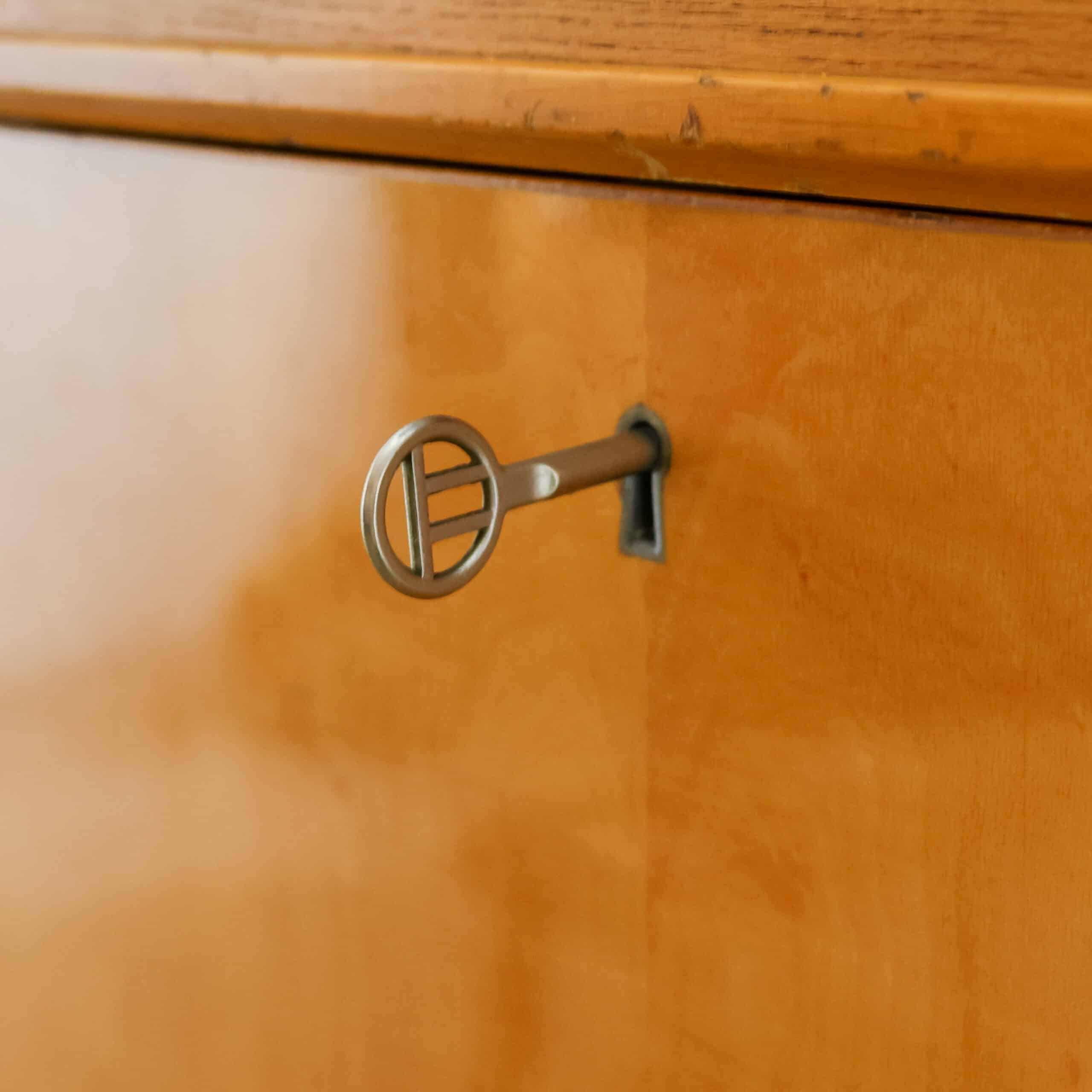 Mooie buffetkast uit de jaren ‘60 van Tatra Nábytok geproduceerd in Pravenec, Tsjechoslowakije. Hoogglans fineer met schuine poten en elegante handgrepen. De kast heeft een gespiegelde vitrine en een opvallende uitklapbare barplank. Bijzonder vintage stuk met karakter en subtiele gebruikssporen. Perfect als barkast maar ook als boekenkast.