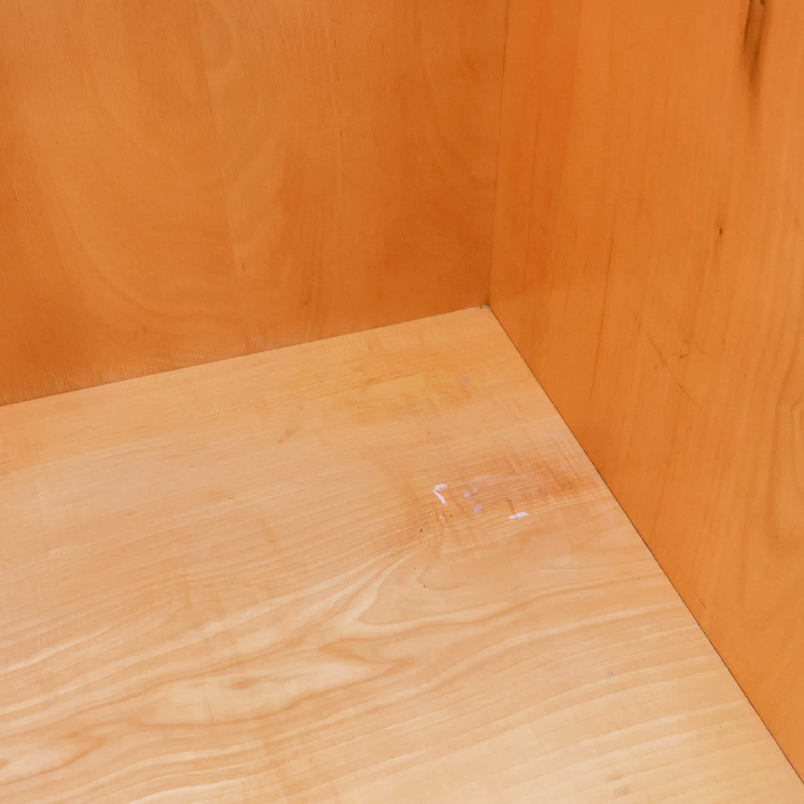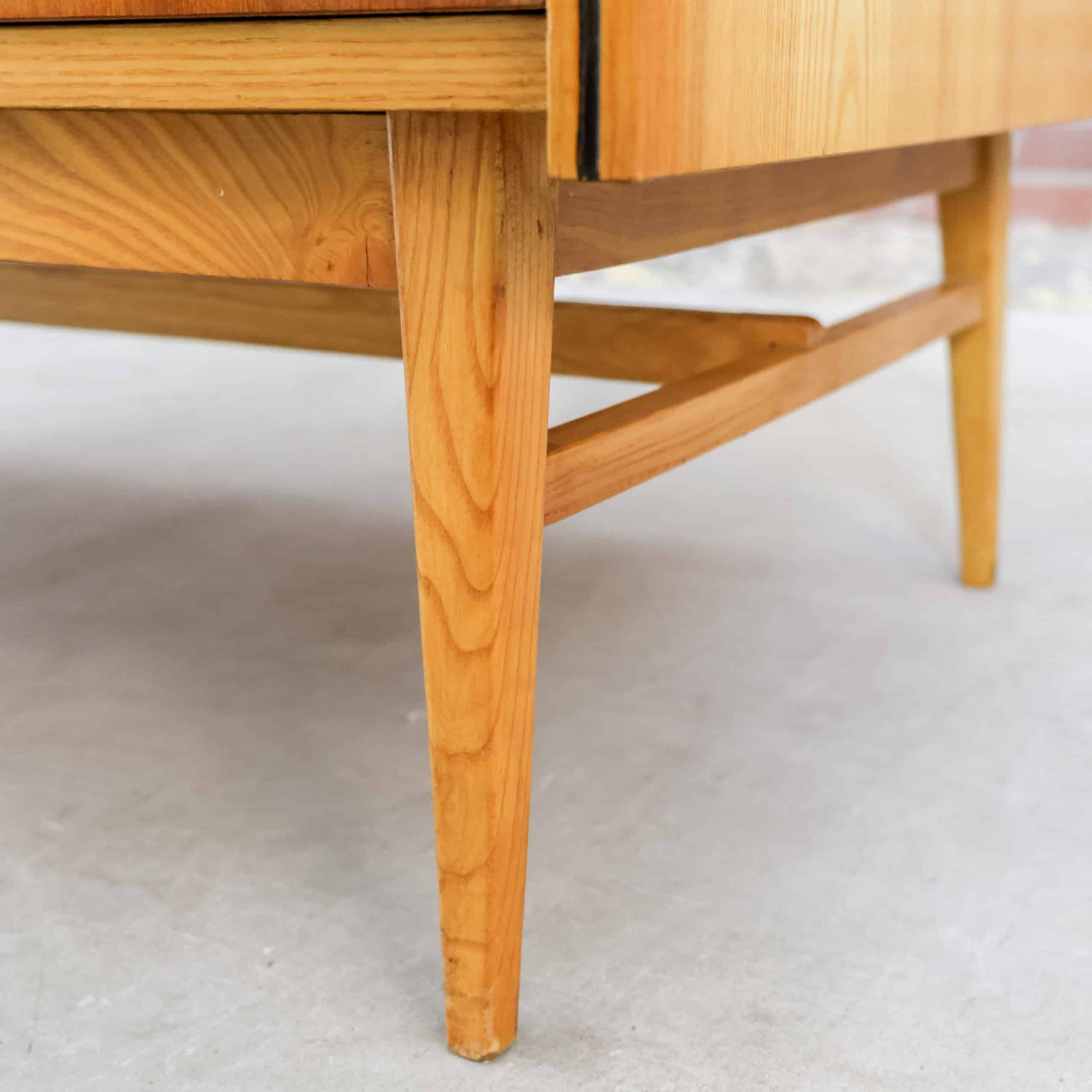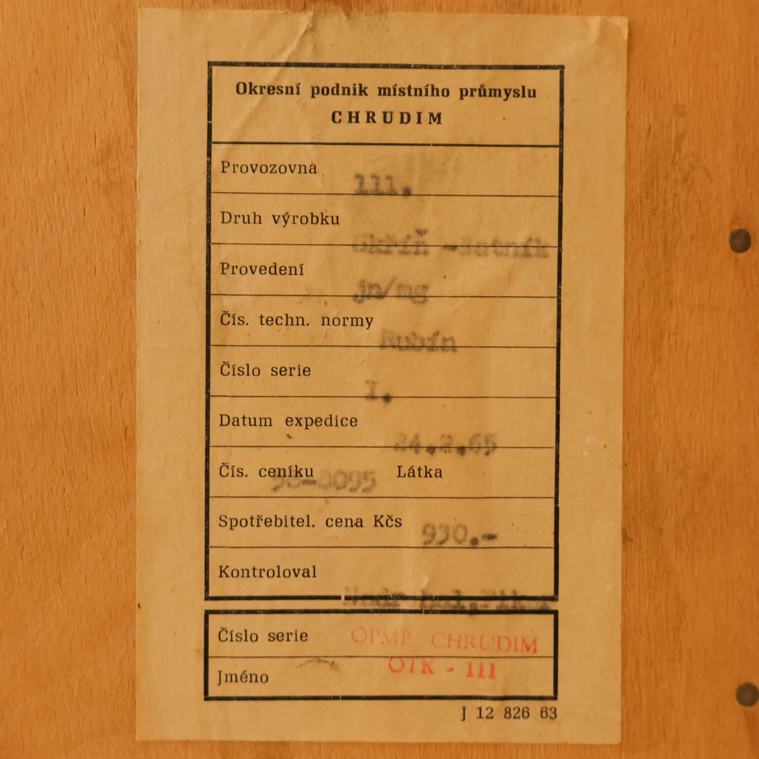 Deze originele jaren ’60 kast uit Tsjechoslowakije, afkomstig van Chrudim (1965), is een prachtig voorbeeld van minimalistisch mid-century design. Het warme houtfineer met verticale tekening geeft de kast een rustige, elegante uitstraling op haar slanke pootjes. Binnenin ruim en praktisch, met authentiek fabriekslabel nog aanwezig – een detail waar liefhebbers blij van worden. Lichte sporen van gebruik passend bij de leeftijd, maar juist dat maakt haar een eerlijk en karaktervol stuk.