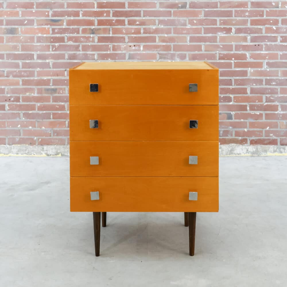 Een stijlvolle vintage ladekastje in mid-century sfeer, met een warme houttint en elegante slanke pootjes. De vier ruime lades geven veel opbergruimte en de vierkante knopjes zorgen voor een strak, tijdloos detail. Perfect als ladekast in de slaapkamer, als halkast of als sfeervol accent in de woonkamer. Mooie originele vintage staat met lichte gebruikssporen die passen bij de leeftijd en het karakter van het meubel.
