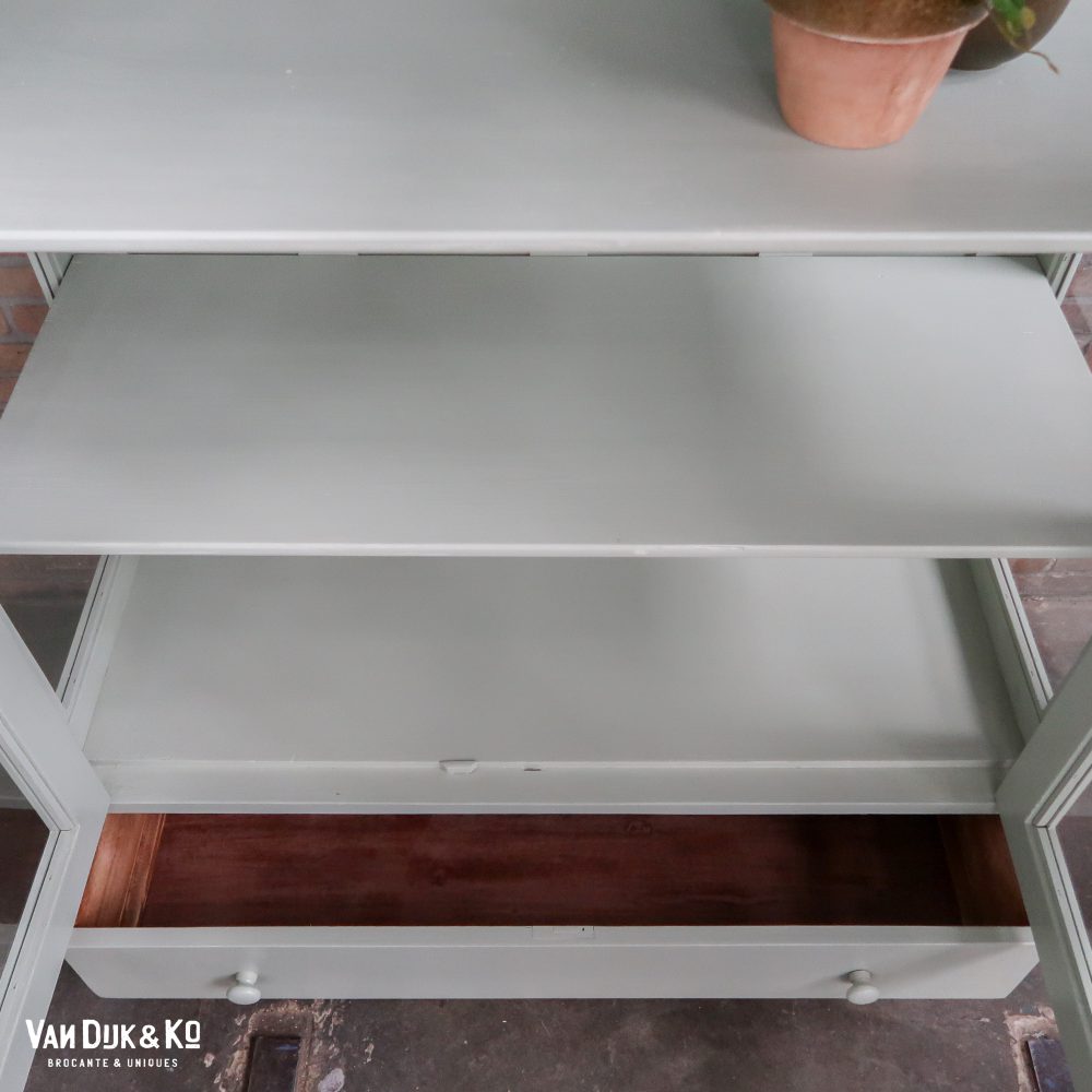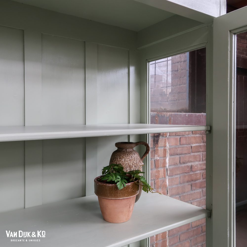 Nèt binnen, deze mintgroene vitrinekast uit Hongarije! We hebben haar opgeknapt waar nodig, zo heeft ze naast drie nieuwe planken ook een lekker fris kleurtje gekregen.