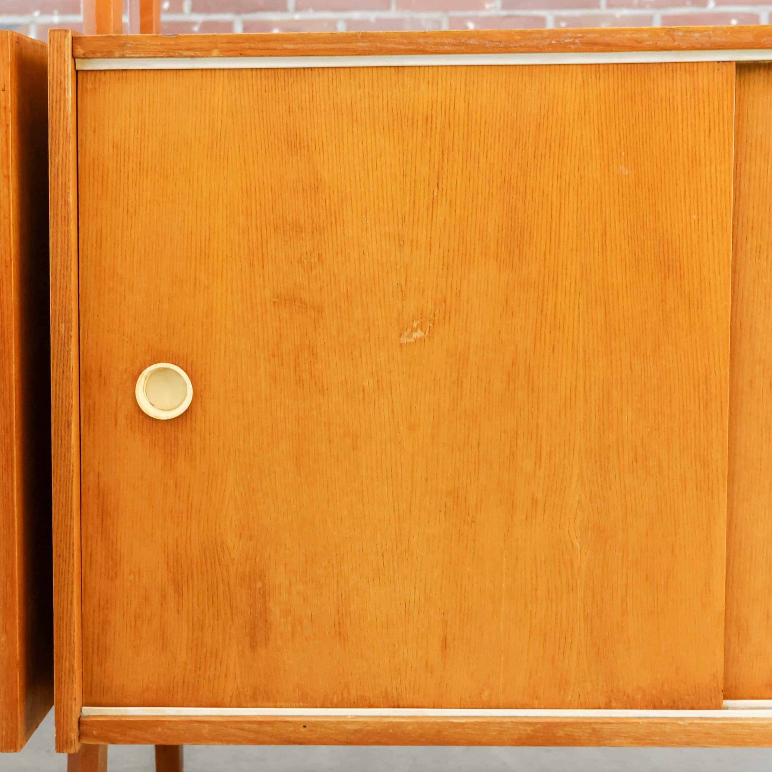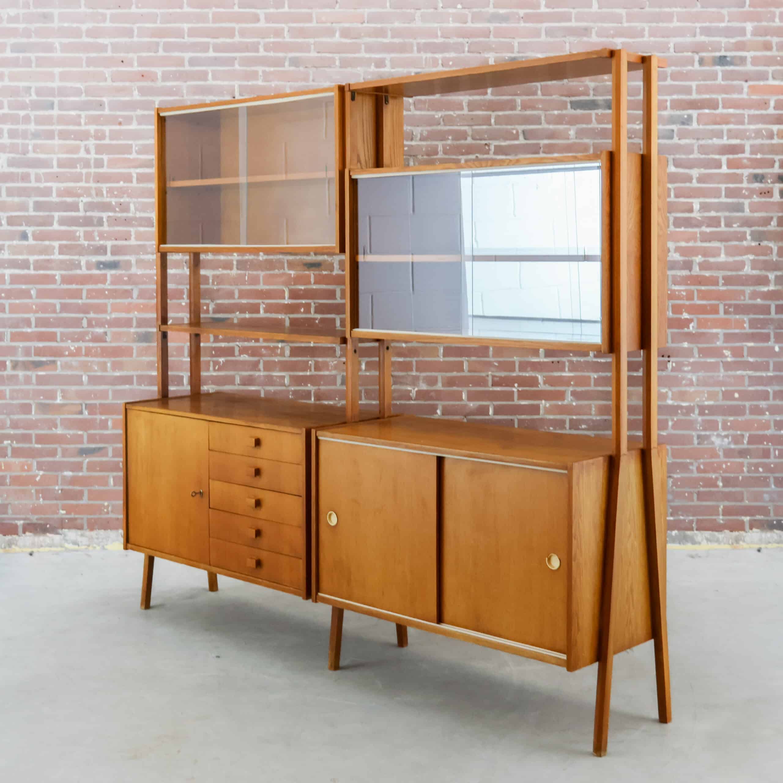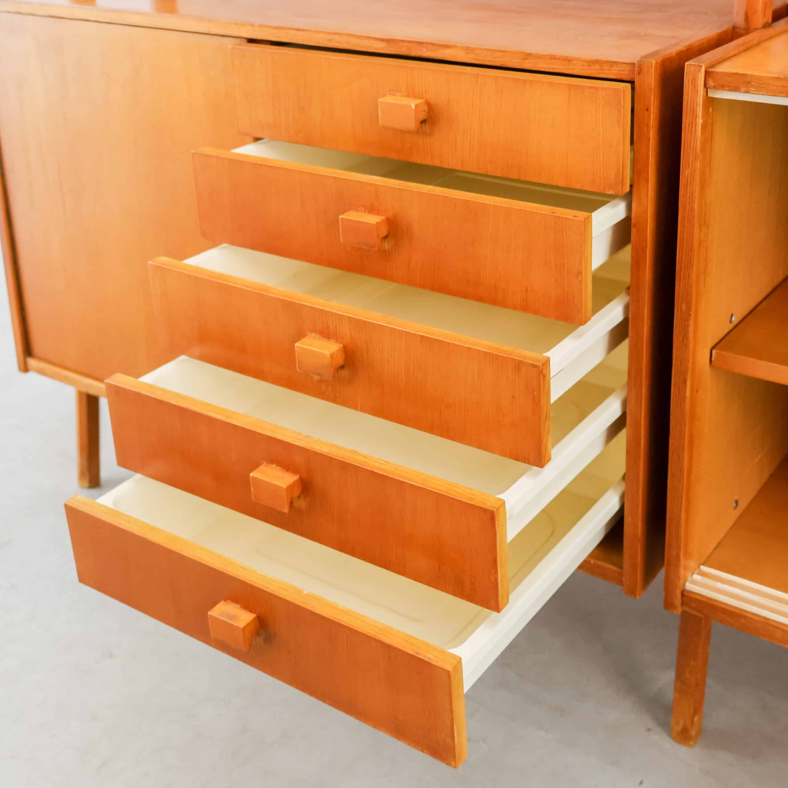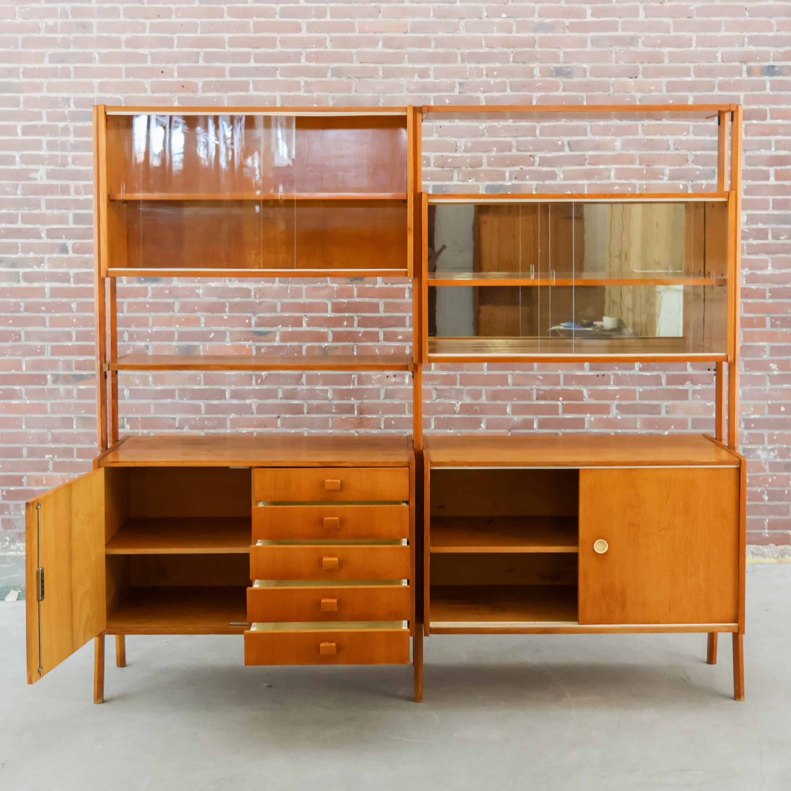 Modulaire wandkast van Tatra Nábytok met een strak en speels mid-century ontwerp. De combinatie van vitrines, lades en schuifdeuren biedt veel praktische opbergruimte. Mooi warm hout met originele details zoals de ranke poten en vierkante grepen. Een zeldzame en veelzijdige kast die perfect staat in zowel een modern als vintage interieur.