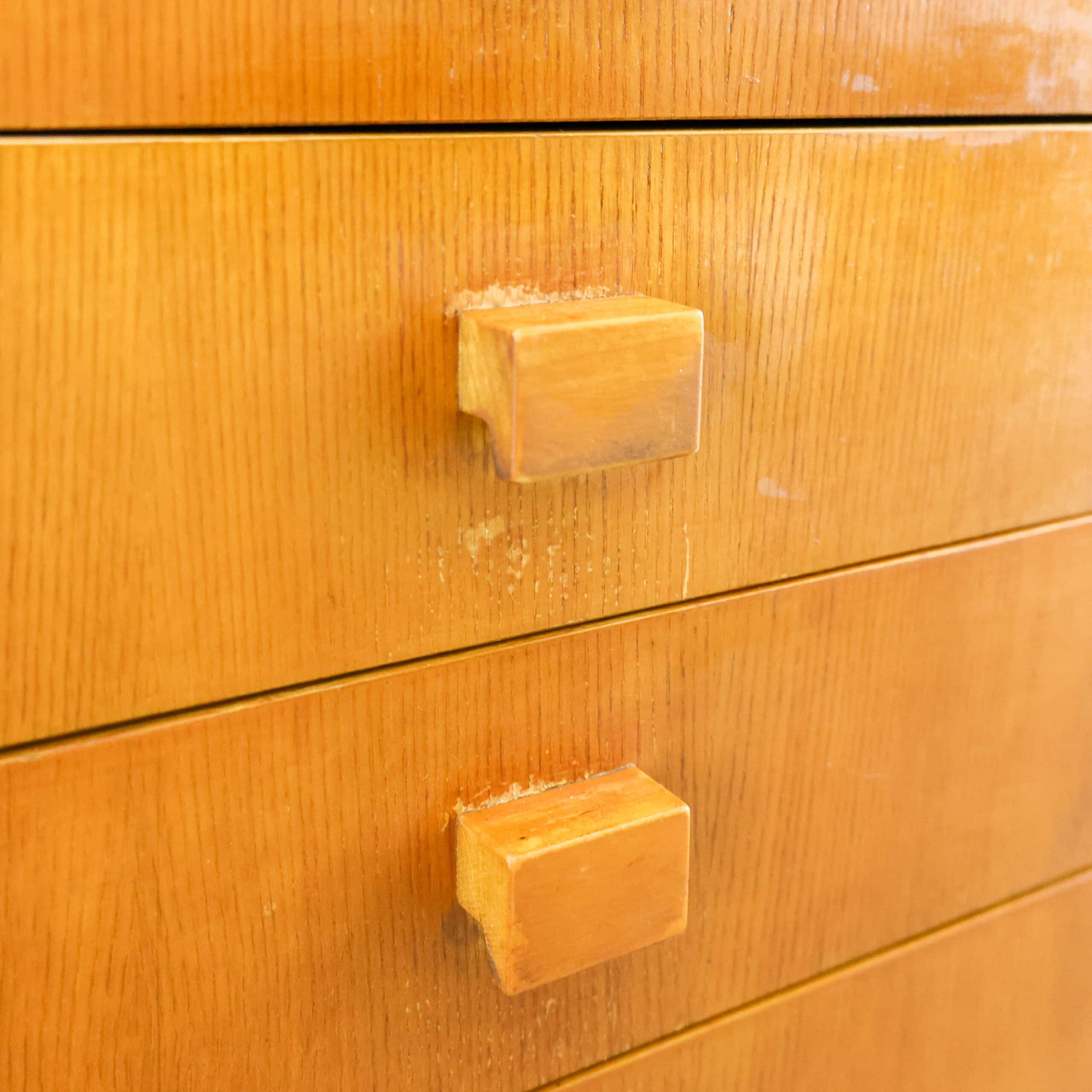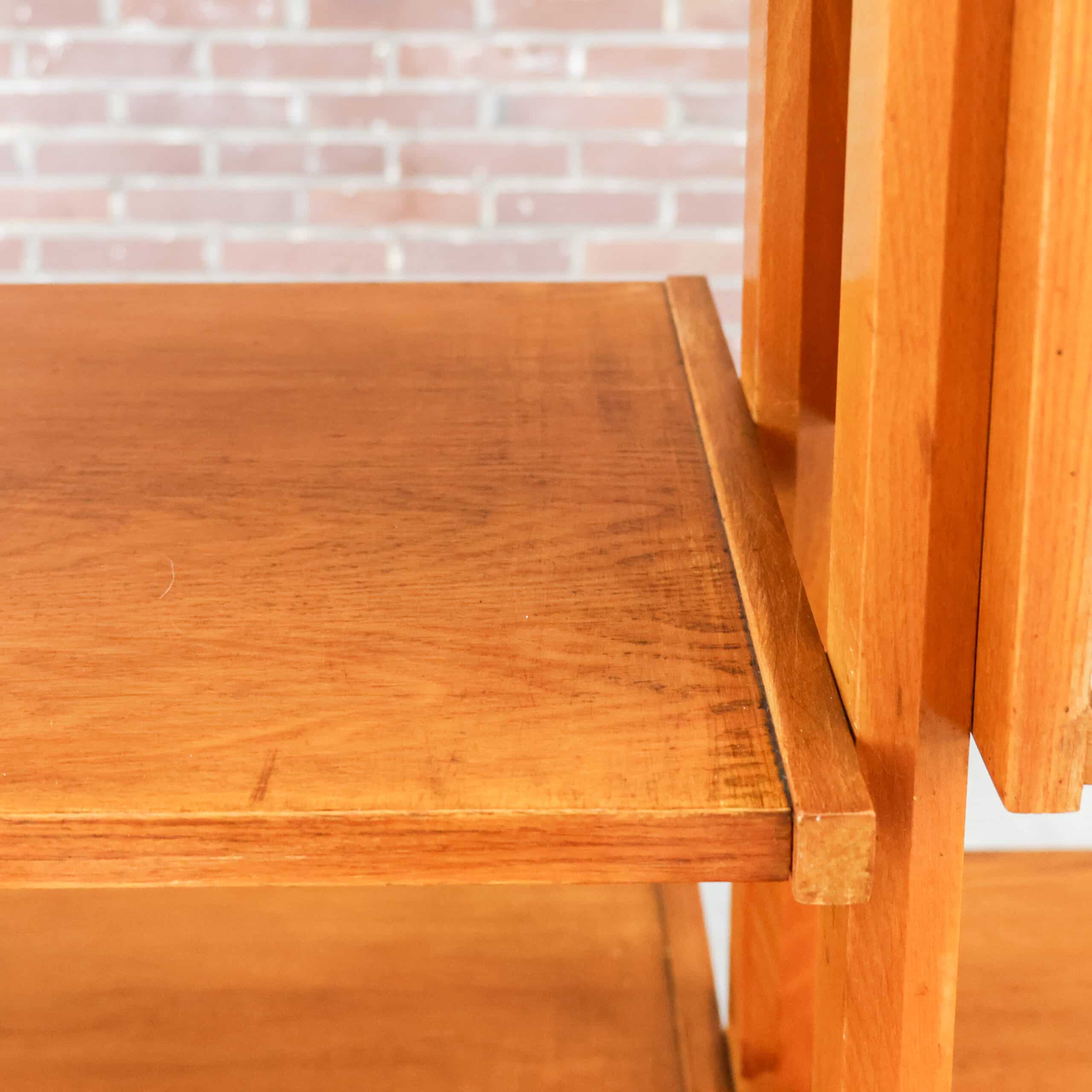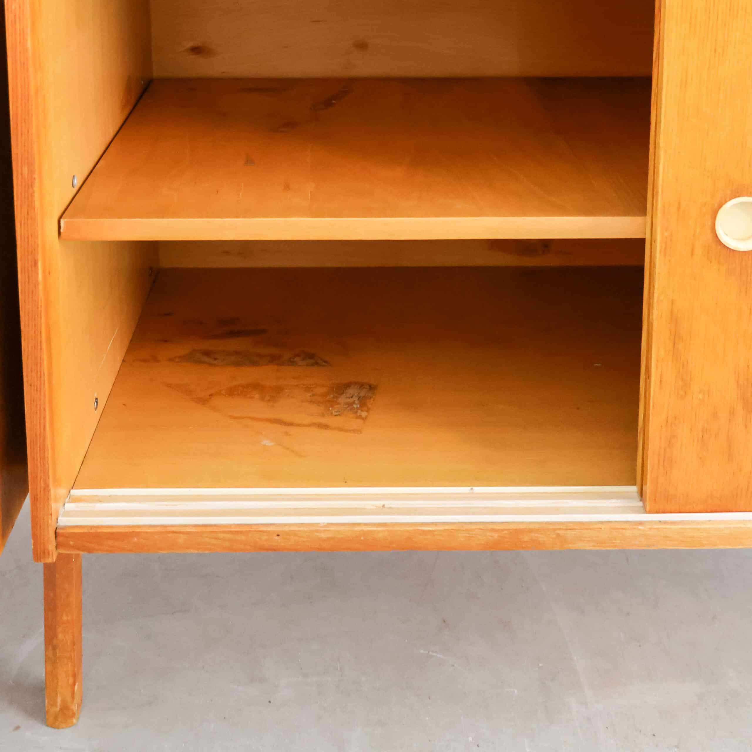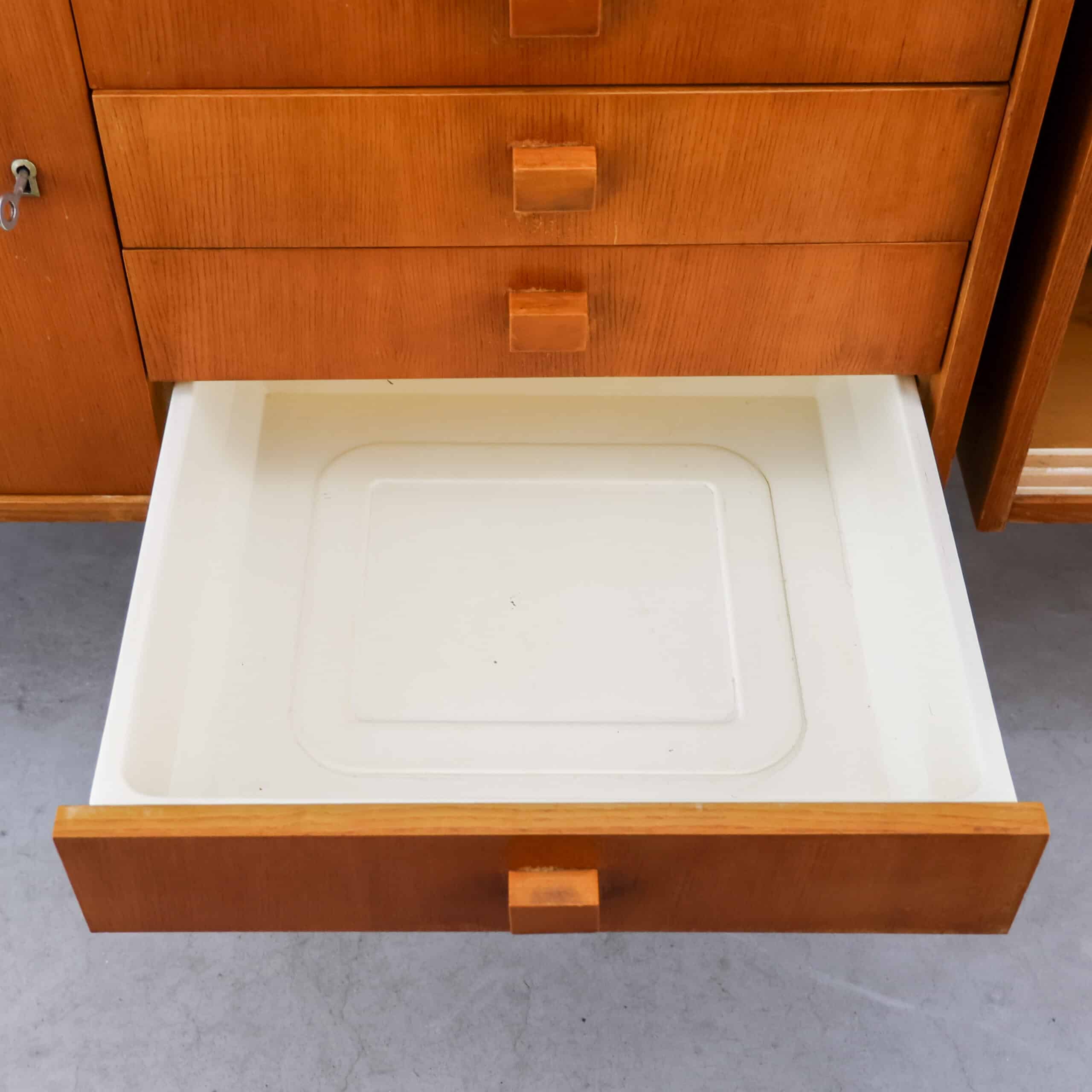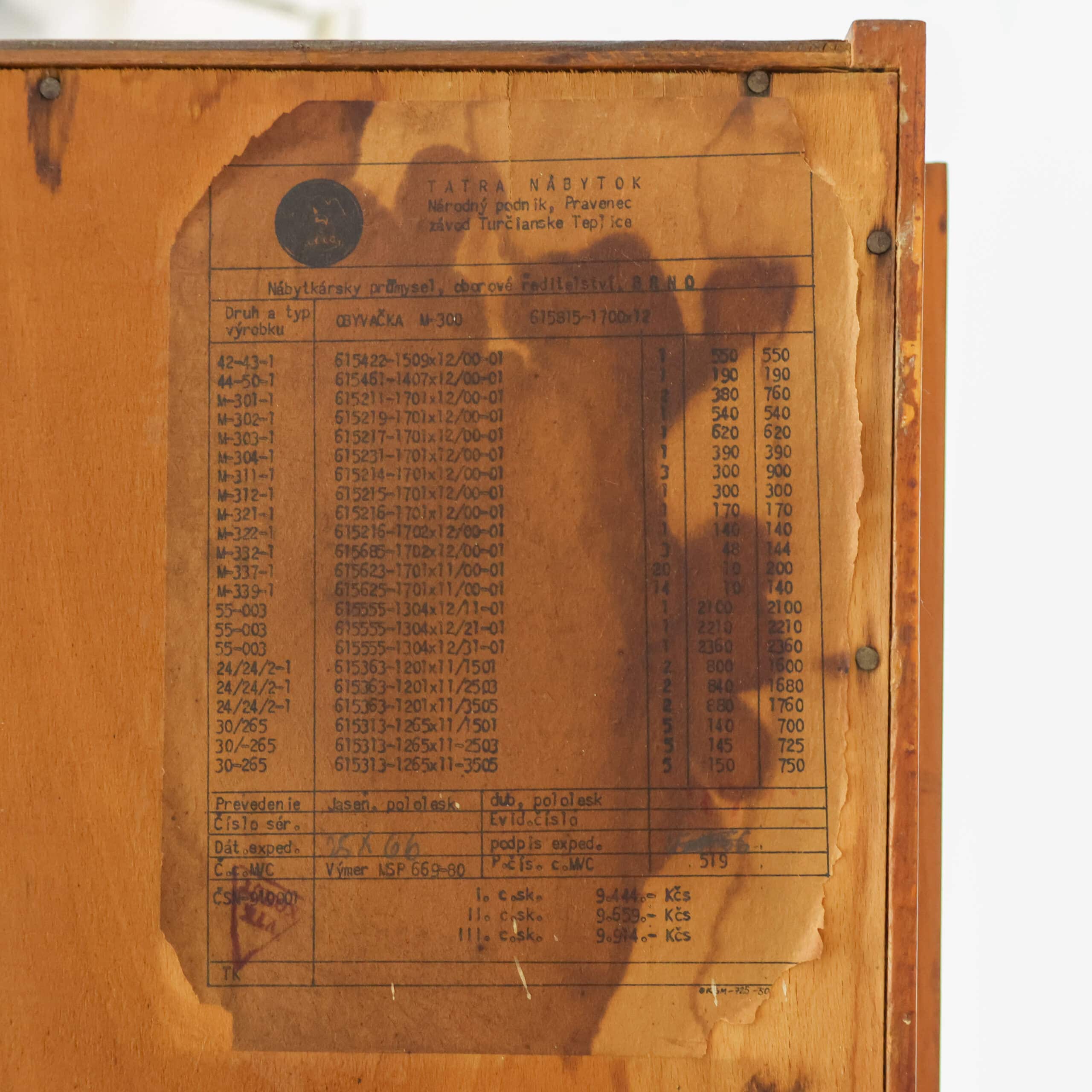 Modulaire wandkast van Tatra Nábytok met een strak en speels mid-century ontwerp. De combinatie van vitrines, lades en schuifdeuren biedt veel praktische opbergruimte. Mooi warm hout met originele details zoals de ranke poten en vierkante grepen. Een zeldzame en veelzijdige kast die perfect staat in zowel een modern als vintage interieur.