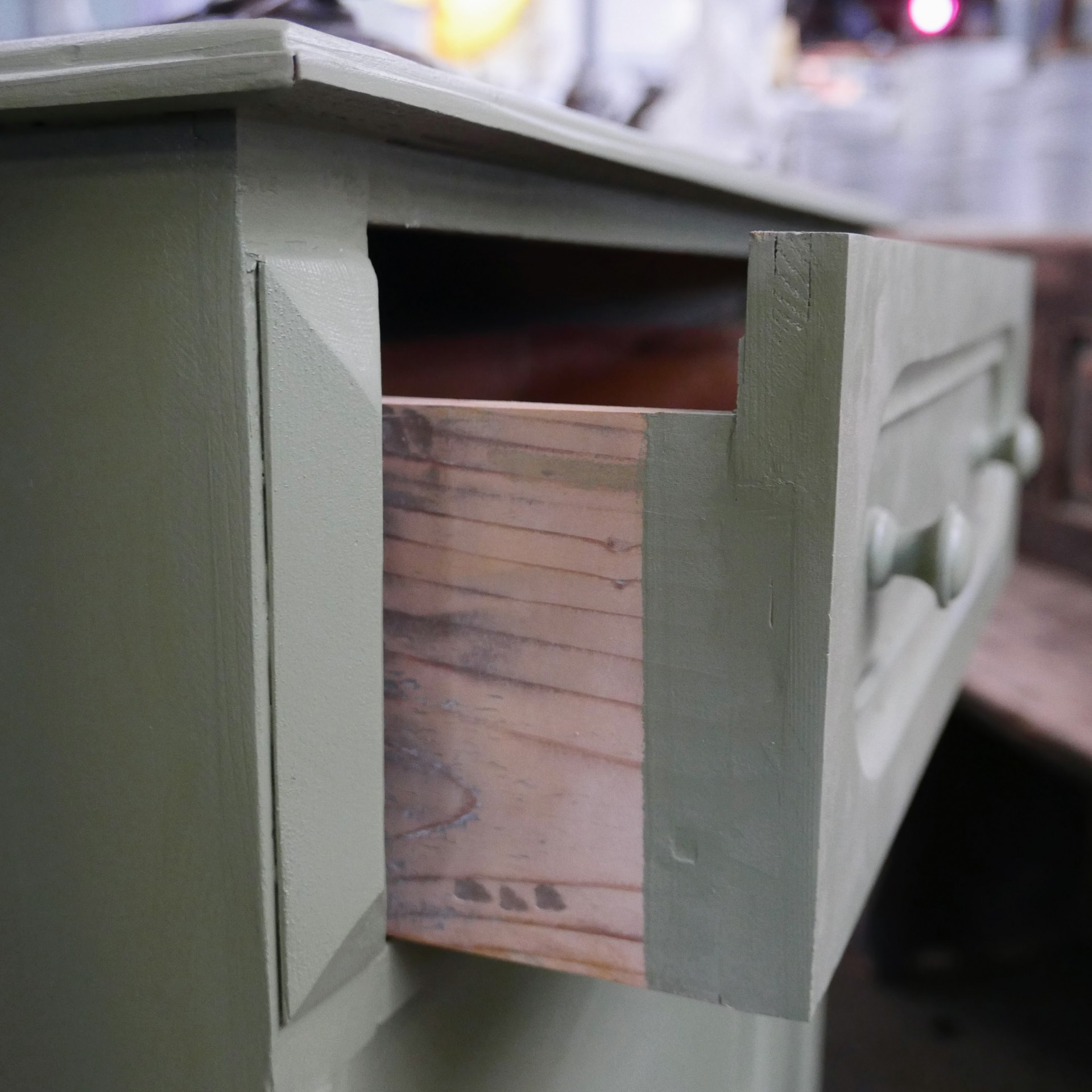 Brocante olijfgroen kastje. Het kastje is gemaakt van hout en groen. Bovenin een lade met twee houten knoppen. De kast heeft een deurtje wat naar rechts opent. Het deurtje kan afgesloten worden door een slot. Binnenin een plank. Het kastje komt uit Hongarije.