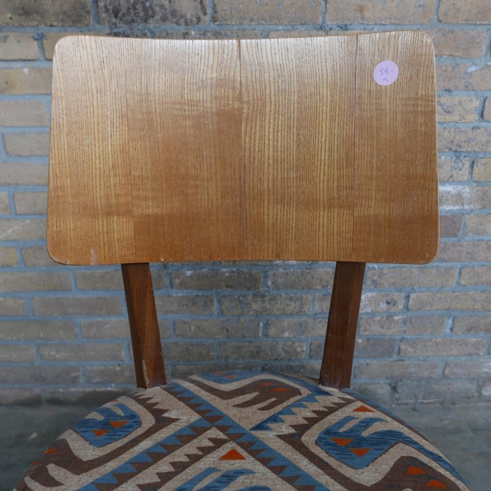 Een leuke retro jaren ’50 stoeltje. De stoel heeft een houten frame in een retro design. De bekleding is van katoen en heeft een blauwe getint indianen patroon. Het stoeltje kan gebruikerssporen tonen.