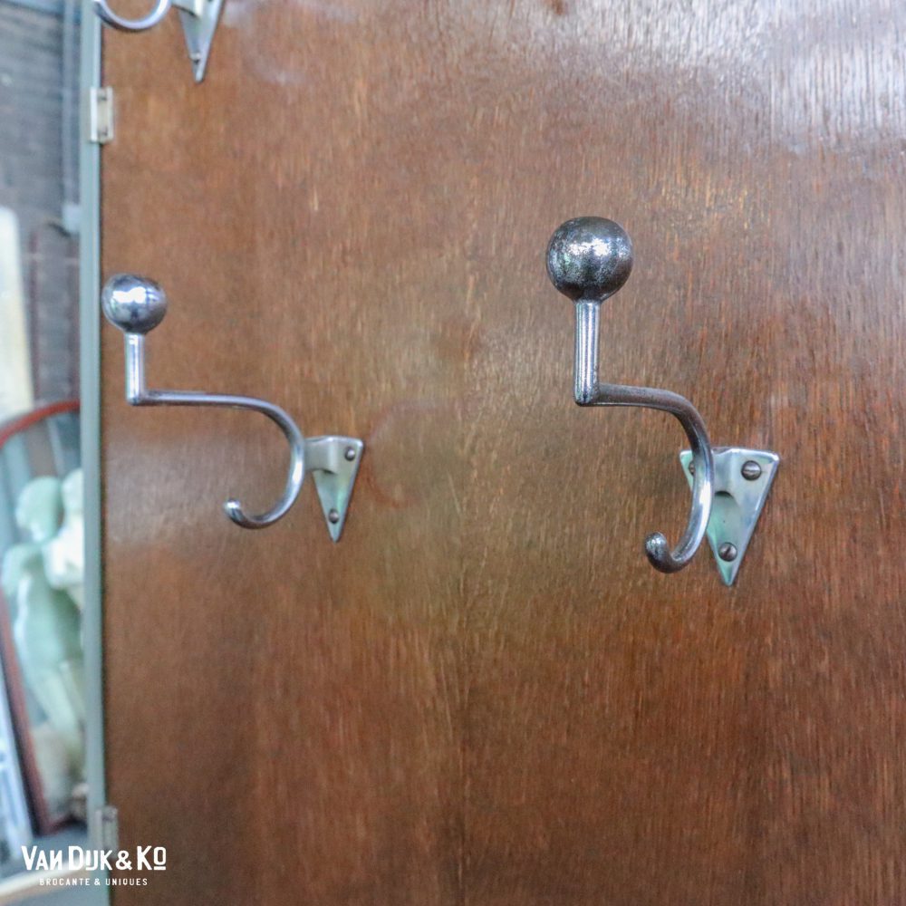 Een mooi retro kapstokmeubel, uniek en lekker terug in de tijd! Dit Art Deco kapstokpaneel is gevonden in België! Je kan naast het ophangen van jassen ook nog wat kleine spulletjes plaatsen in het kastje linksonder. De kapstok is met haar originele haken en metalen details zowel mooi als praktisch dus 🙂