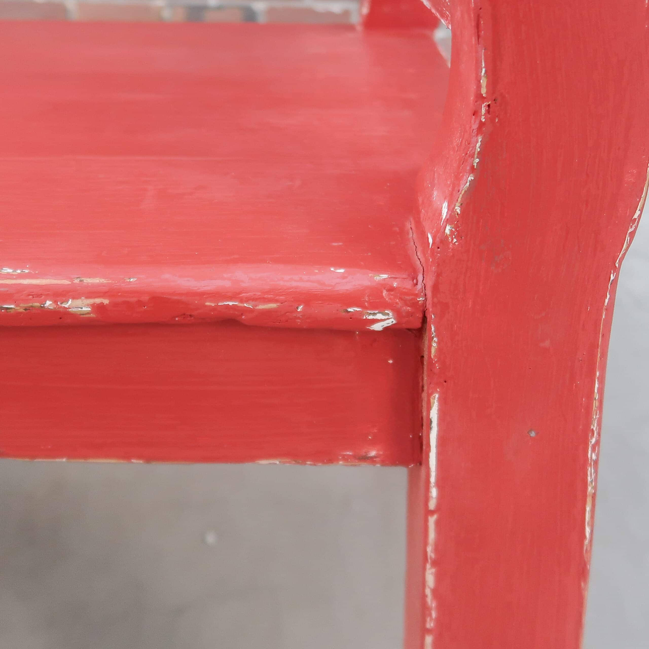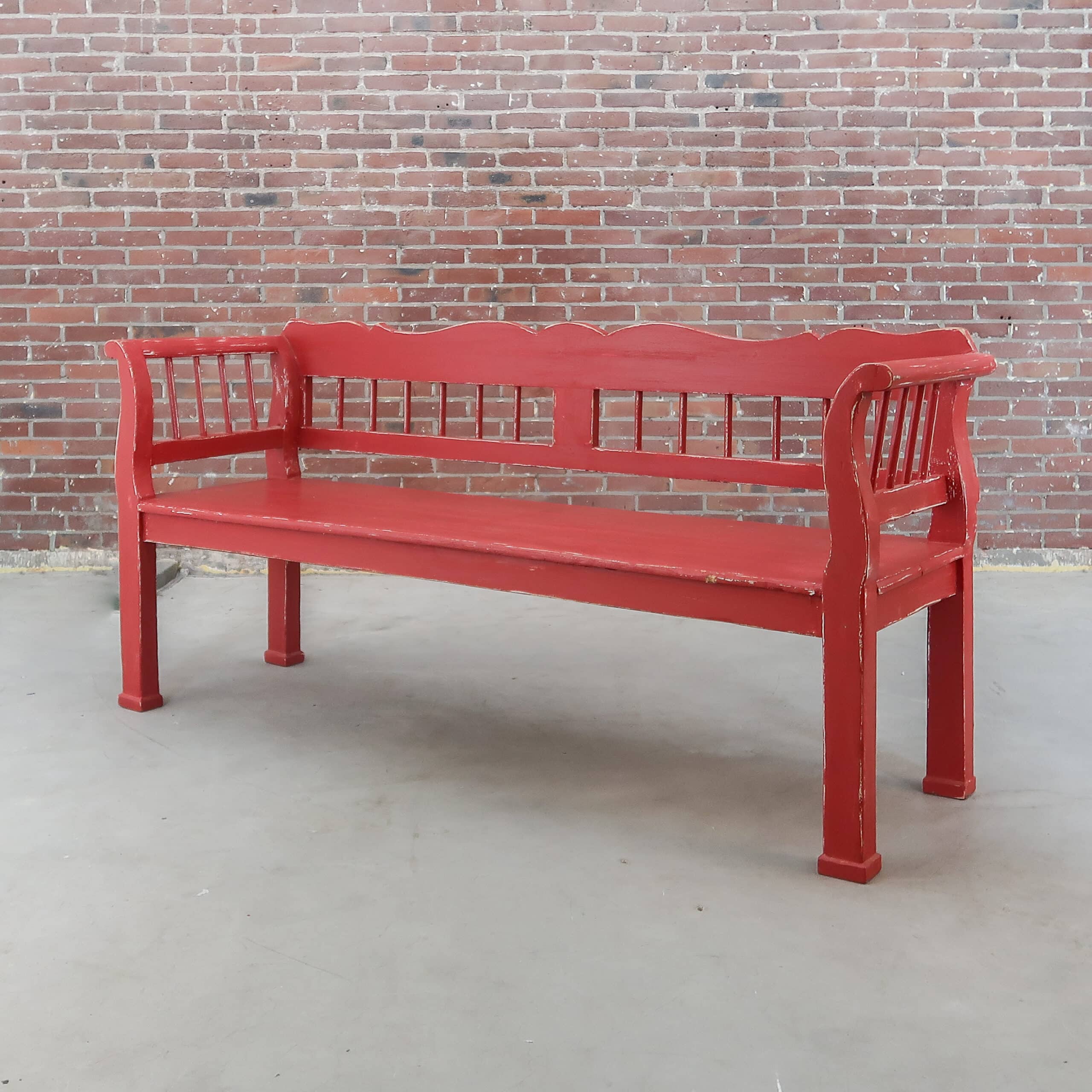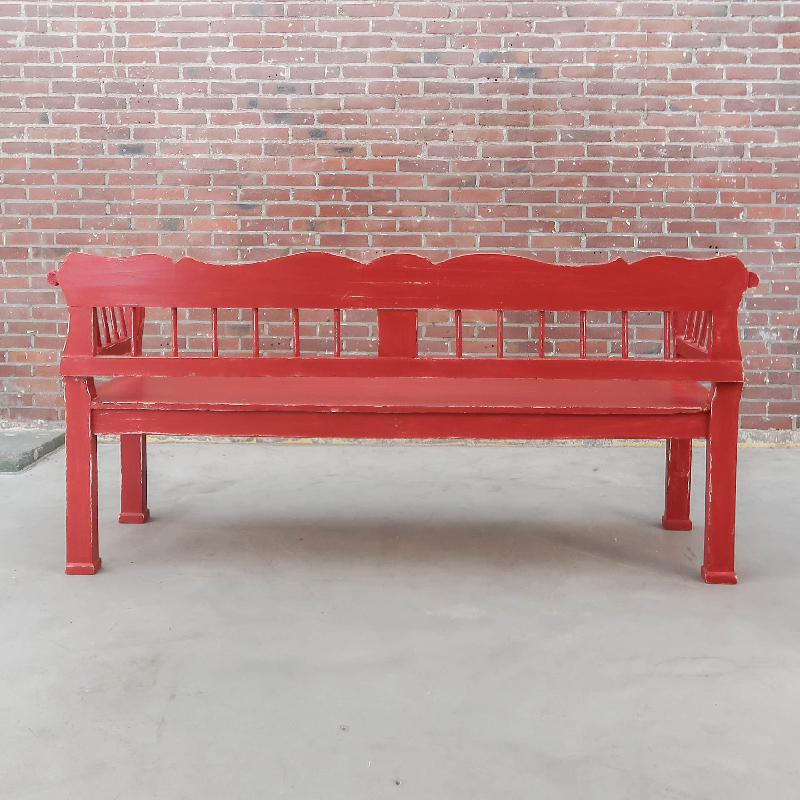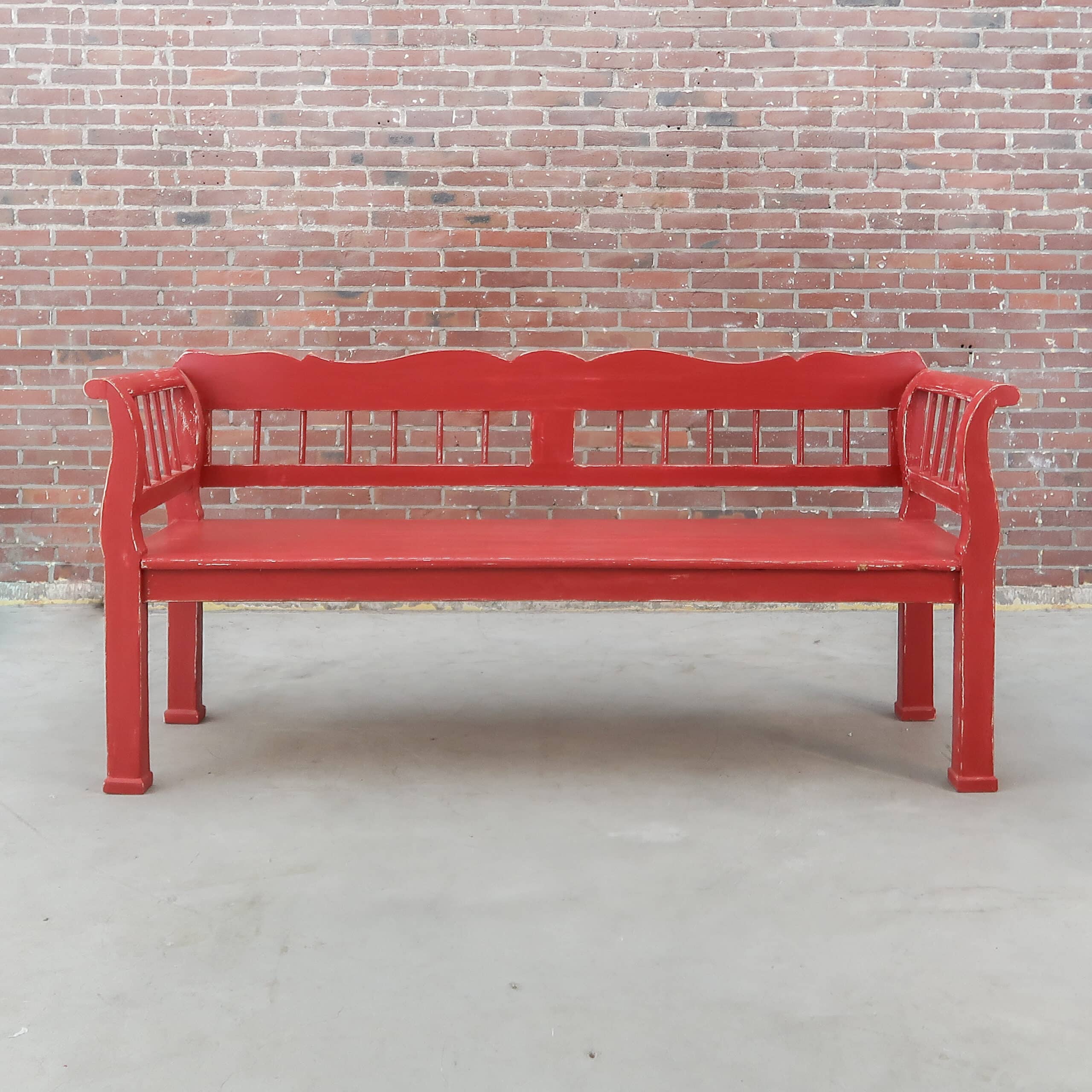 Deze verweerde houten bank, gevonden in Hongarije, heeft een prachtige authentieke uitstraling. Het warme rood en de klassieke vorm geven karakter aan elk interieur of tuin. Gemaakt van stevig hout en met mooie details in de armleuningen. Een uniek stuk dat sfeer en geschiedenis meebrengt.