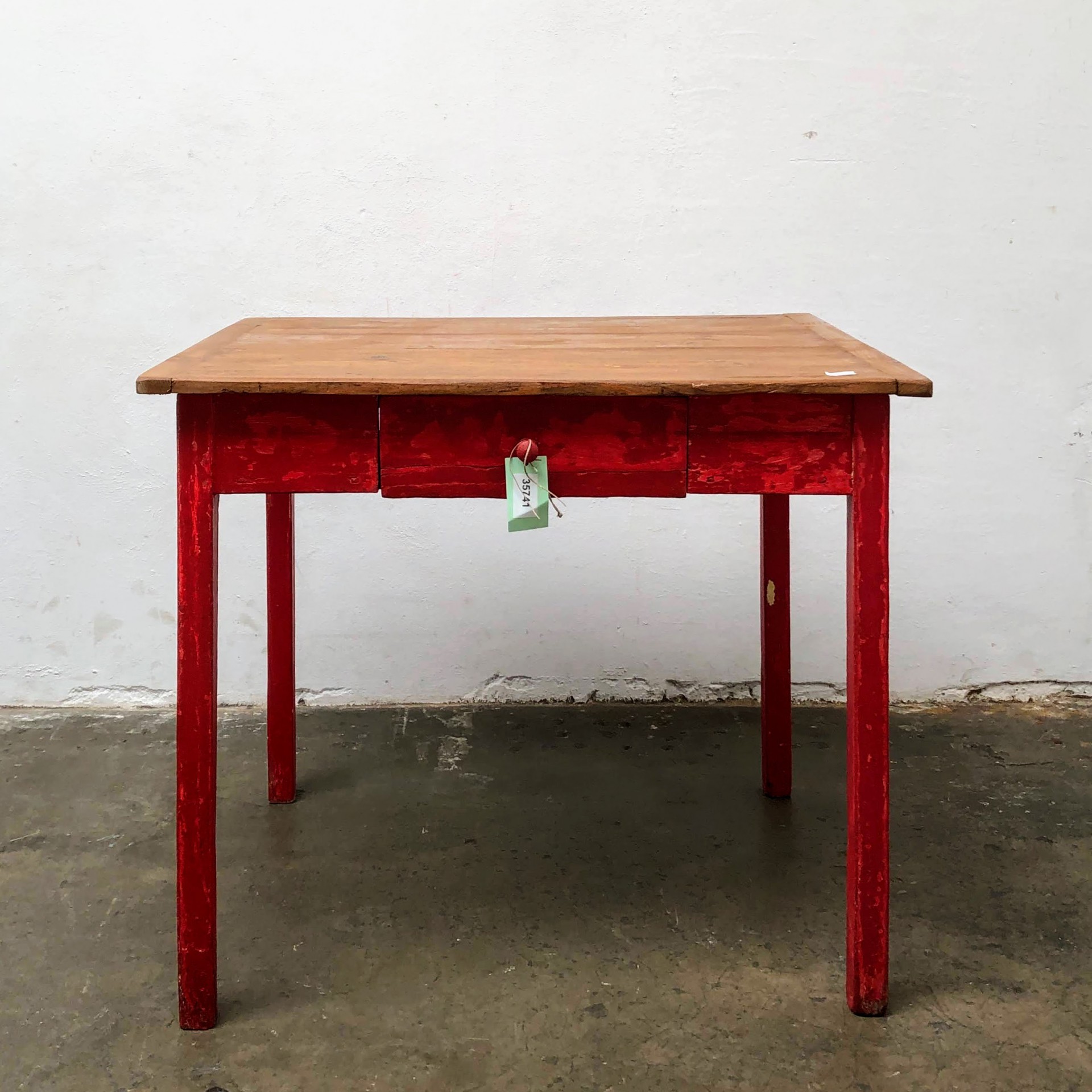 Een kleine brocante knalrode eettafel gemaakt van hout. De tafel heeft ook een onbewerkt houten tafelblad. Onder het tafelblad aan één zijde een kleine lade met een houten knop. De structuur van het hout is door de verf te zien. Ook leuk als klein bureau of maak er een wastafel meubel van. De tafel kan gebruikerssporen tonen.
