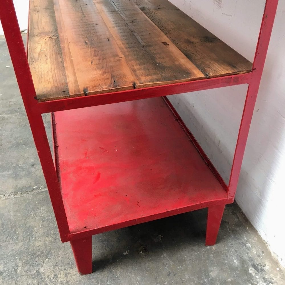 Stijlvolle open rode kast gemaakt van metaal en hout. Is goed te gebruiken als stellingkast voor op kantoor of werkkamer en als room divider in de woonkamer. Door zijn open uiterlijk en het gebruik van zowel hout als metaal, is het een prachtige aanwinst in je interieur. De planken in de kast zijn nieuw en worden van gerecycled hout gemaakt door ons team in Hongarije. De kast heeft gebruikerssporen.