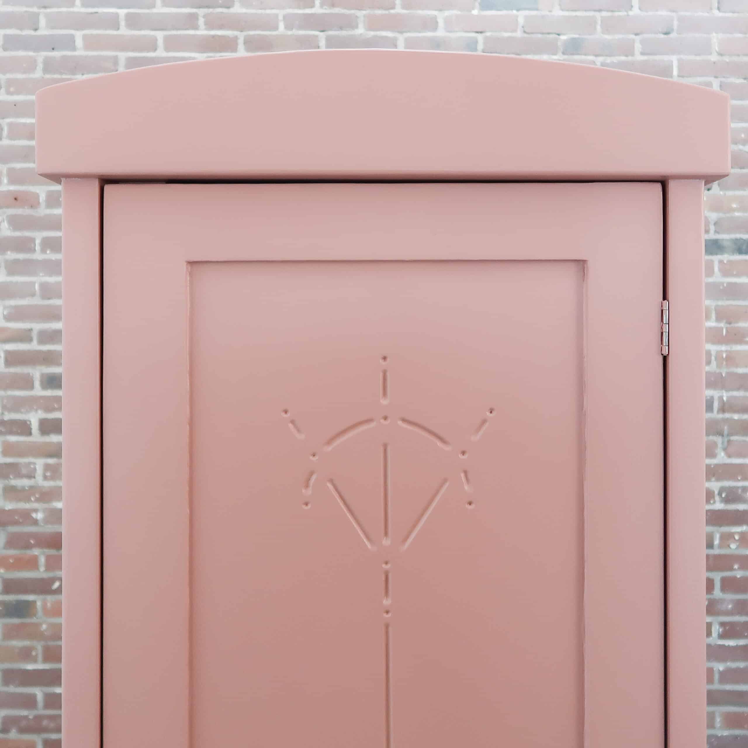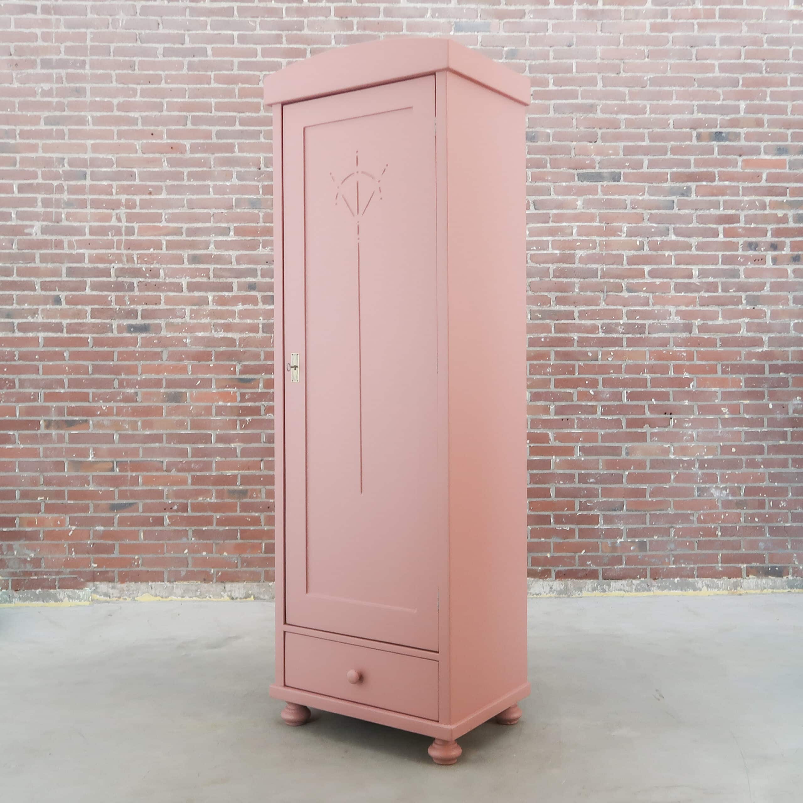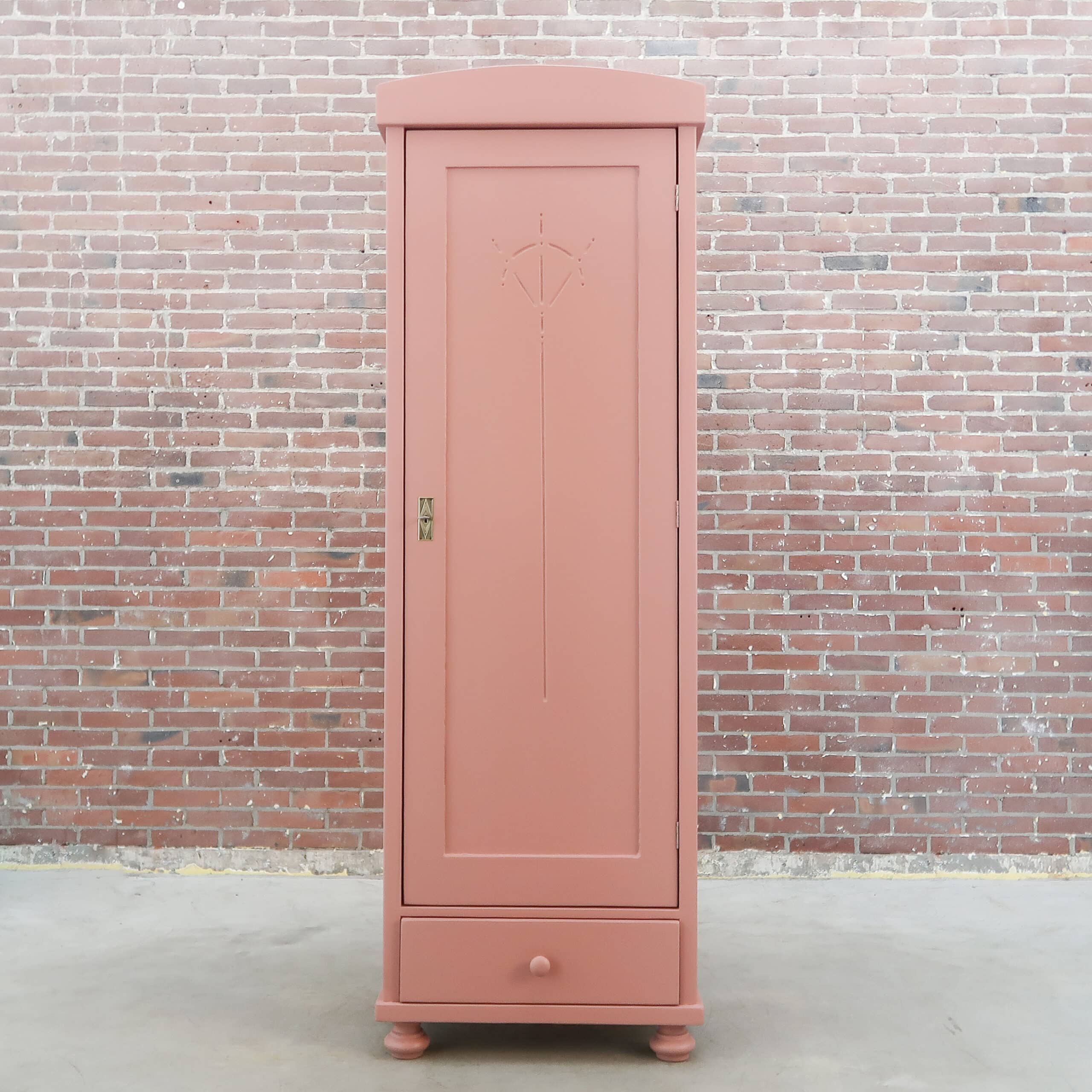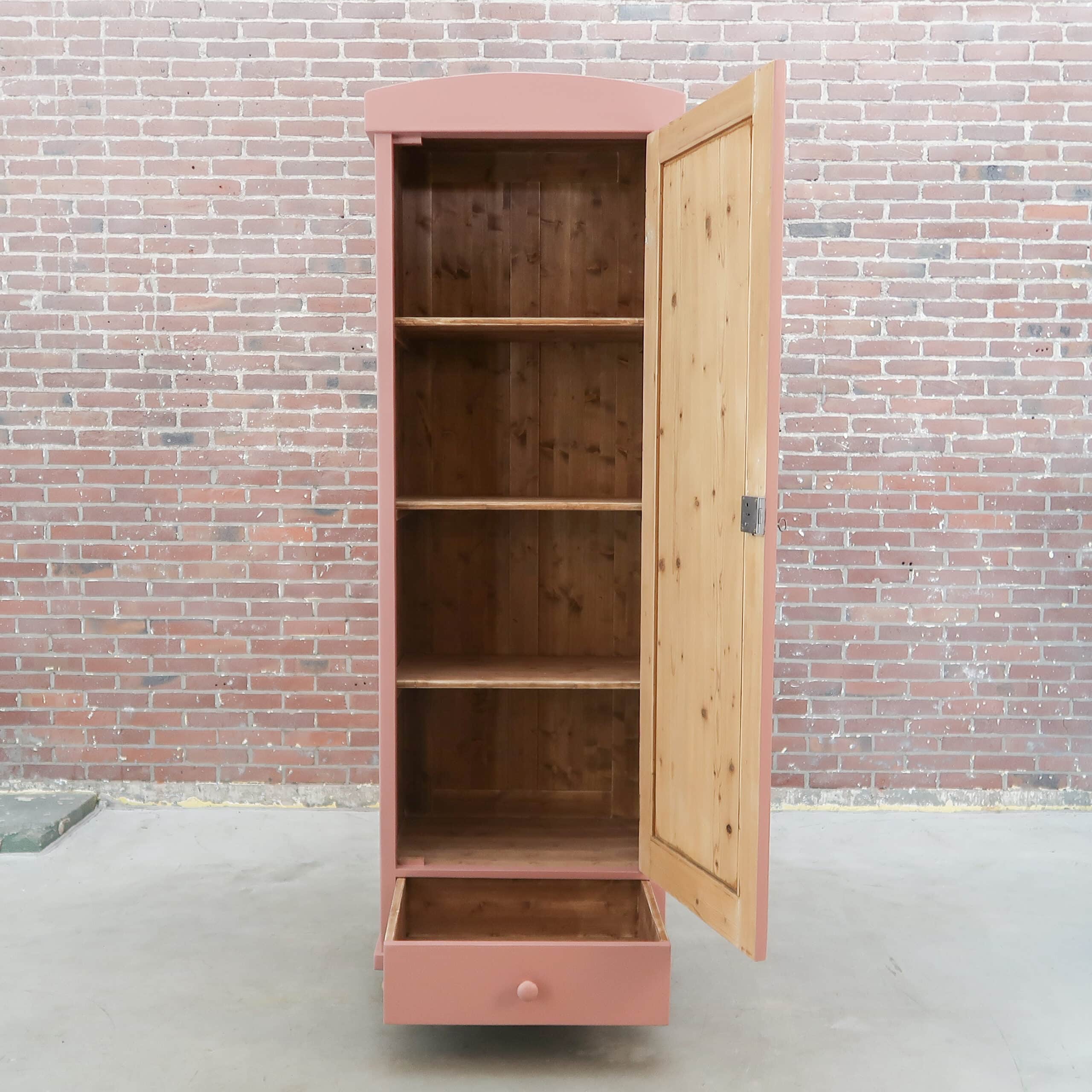 Van oude vervallen kast naar prachtige roze eendeurs linnenkast! We hebben haar in onze werkplaats gemaakt van oude onderdelen en een fijne roze kleur gegeven. Een fijn formaat voor een kleinere ruimte bijvoorbeeld de babykamer.