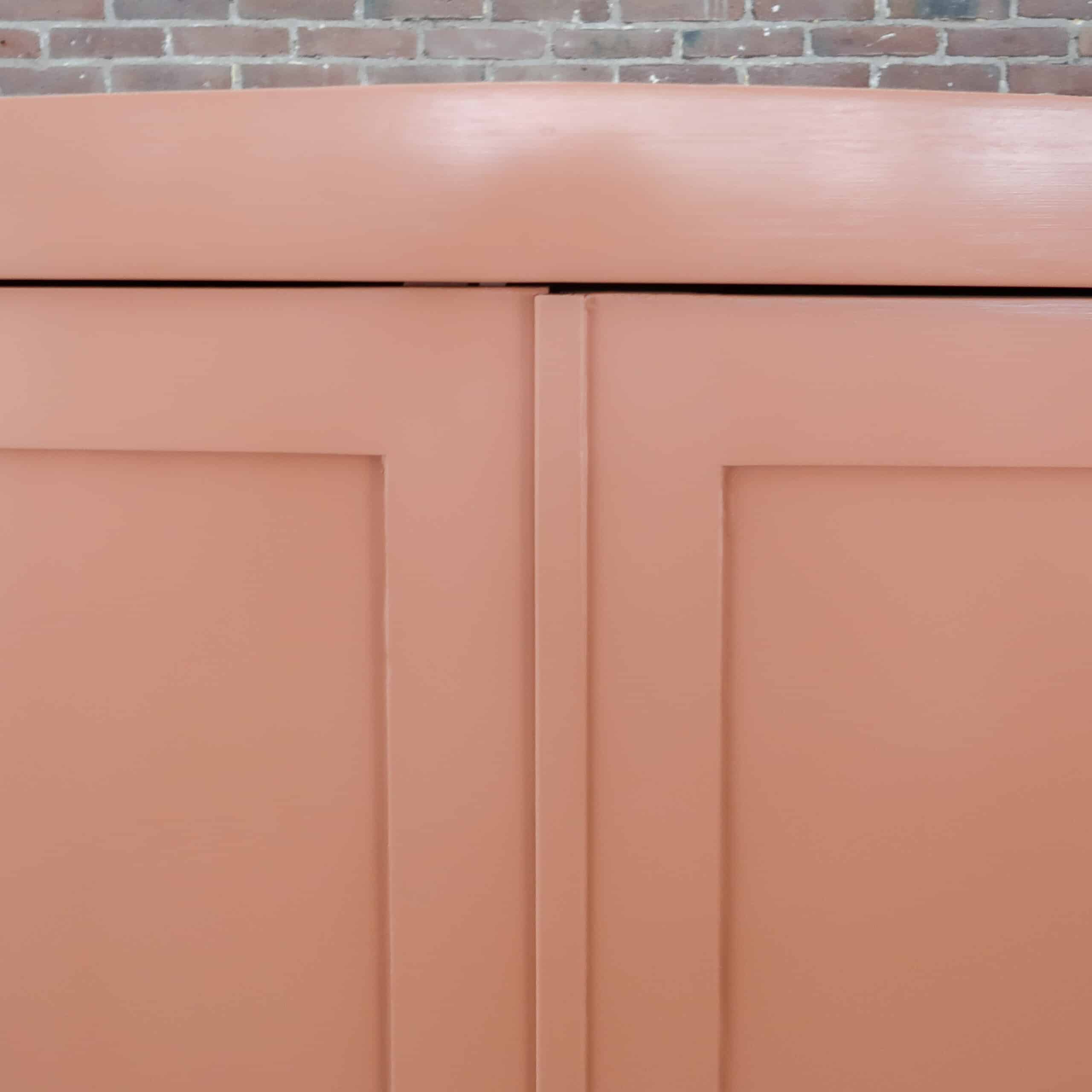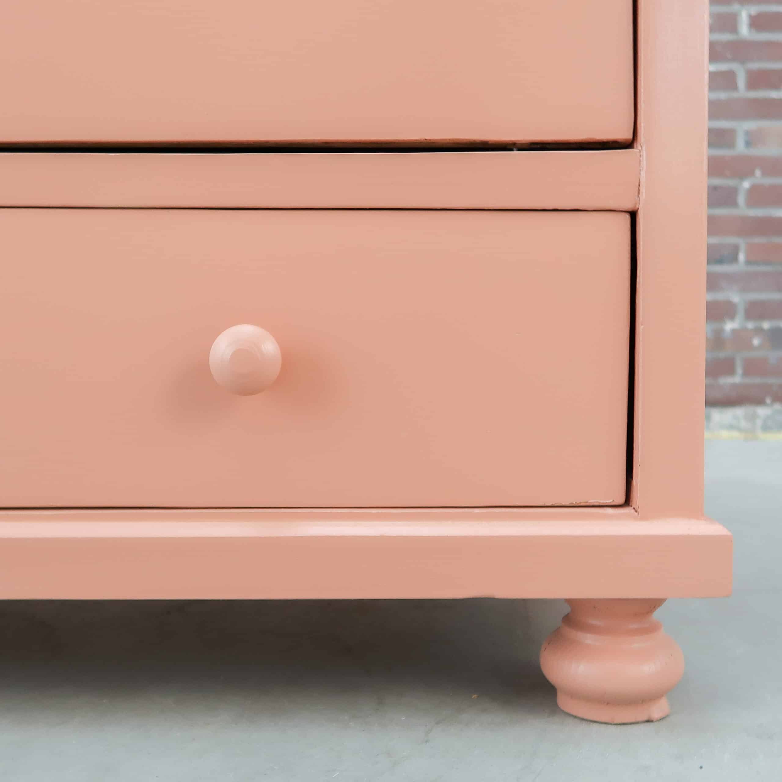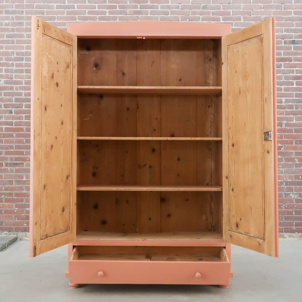 Deze brocante zalmroze linnenkast hebben we opgespeurd en opgeknapt in Hongarije. Zo hebben we haar oa nieuwe planken en een fleurig kleurtje gegeven! Klaar voor een tweede leven.