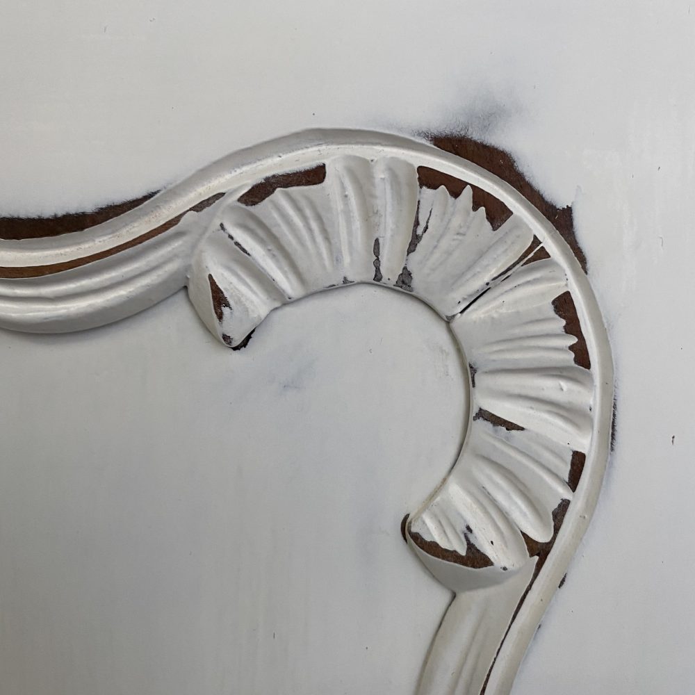 Deze zeer brocante onderkast of badkamerkast is gemaakt van hout. De kast is wit en heeft mooie sierlijke krullen en voorpootjes. De onderkast loopt rond naar voren en heeft bovenin een lade met een slot. De kast heeft een bovenblad gemaakt van grijs marmer. Onderin heeft de kast twee rond gevormde deuren naar een ruimte met een plank.