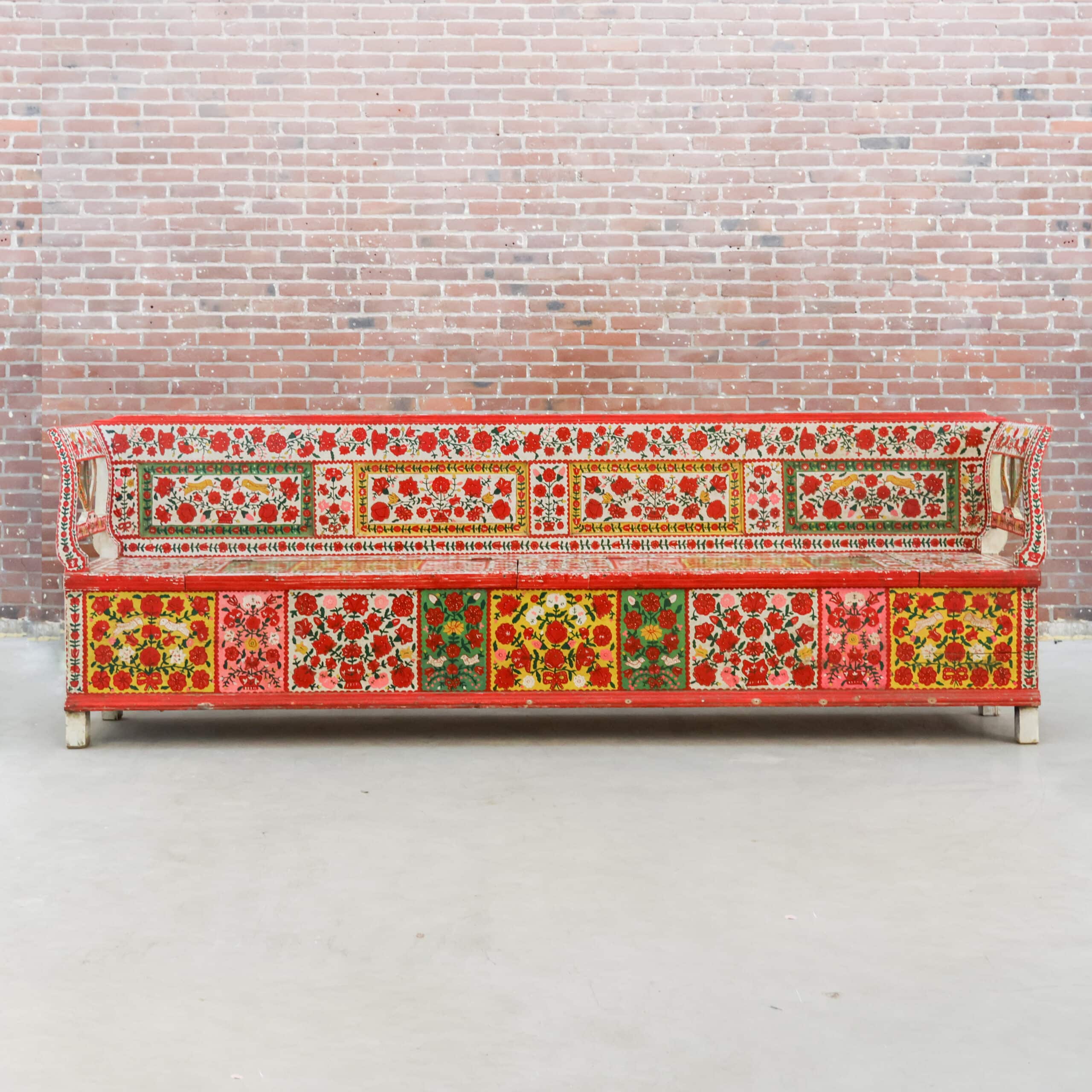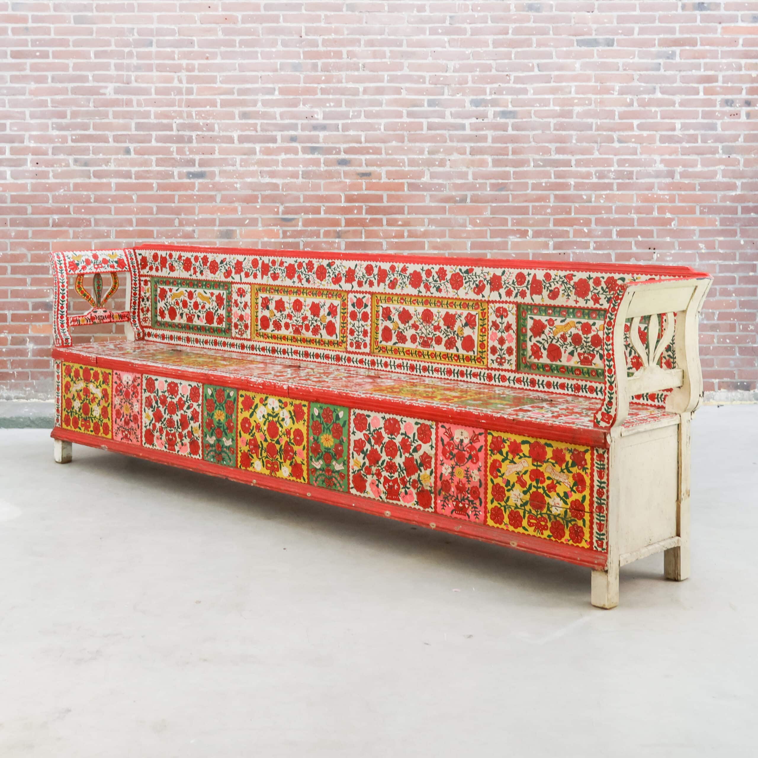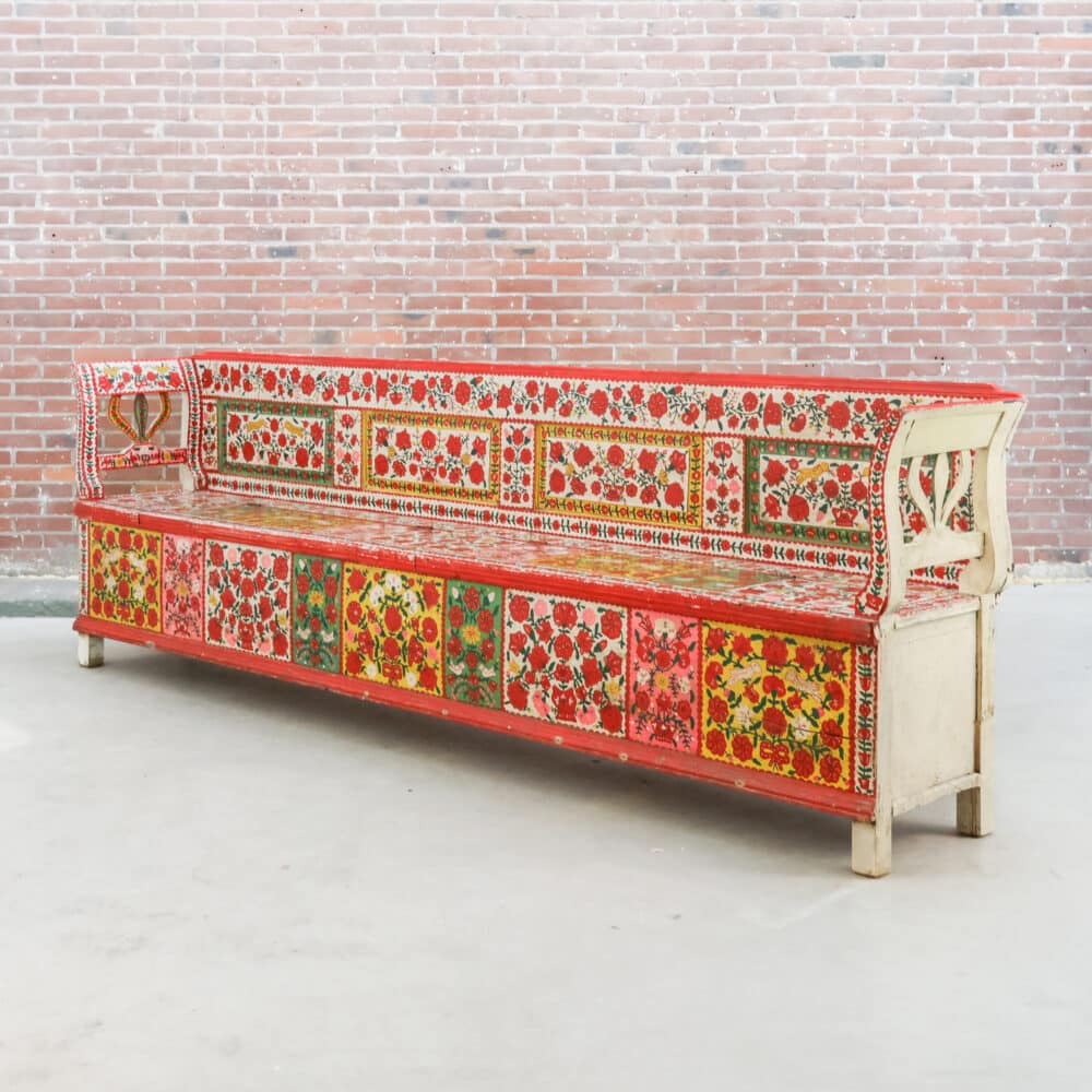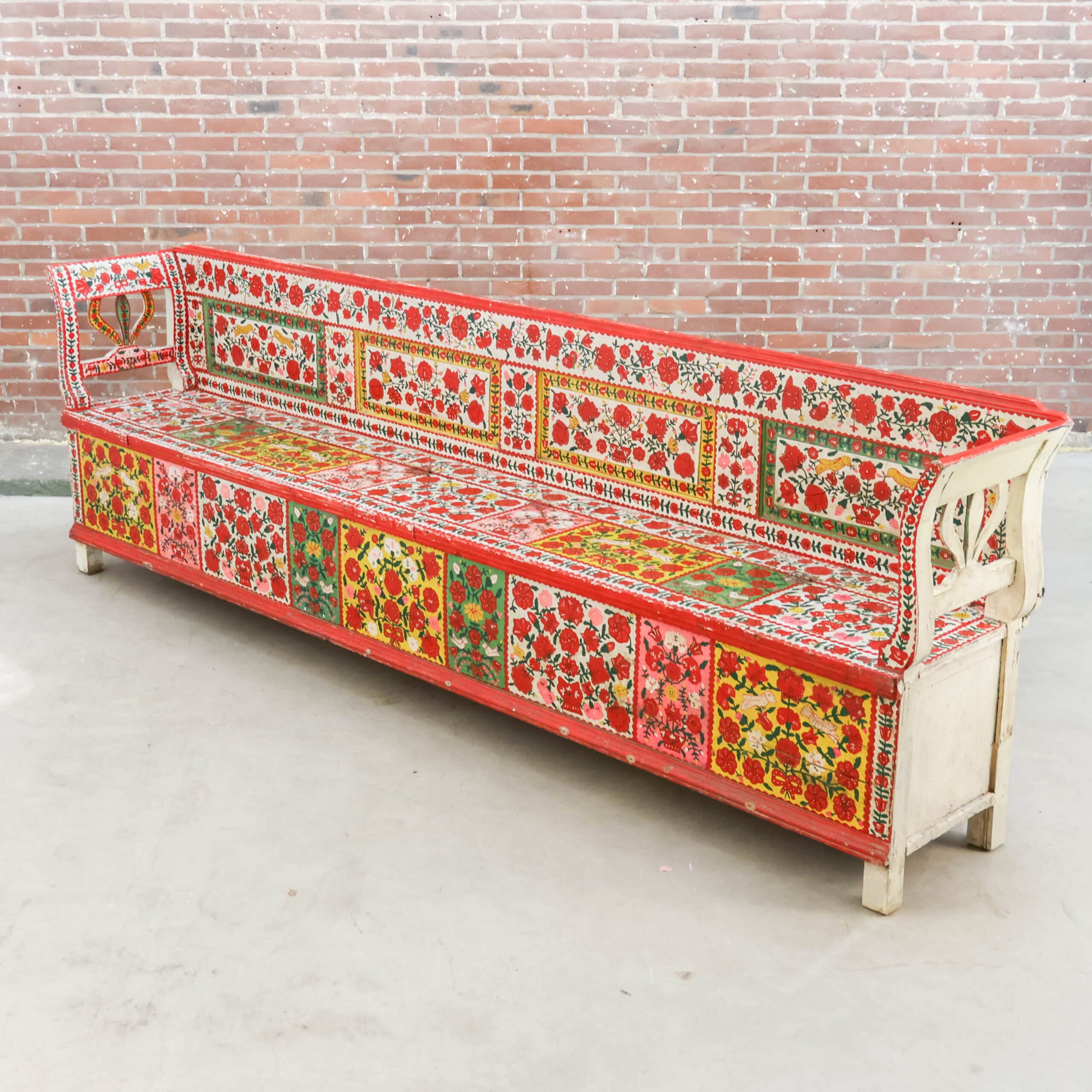 Authentieke antieke Roemeense folkloristische klepbank, rijkelijk versierd met handbeschilderde bloemenmotieven in levendige kleuren. De bank heeft een opklapbare zitting met praktische opbergruimte, zoals traditioneel gebruikelijk was in Oost-Europese boerderijen. Door de kleurrijke patronen en het karaktervolle hout is dit een echte blikvanger met veel geschiedenis en charme. Een bijzonder volkskunst meubel dat warmte en authenticiteit brengt in elk interieur