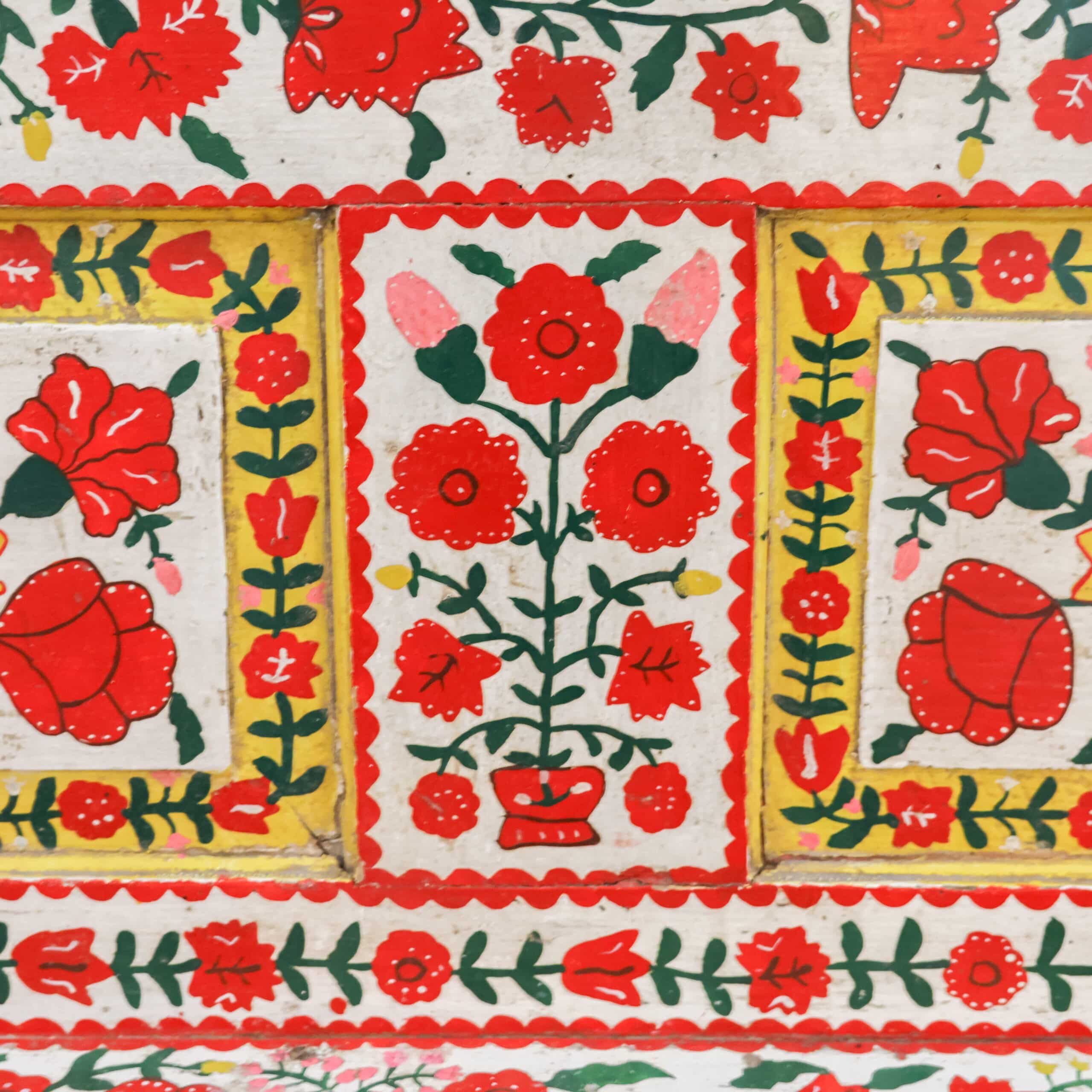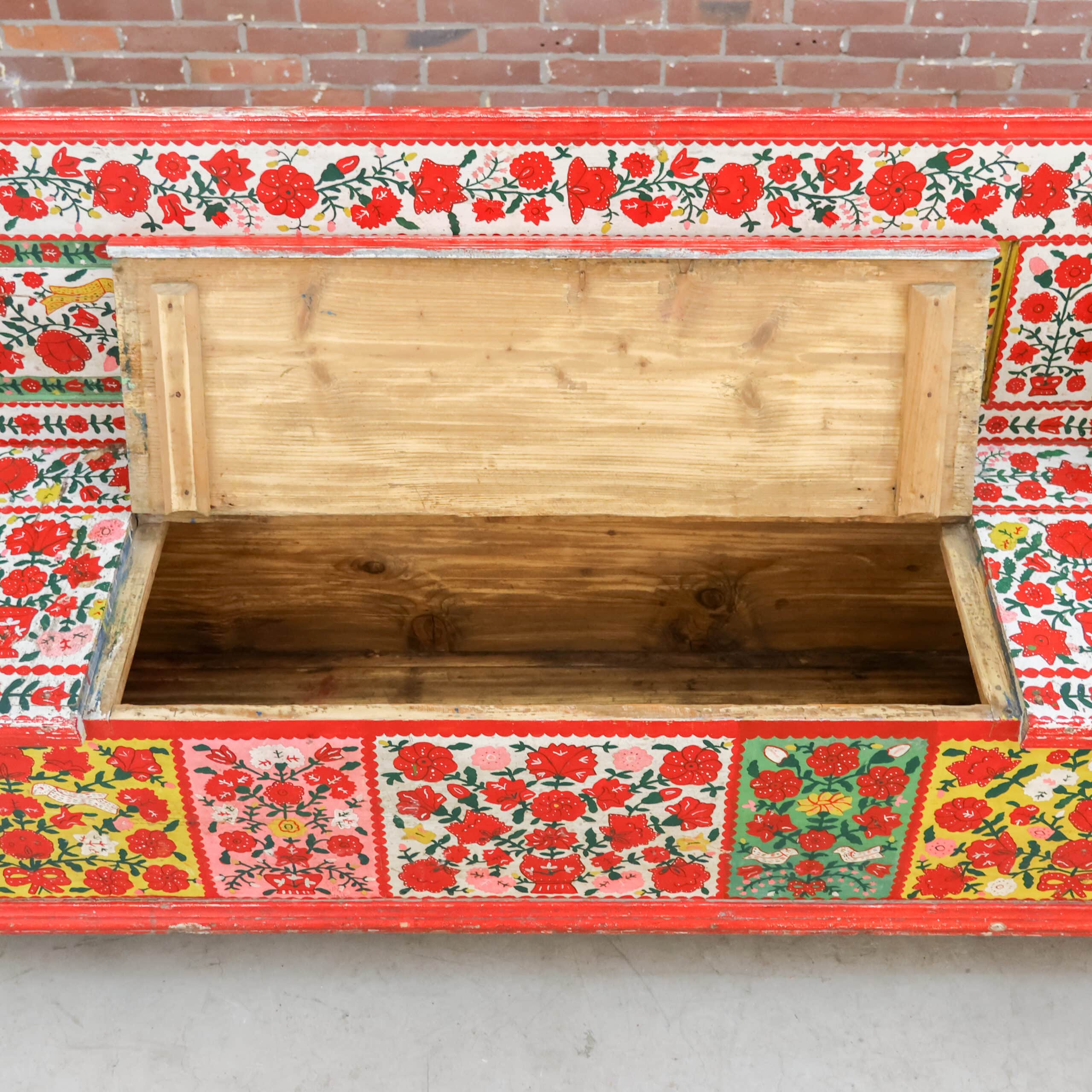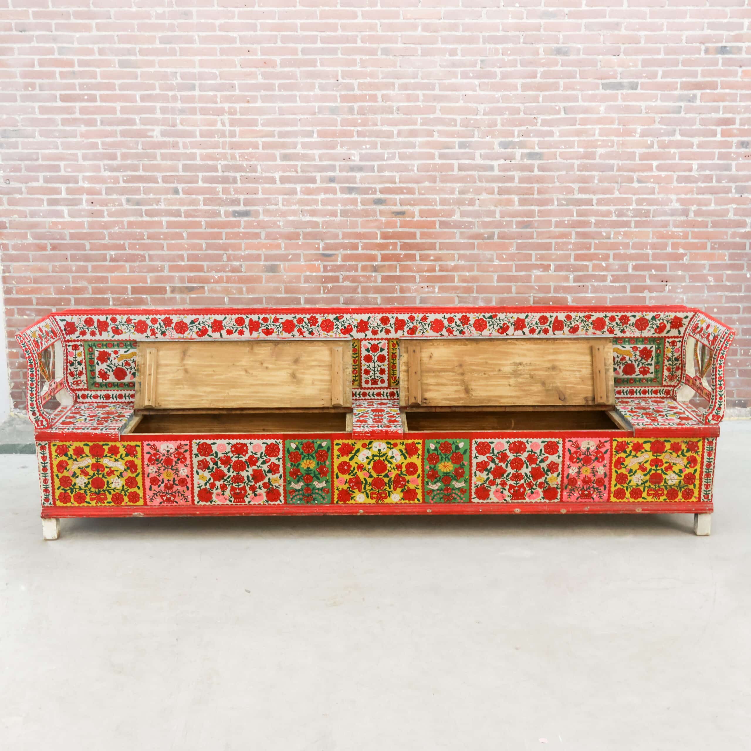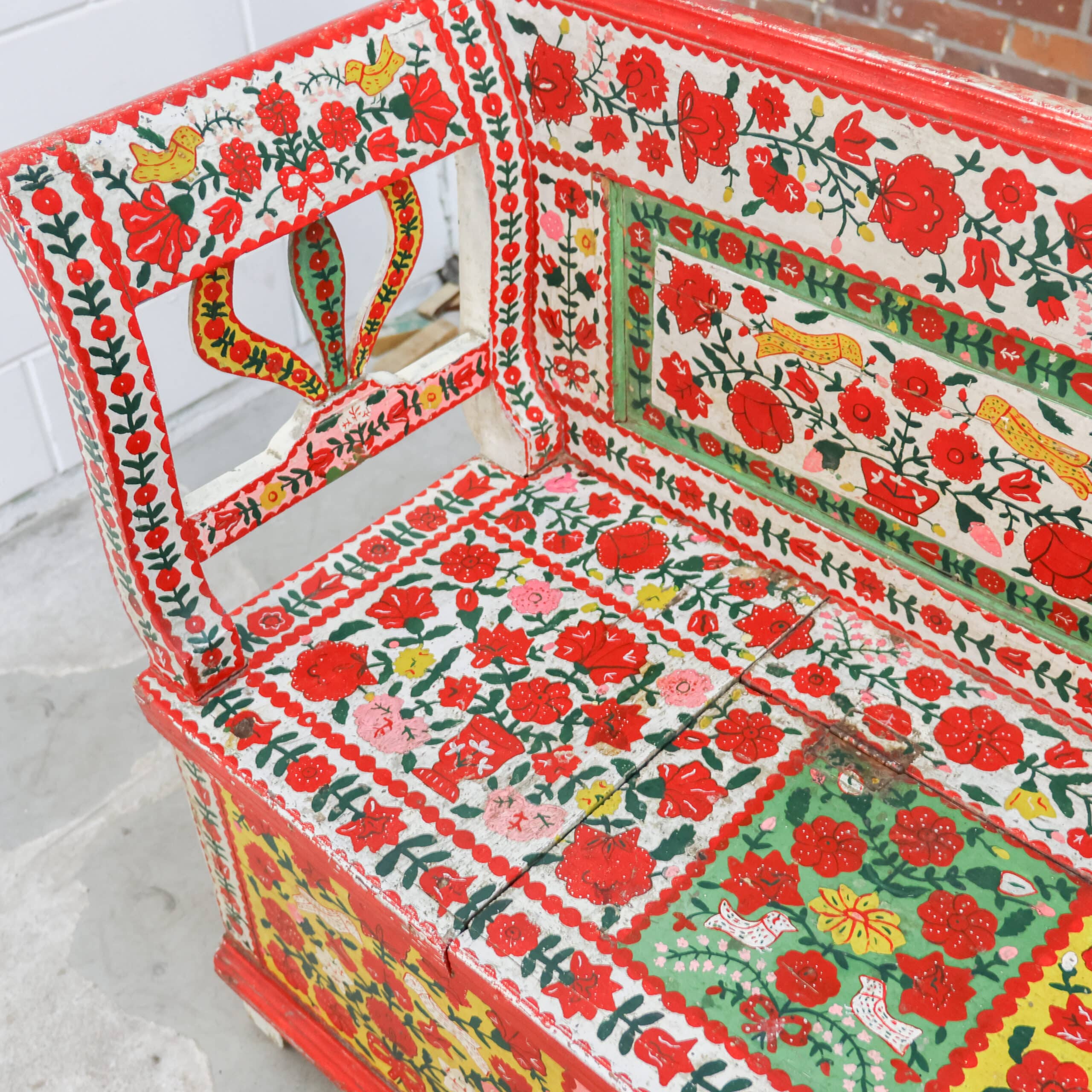 Authentieke antieke Roemeense folkloristische klepbank, rijkelijk versierd met handbeschilderde bloemenmotieven in levendige kleuren. De bank heeft een opklapbare zitting met praktische opbergruimte, zoals traditioneel gebruikelijk was in Oost-Europese boerderijen. Door de kleurrijke patronen en het karaktervolle hout is dit een echte blikvanger met veel geschiedenis en charme. Een bijzonder volkskunst meubel dat warmte en authenticiteit brengt in elk interieur