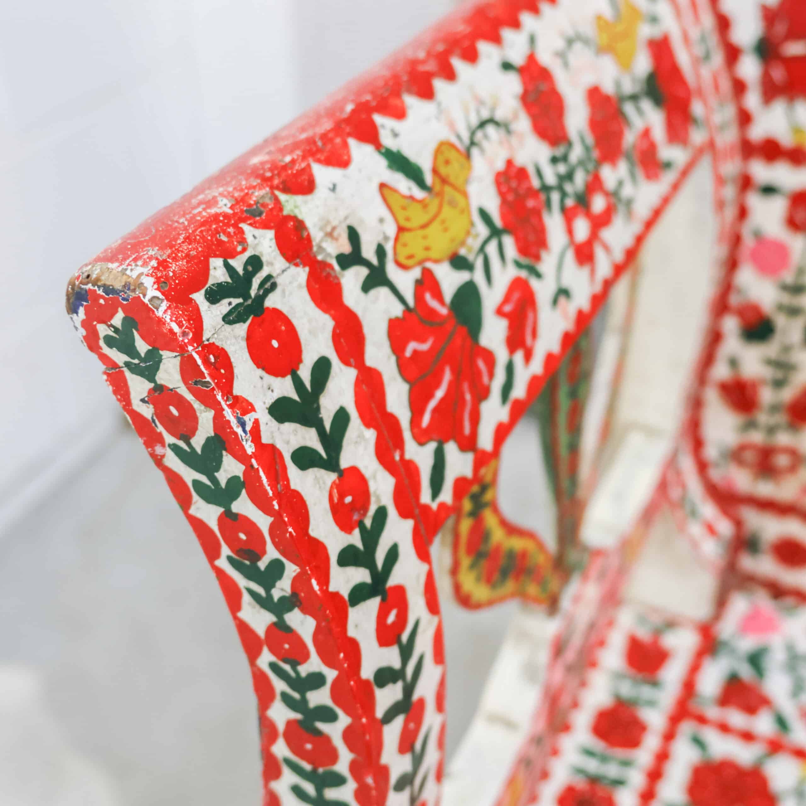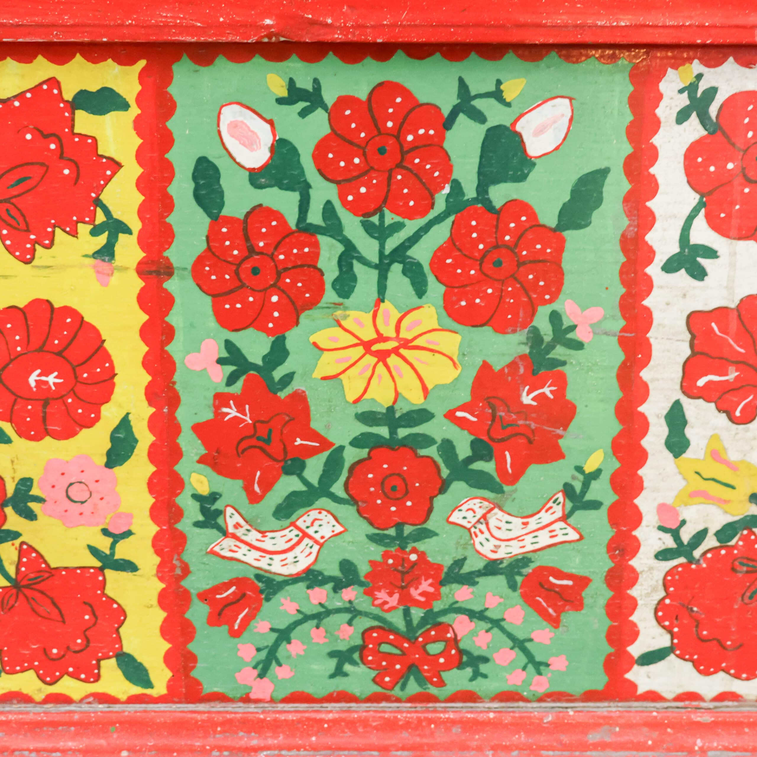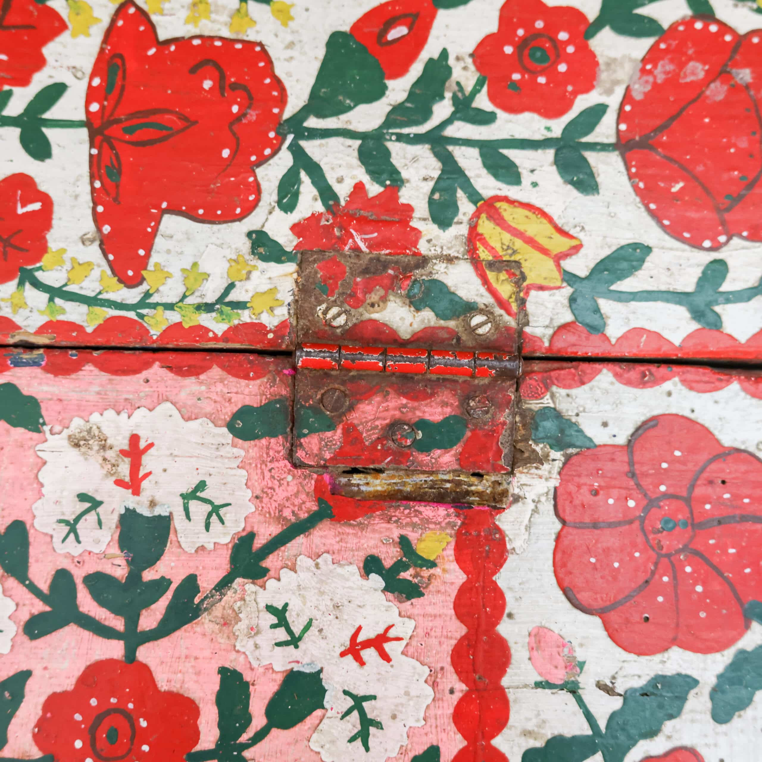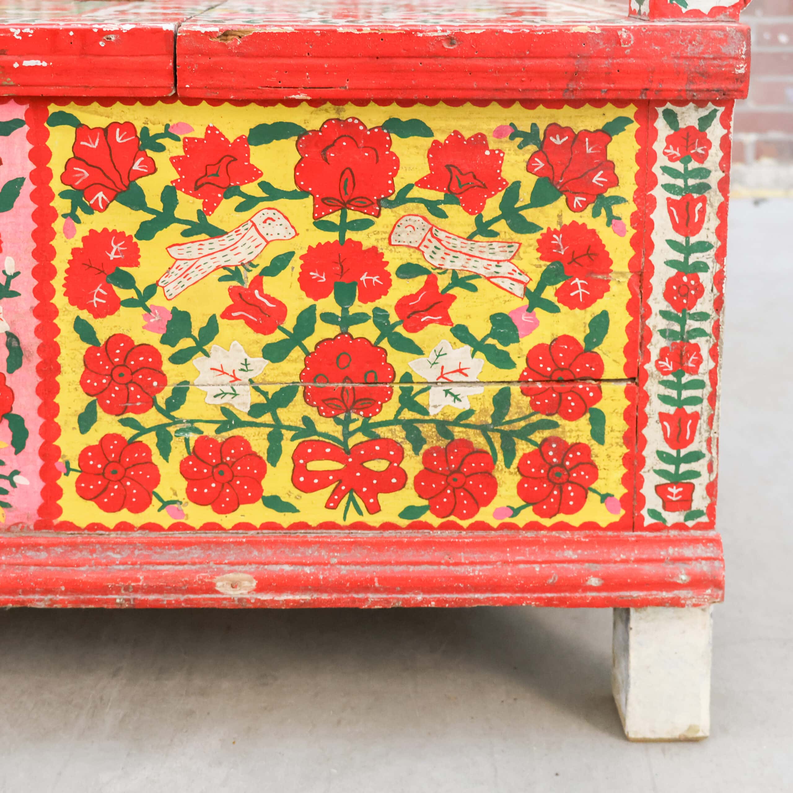Authentieke antieke Roemeense folkloristische klepbank, rijkelijk versierd met handbeschilderde bloemenmotieven in levendige kleuren. De bank heeft een opklapbare zitting met praktische opbergruimte, zoals traditioneel gebruikelijk was in Oost-Europese boerderijen. Door de kleurrijke patronen en het karaktervolle hout is dit een echte blikvanger met veel geschiedenis en charme. Een bijzonder volkskunst meubel dat warmte en authenticiteit brengt in elk interieur
