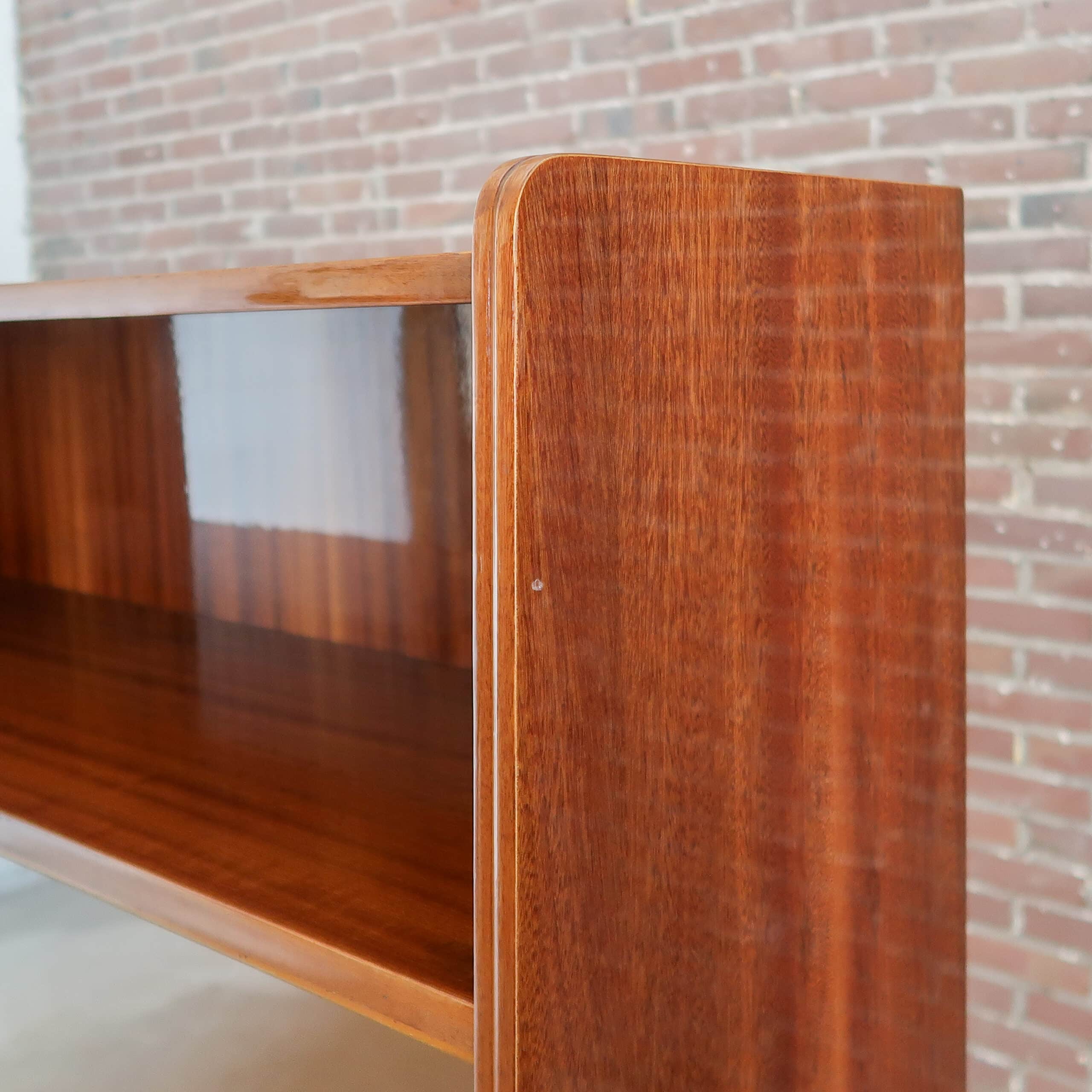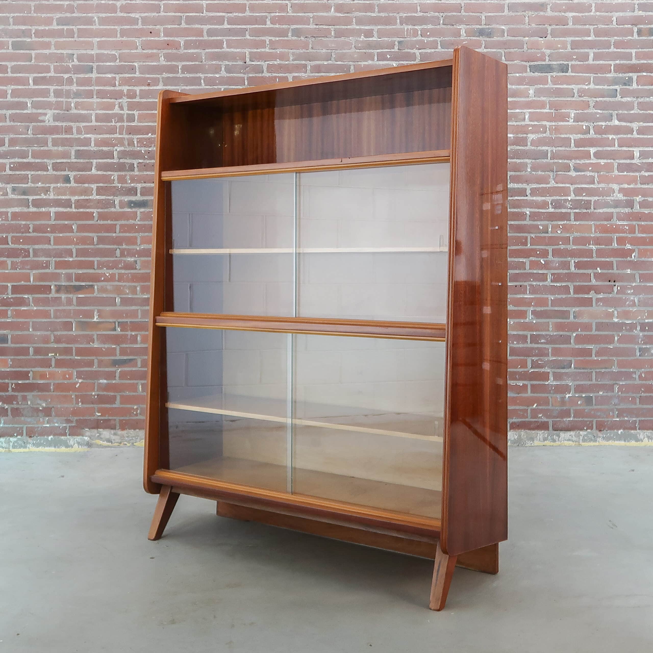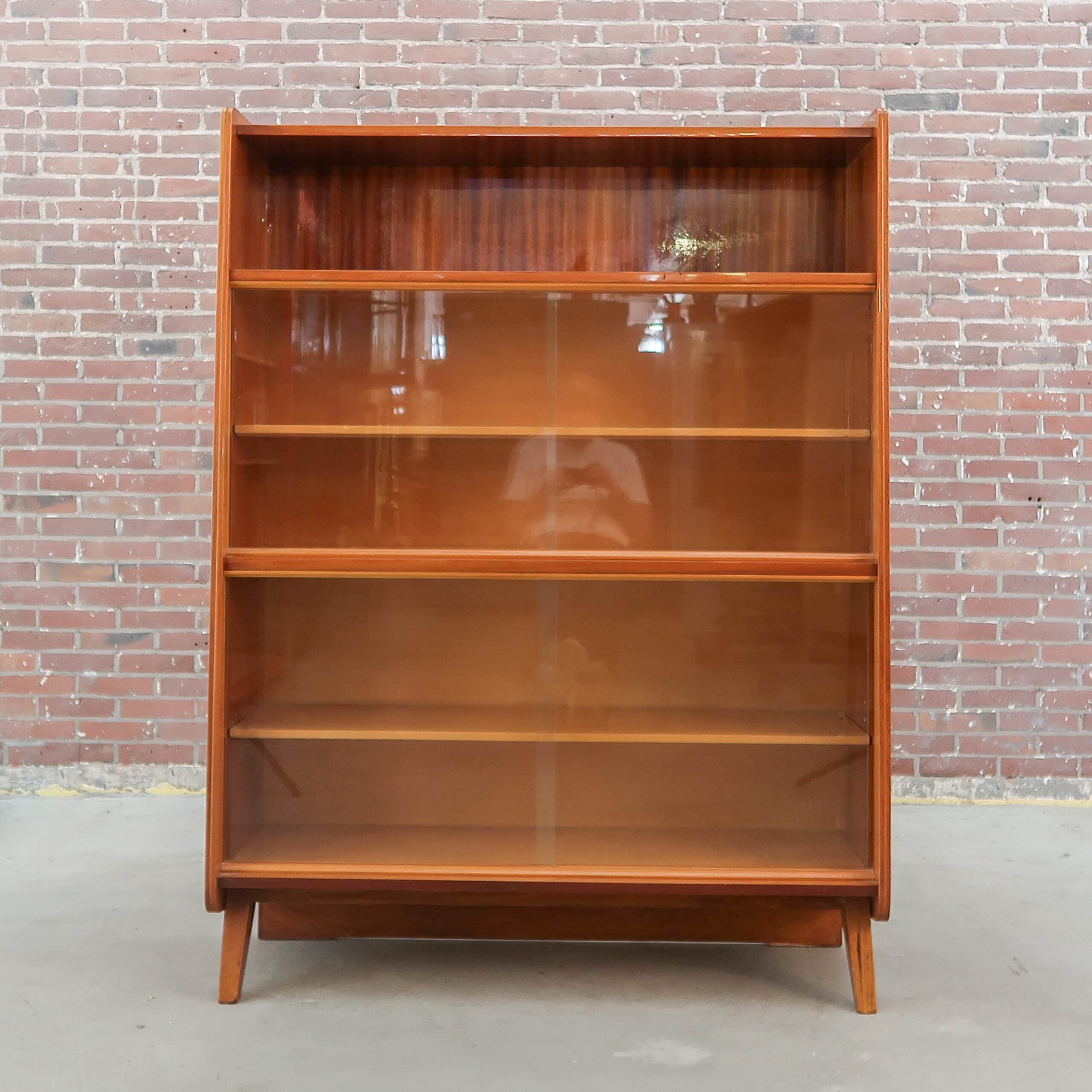 Vintage boekenkast van Tatra Nábytok, Tsjechoslowakije, jaren ’60. Strak ontwerp met schuifdeuren van glas en drie royale legplanken. De schuine poten en lichte lijnen geven het meubel een elegante mid-century uitstraling. Een praktisch en stijlvol stuk dat zowel als boekenkast of vitrinekast gebruikt kan worden.