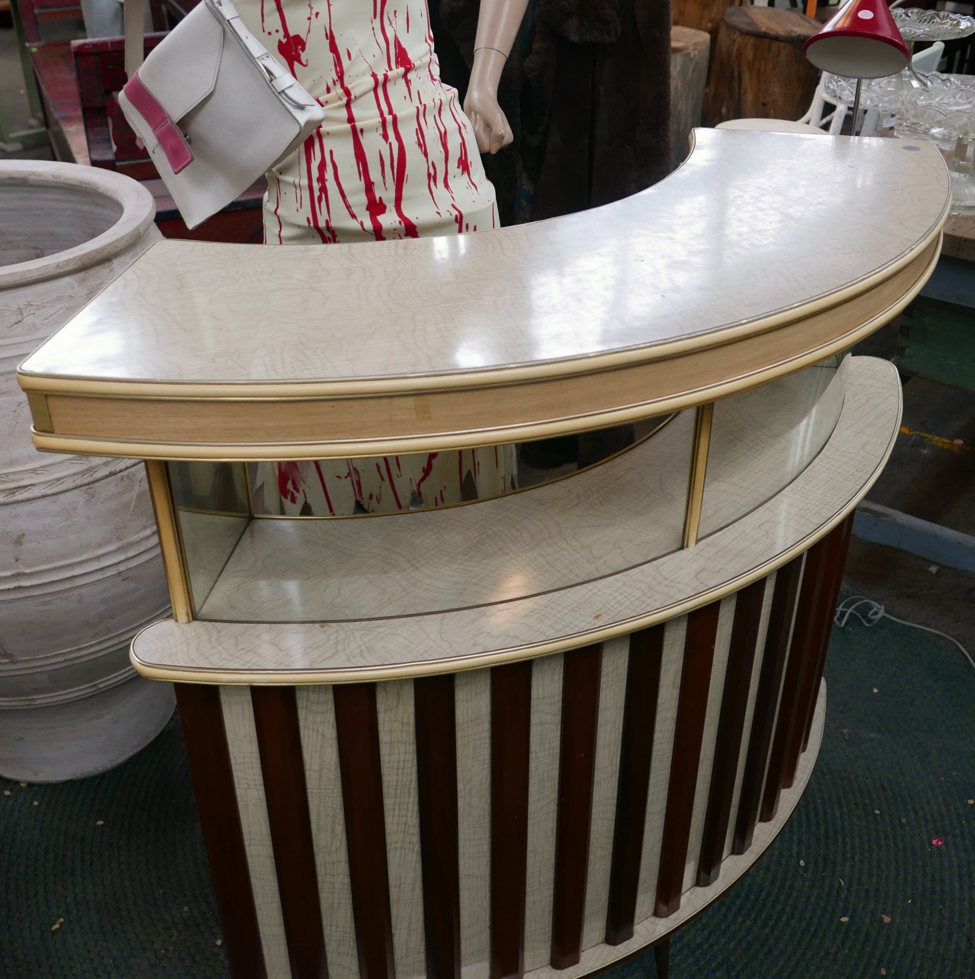 Prachtige vintage cocktail bar of balie. De bar heeft een ronde vorm en is gemaakt van formica. De bar heeft jaren’50 metalen poten. De voorkant van de bar is bekleed met houten delen. De bar heeft een ronde glazen vitrine. Aan de achterkant heeft hij onder het formica blad een lade met retro knop. Ook is hij voorzien van verlichting en een elektrisch snoer om de lampjes aan te zetten.