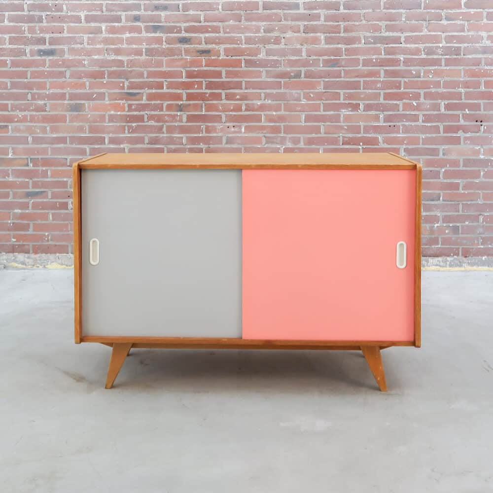 Deze prachtige jaren-60 schuifdeurenkast combineert speelse pastelkleuren met een strakke, minimalistische vorm. De kast heeft twee soepel schuivende deuren, originele uitsparingsgrepen en het kenmerkende schuine pootje van Midden-/Oost-Europese vintage. Binnenin biedt hij verrassend veel opbergruimte met verstelbare legplanken.