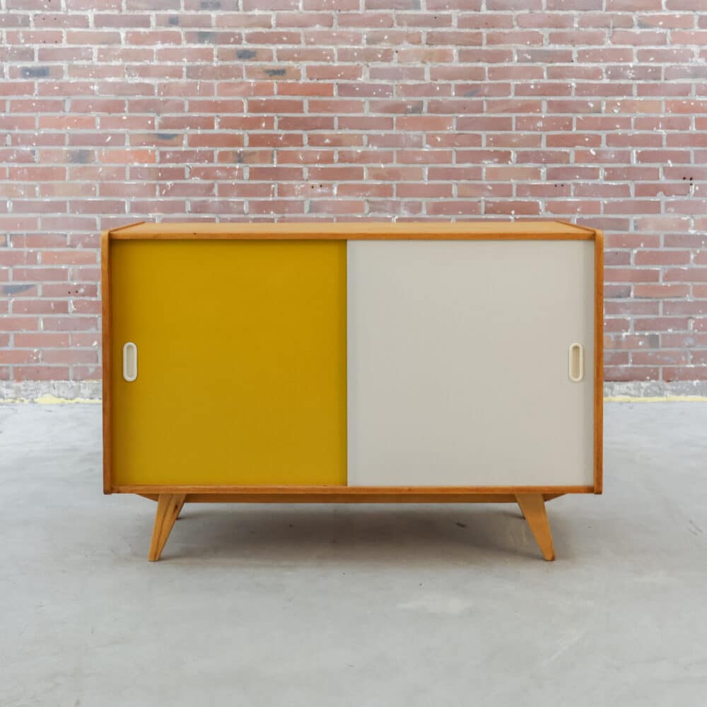 Vintage mid-century dressoir uit de jaren ’60 met speelse schuifdeuren in warm geel en zacht wit. Het slanke silhouet en de schuine pootjes geven het meubel die typische luchtige Oostblok uitstraling. Binnenin biedt het kastje praktische opbergruimte met een prachtig warm houtfineer dat mooi contrasteert met de frisse fronten. Een karaktervol statement piece dat meteen sfeer brengt in een modern, vintage of eclectisch interieur.