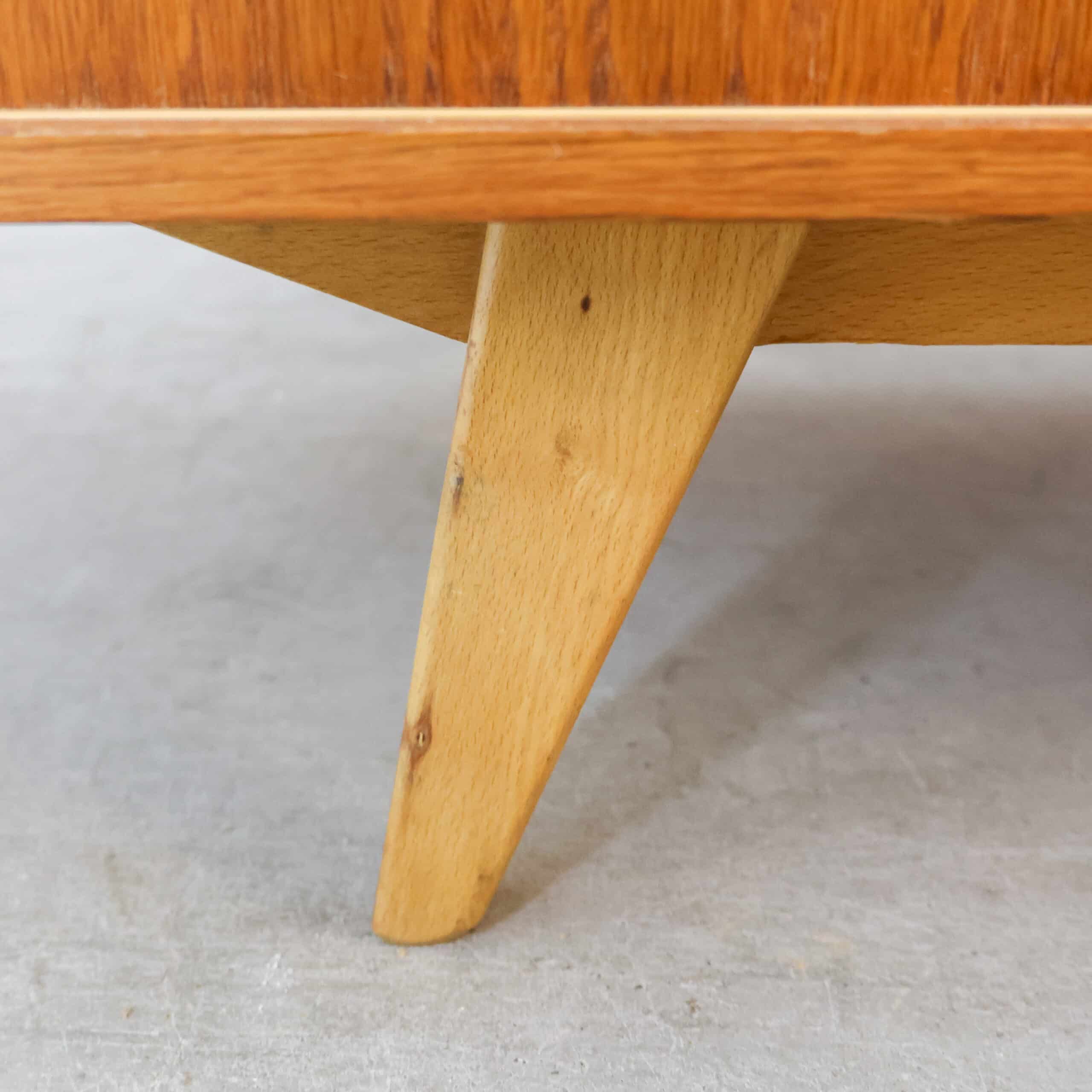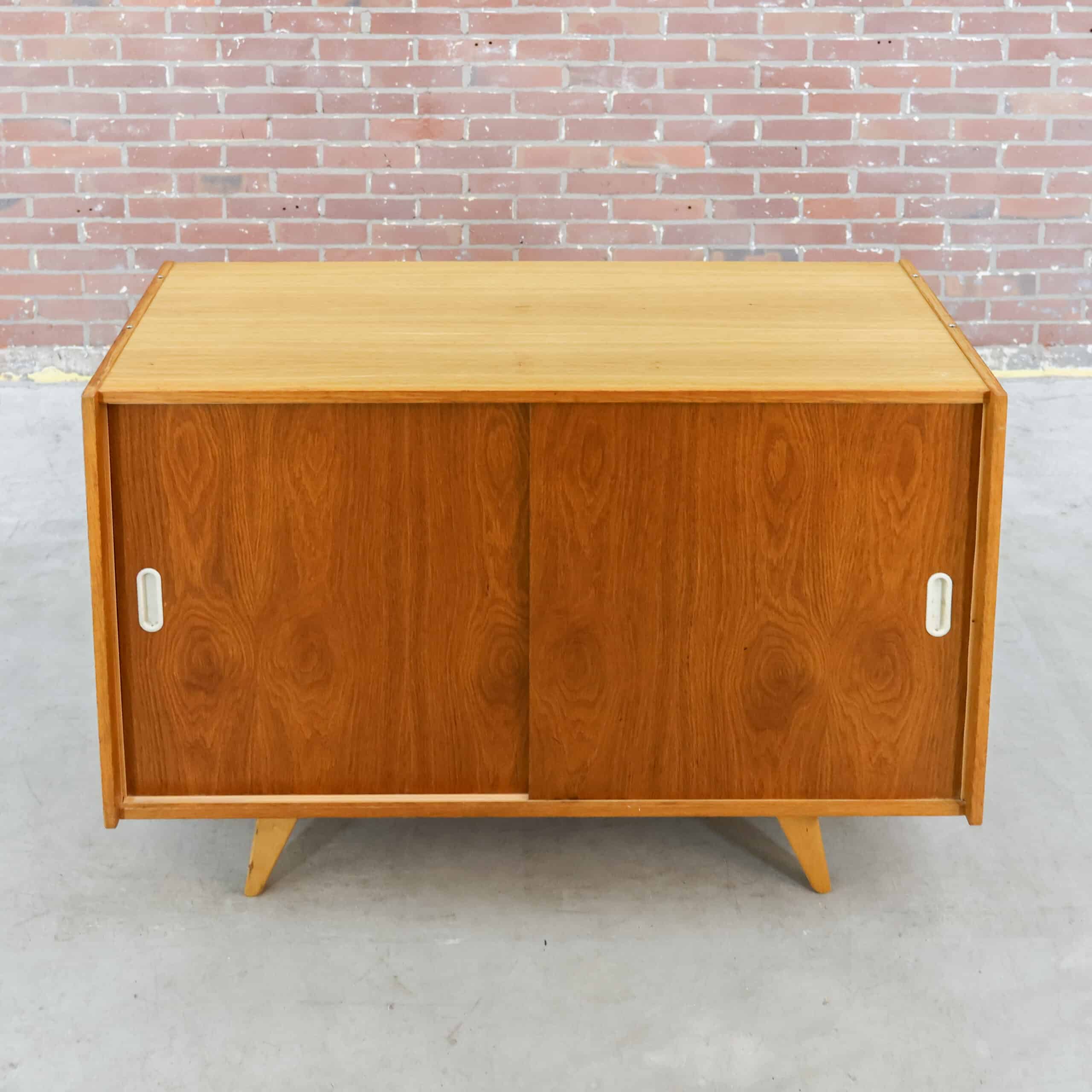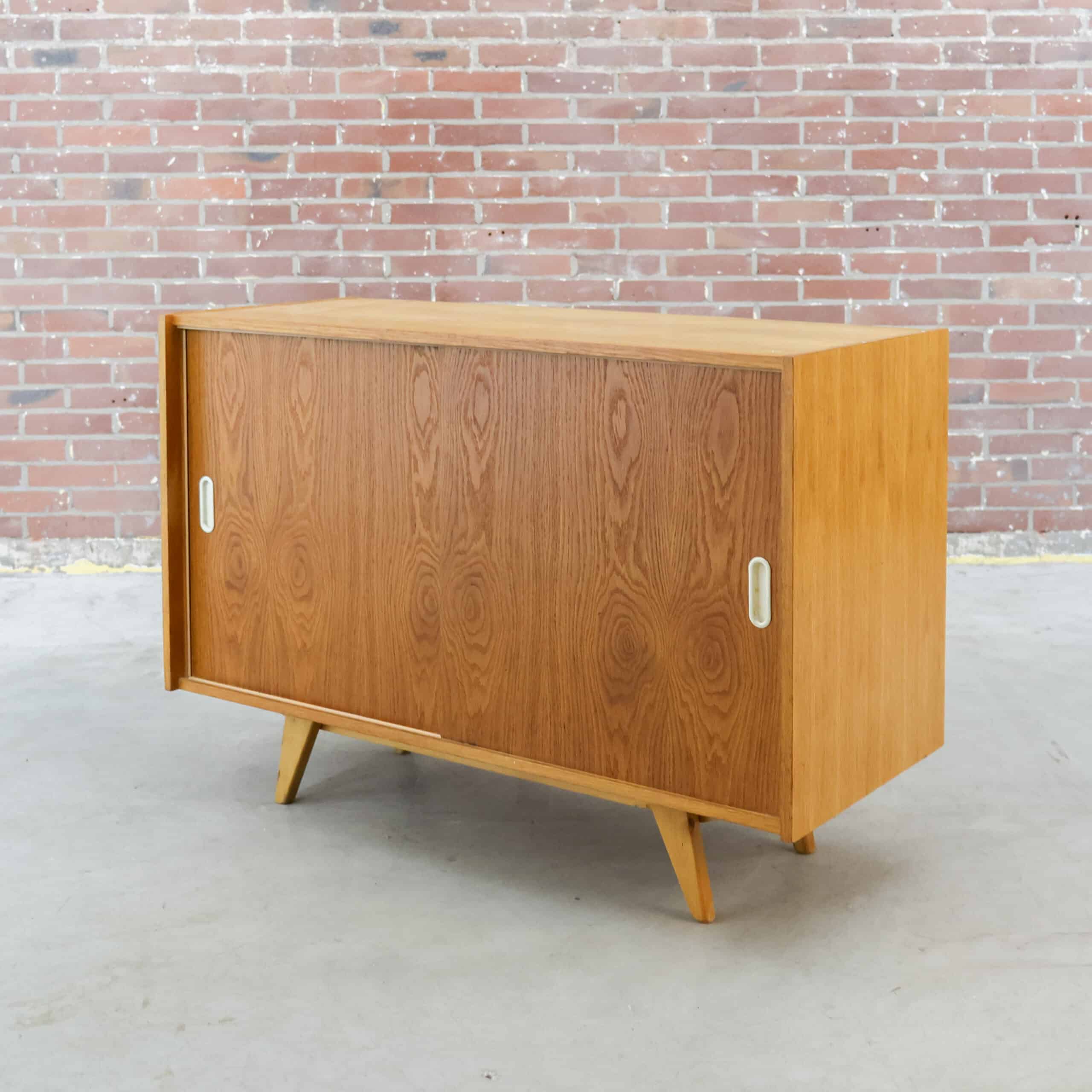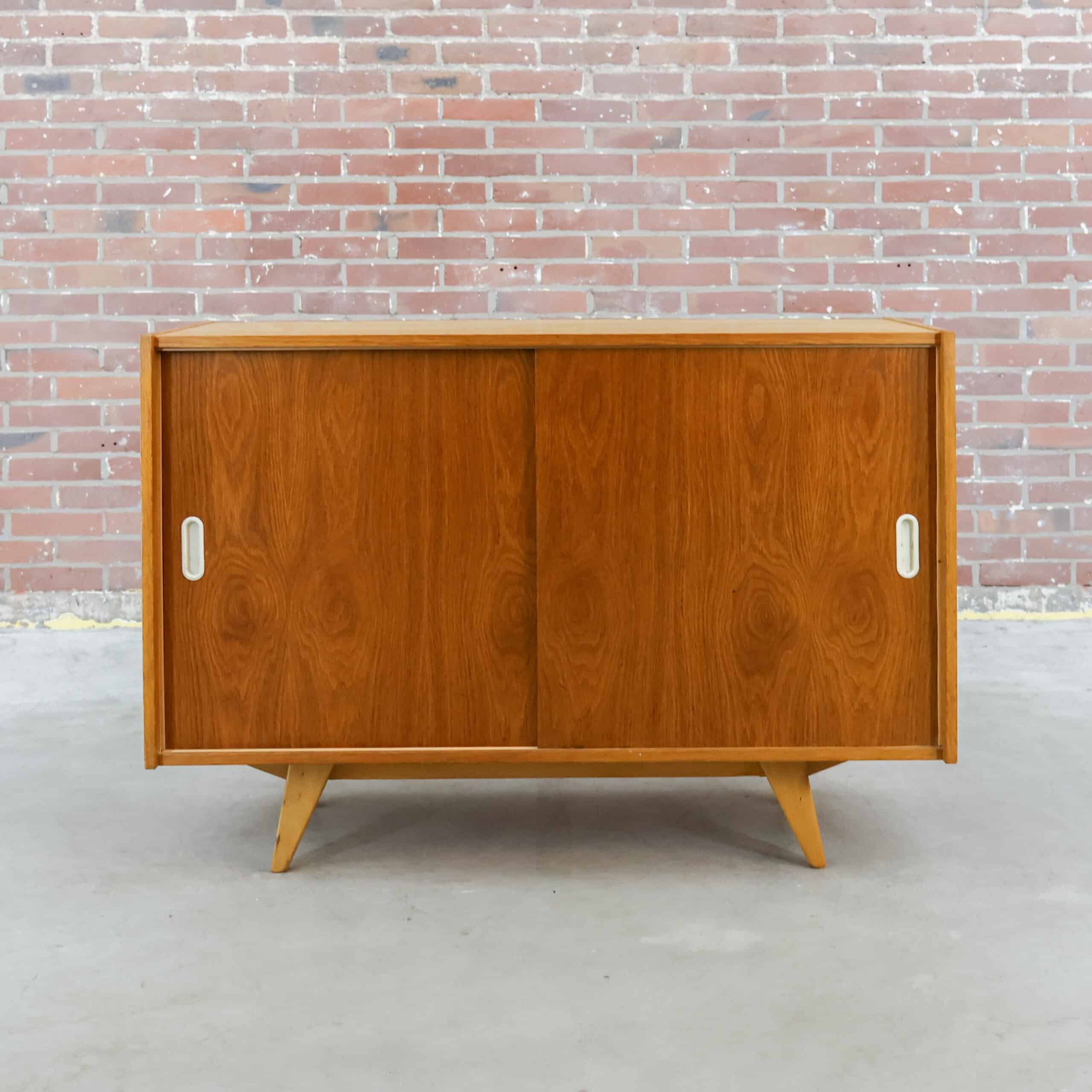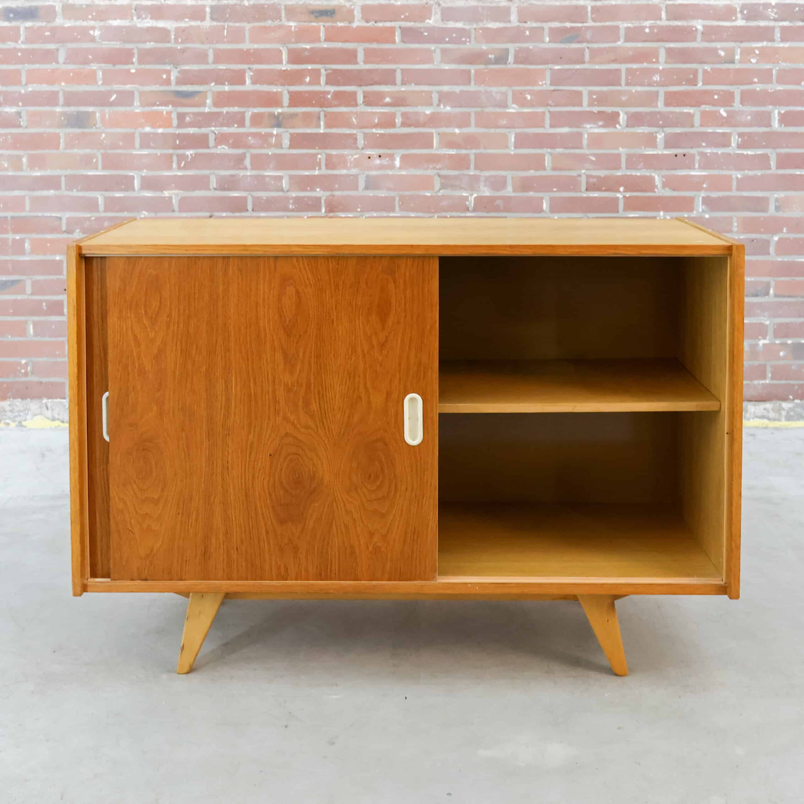 Strak, tijdloos en functioneel: dit vintage dressoir van Interier Praha (model U-452) komt uit de jaren 60. Gemaakt in Tsjecho-Slowakije met schuivende deuren en een warm houten fineer. Het minimalistische ontwerp en de schuine poten geven ‘m die echte mid-century uitstraling. Perfect als tv-meubel, opbergkast of stijlvol accent in je interieur.