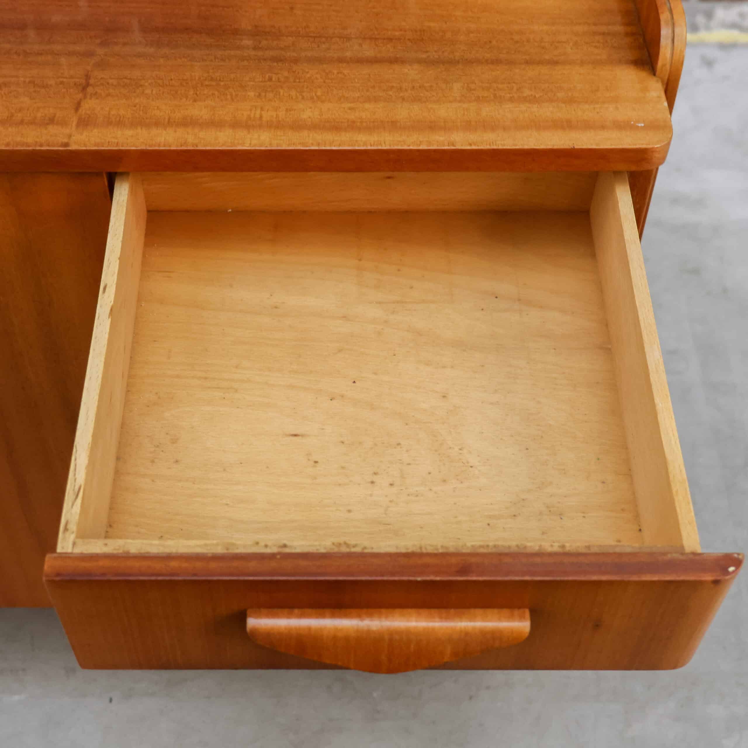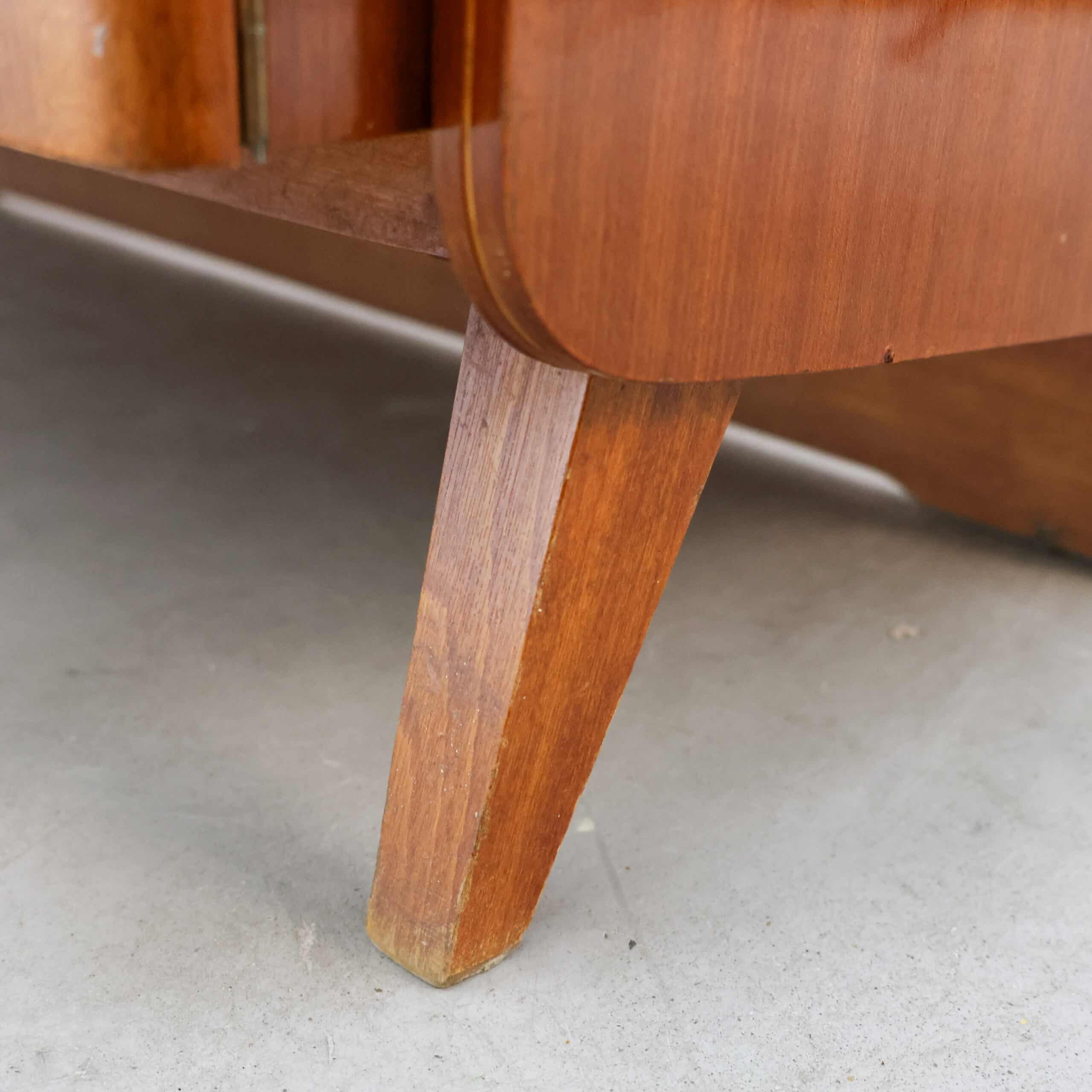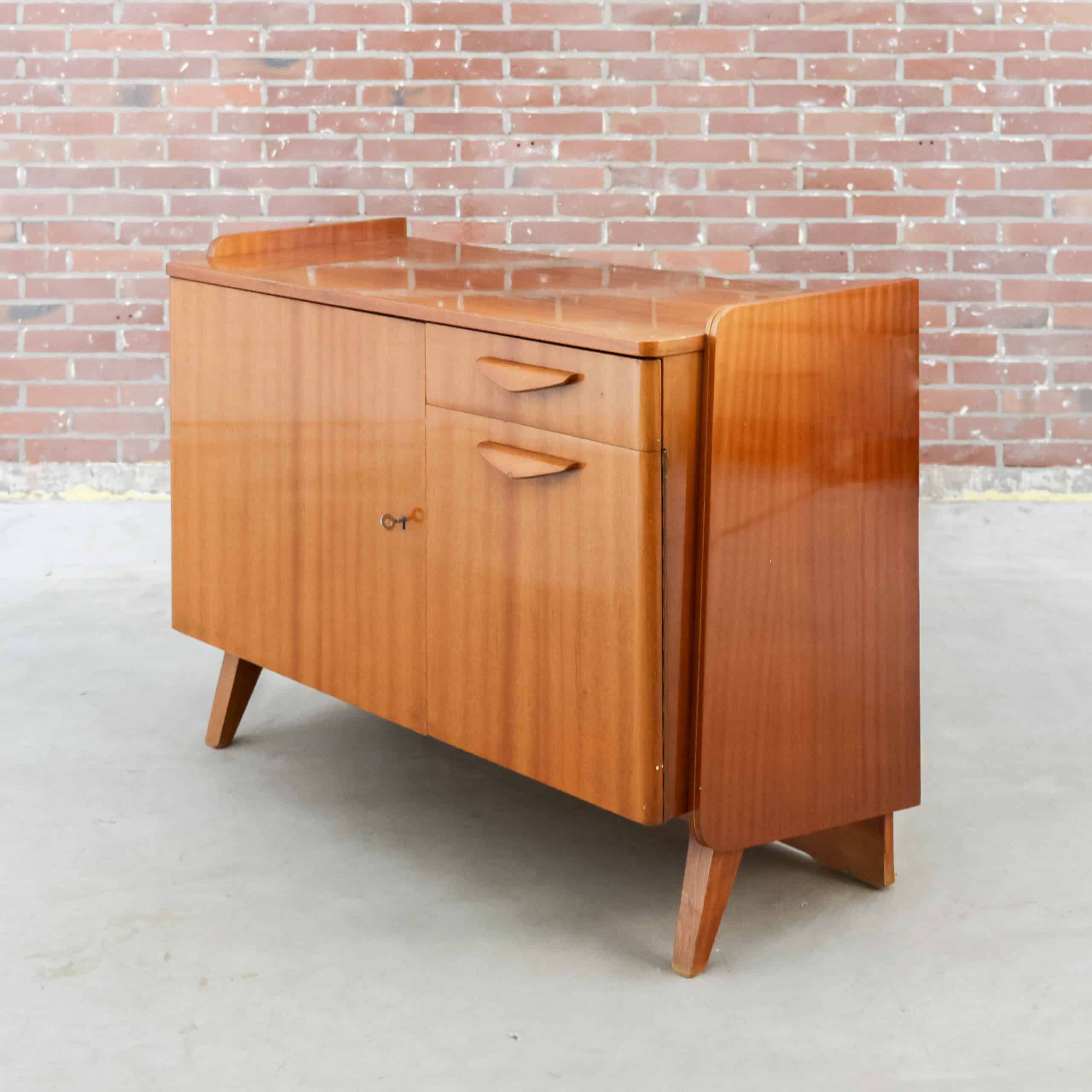 Prachtig vintage dressoir van Tatra Nábytok uit de jaren ’70, met warm bruin fineer en slanke schuine pootjes. Het oorspronkelijke Skrinka pod televizor ontwerp is nu perfect als opbergkast of sidetable. Subtiele verwering geeft het meubel extra charme en karakter. Een stijlvol stukje Oostblok mid-century design voor in elk interieur.
