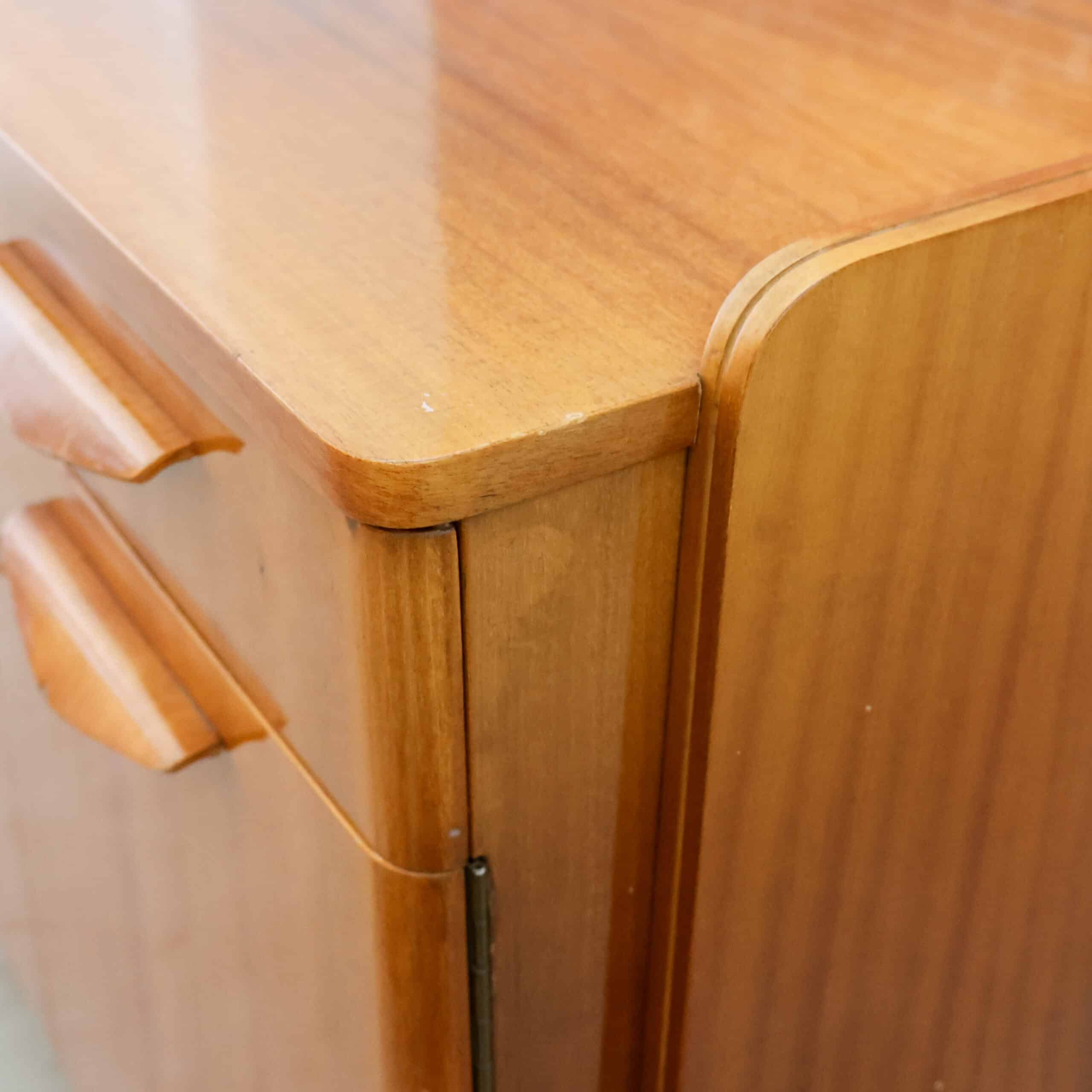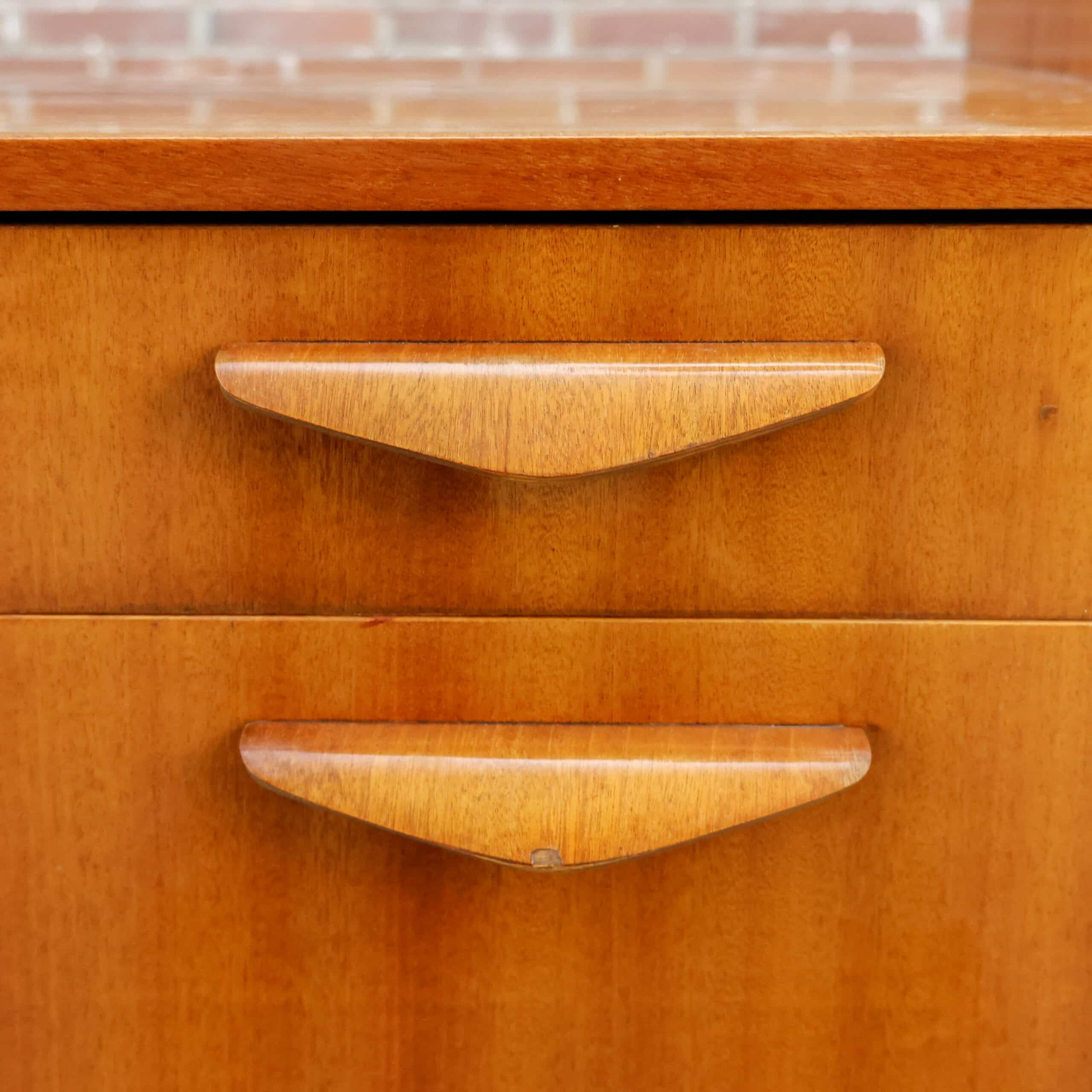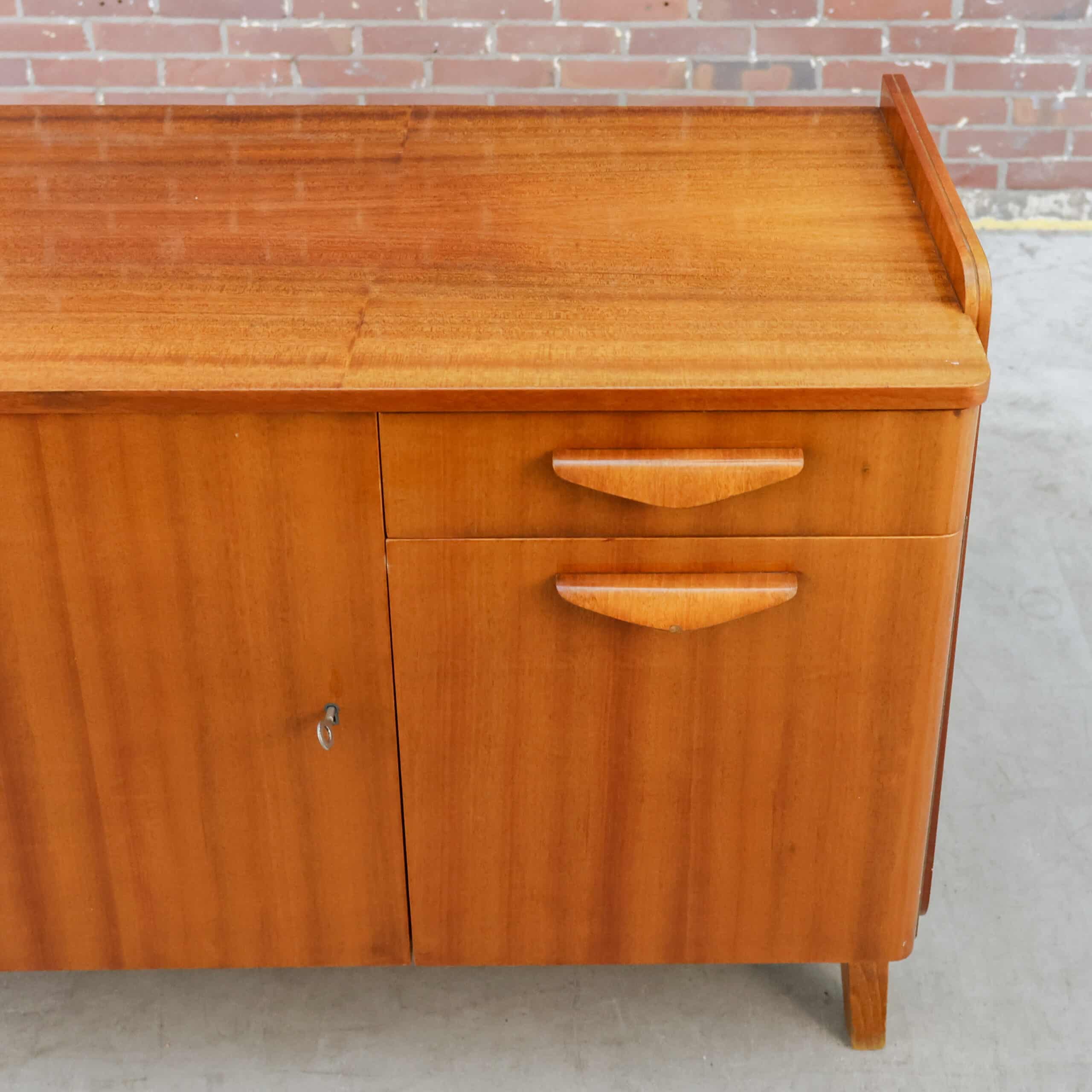 Prachtig vintage dressoir van Tatra Nábytok uit de jaren ’70, met warm bruin fineer en slanke schuine pootjes. Het oorspronkelijke Skrinka pod televizor ontwerp is nu perfect als opbergkast of sidetable. Subtiele verwering geeft het meubel extra charme en karakter. Een stijlvol stukje Oostblok mid-century design voor in elk interieur.