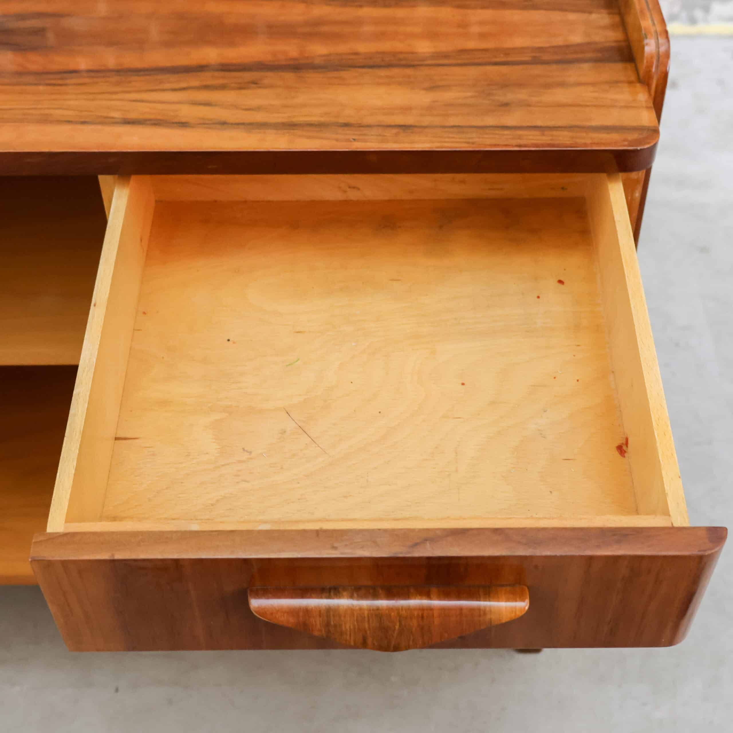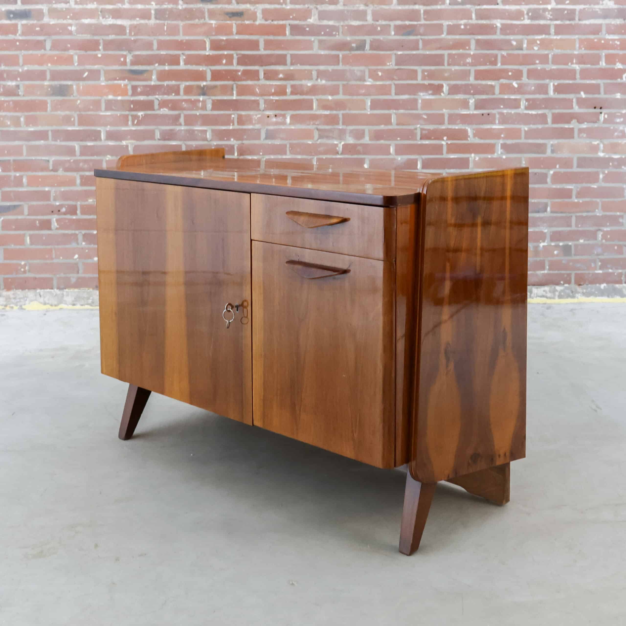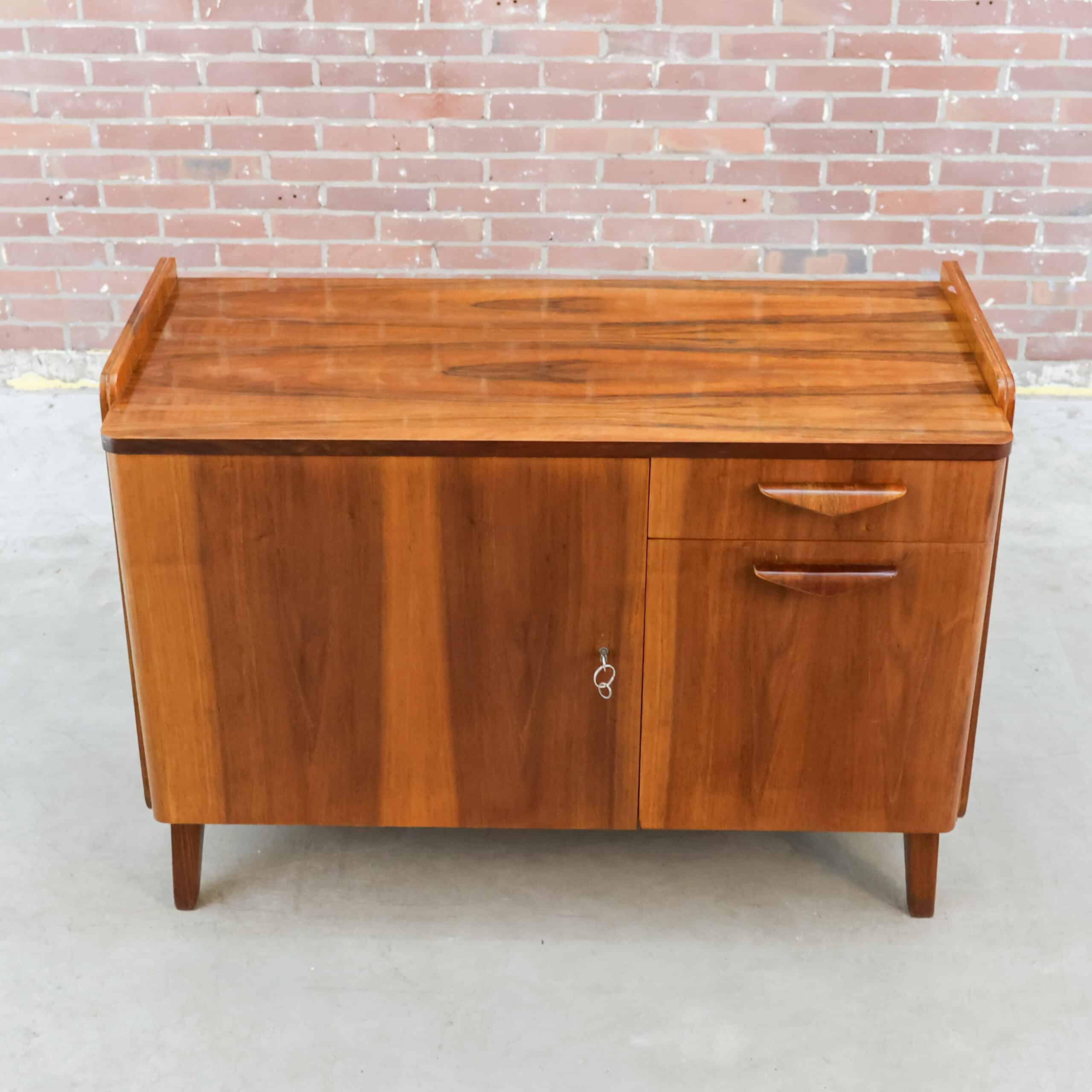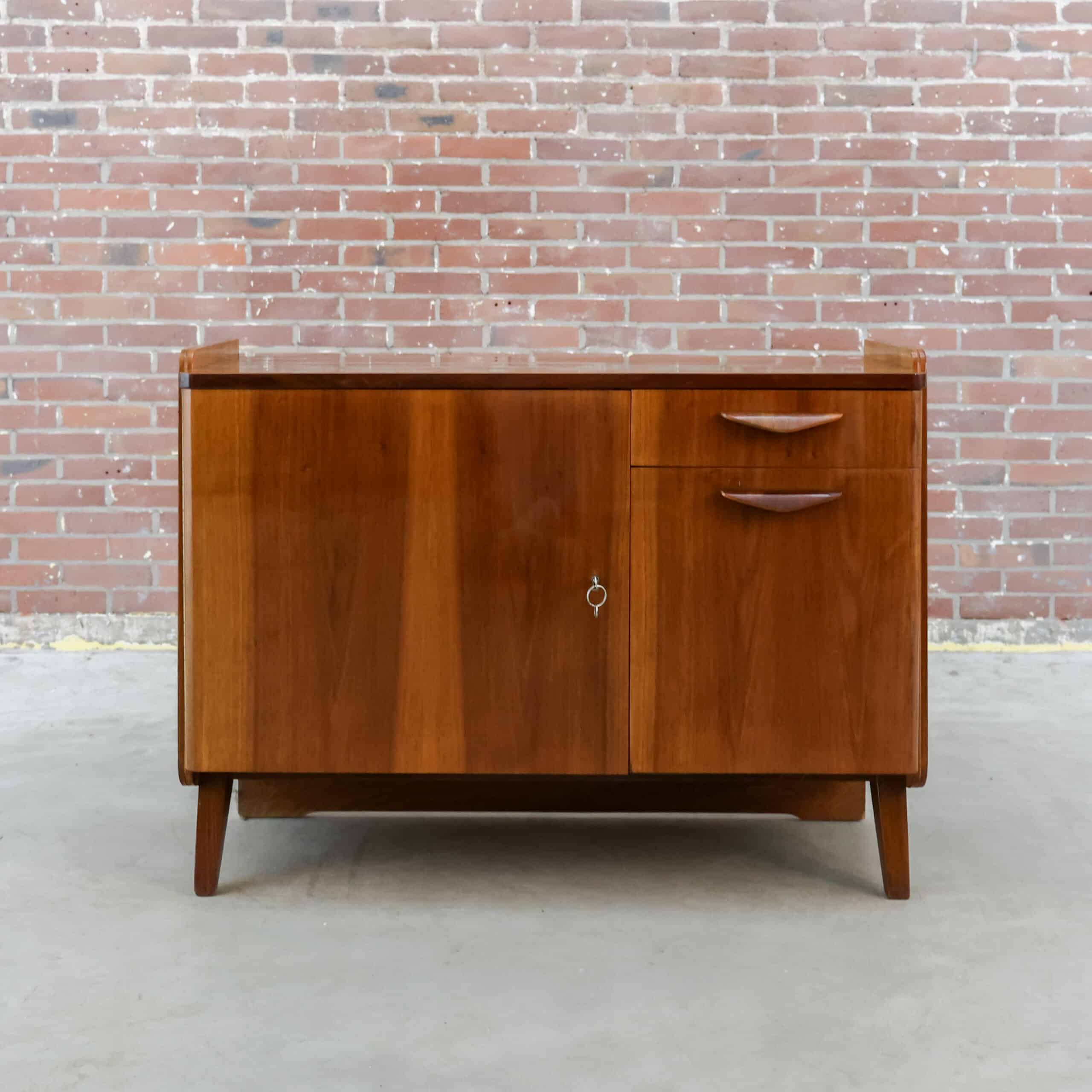 Prachtig vintage dressoir van Tatra Nábytok uit de jaren ’70, met warm bruin fineer en slanke schuine pootjes. Het oorspronkelijke Skrinka pod televizor ontwerp is nu perfect als opbergkast of sidetable. Subtiele verwering geeft het meubel extra charme en karakter. Een stijlvol stukje Oostblok mid-century design voor in elk interieur.
