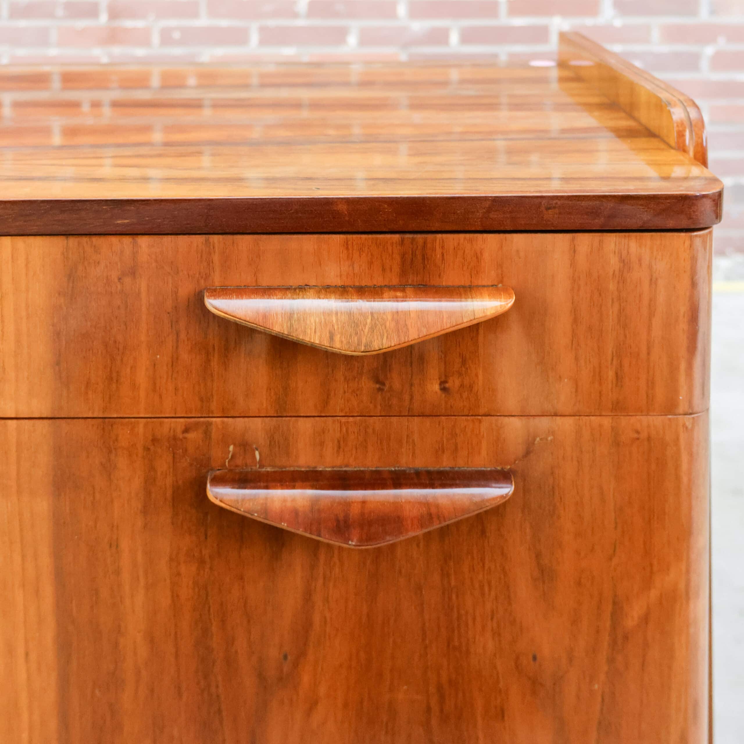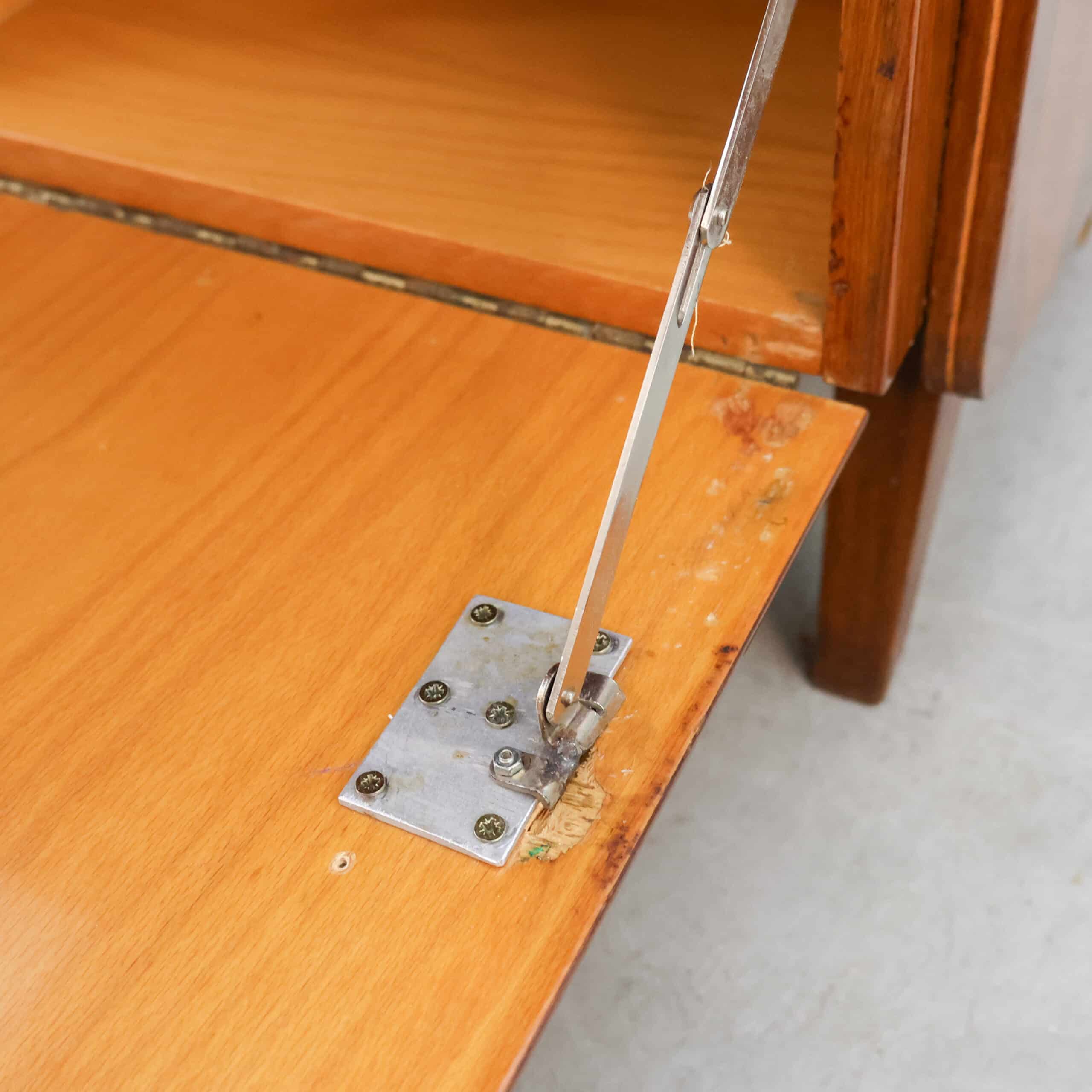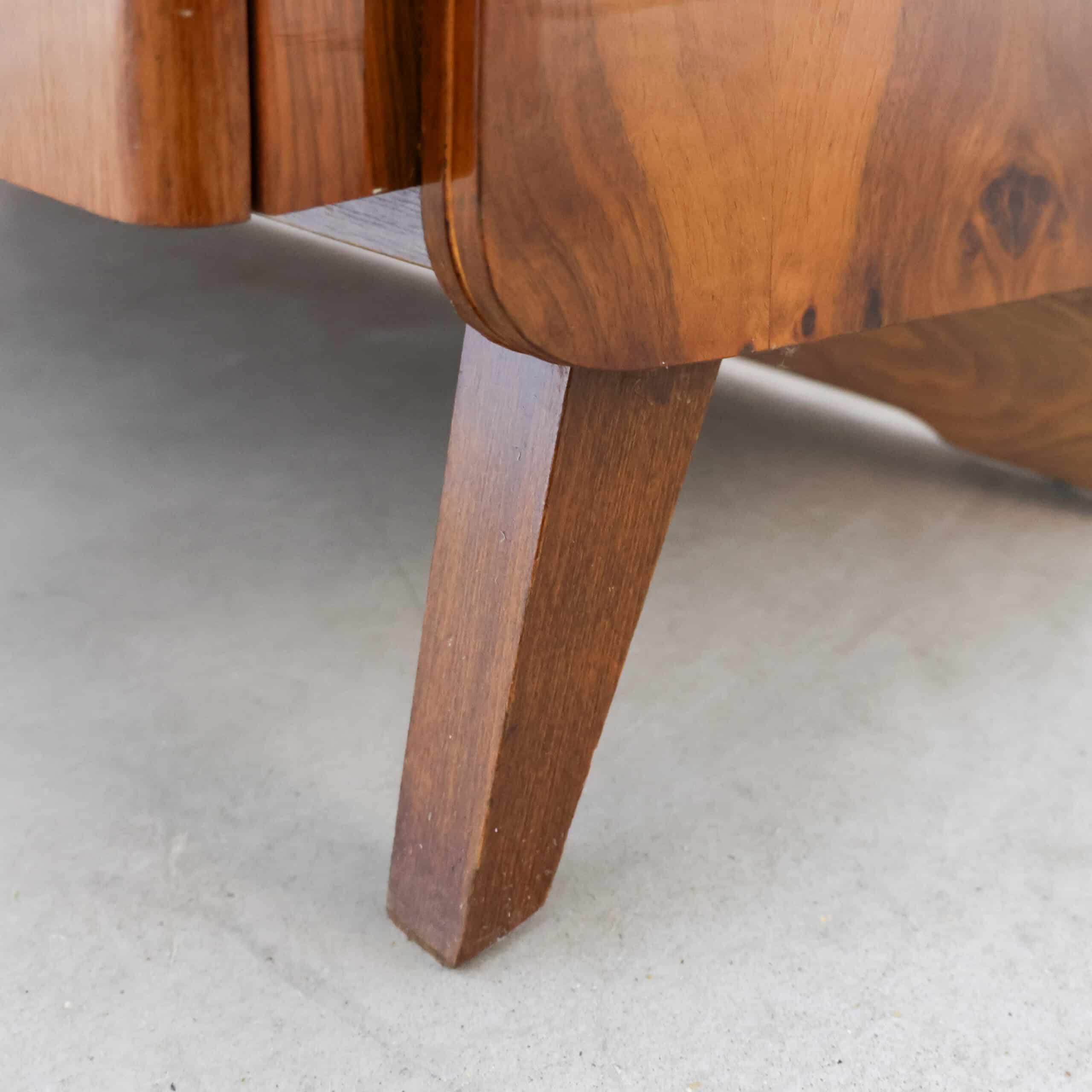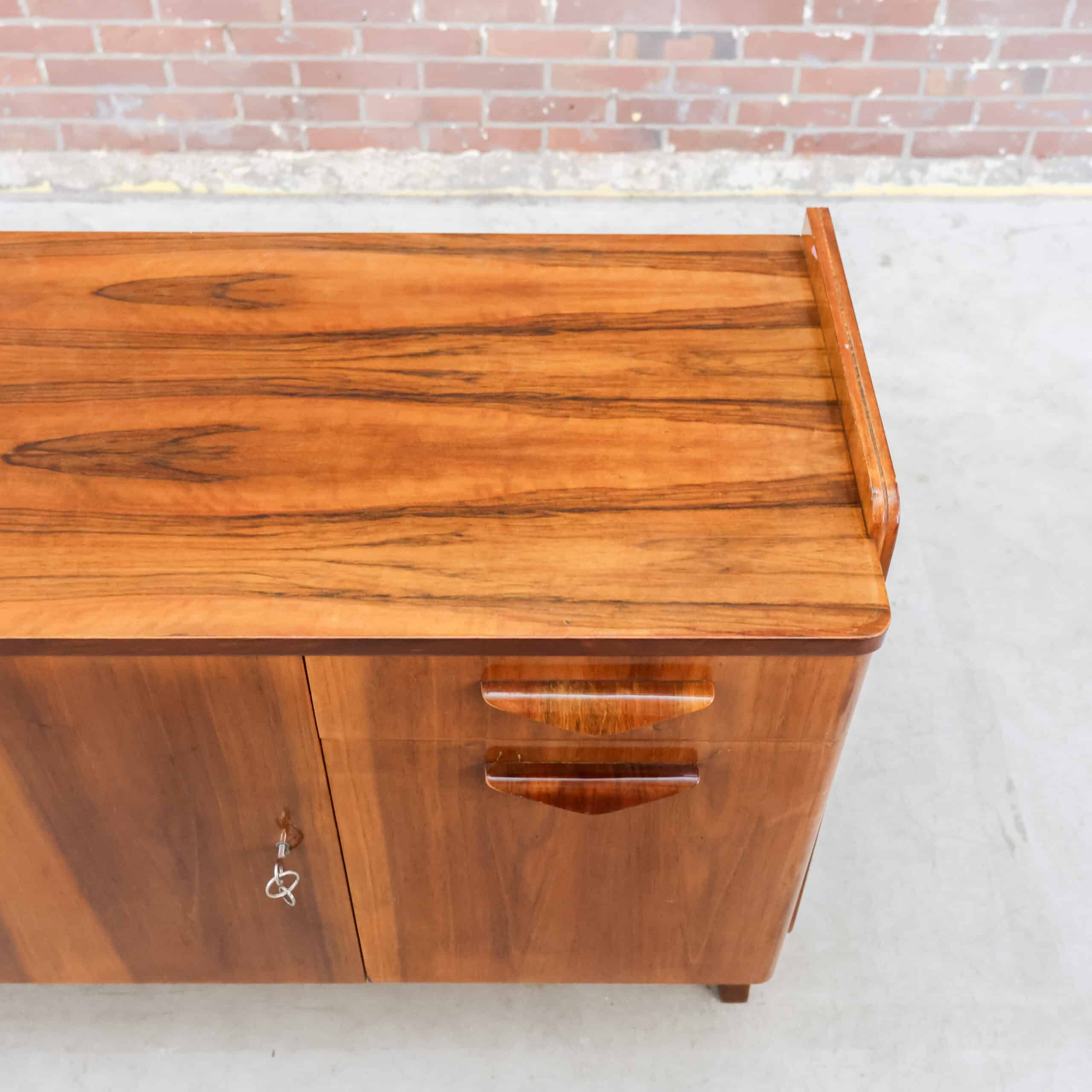 Prachtig vintage dressoir van Tatra Nábytok uit de jaren ’70, met warm bruin fineer en slanke schuine pootjes. Het oorspronkelijke Skrinka pod televizor ontwerp is nu perfect als opbergkast of sidetable. Subtiele verwering geeft het meubel extra charme en karakter. Een stijlvol stukje Oostblok mid-century design voor in elk interieur.