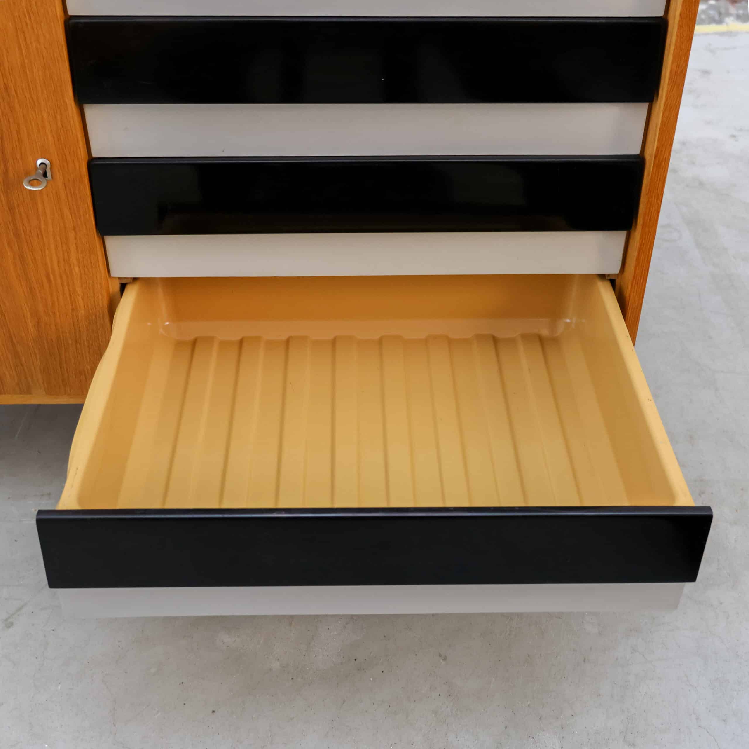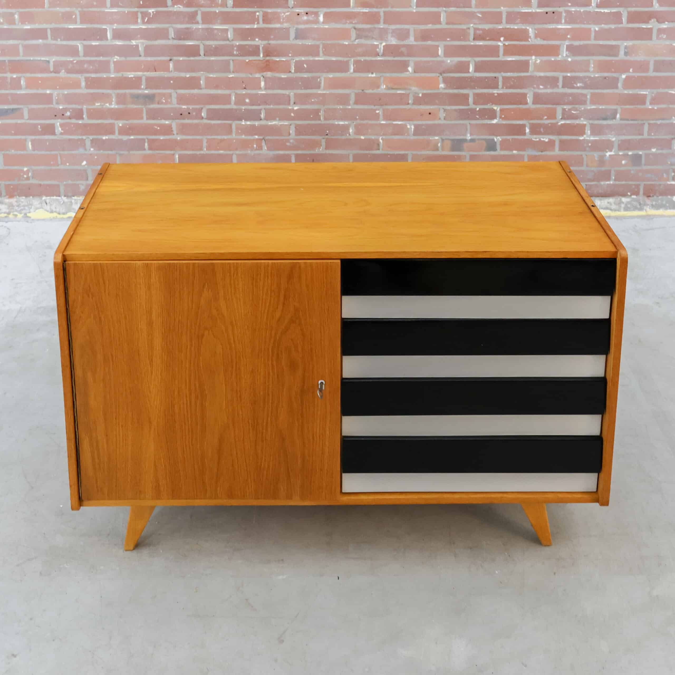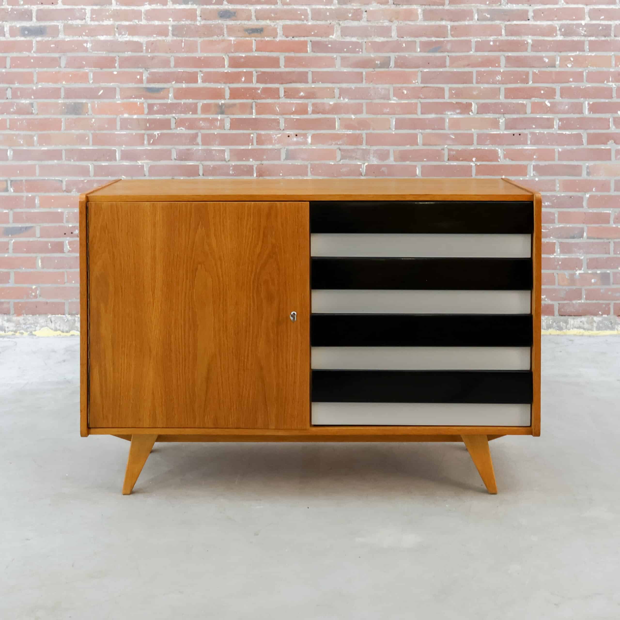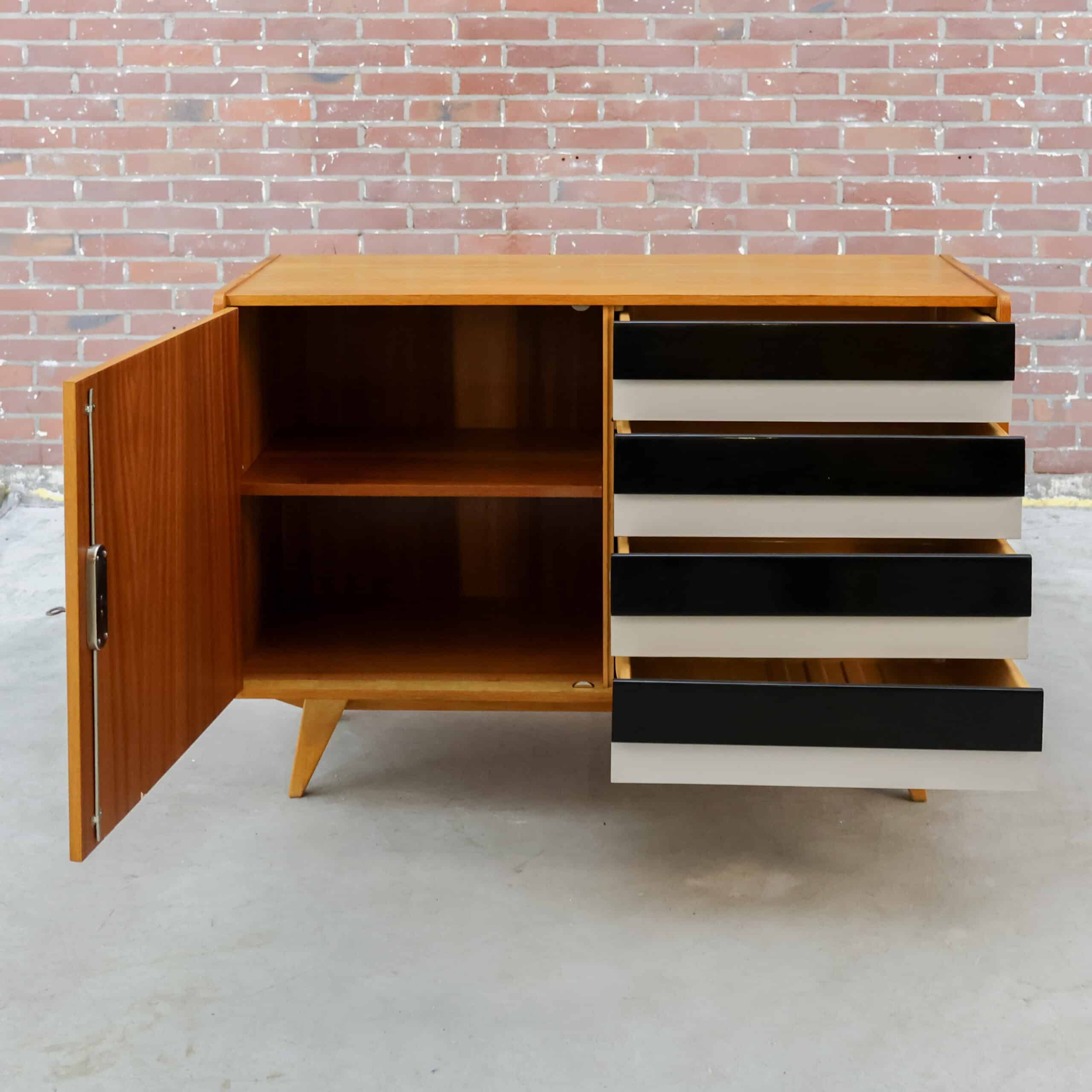 Zeldzame ladekast Interier Praha U-453 uit 1966, ontworpen door František Jirák. Met zijn warme houten corpus, schuine poten en lades in zwart, wit en zachtroze is dit een echt Oost-Europees mid-century icoon. Gemaakt in Třešť (Tsjechoslowakije) en nog voorzien van het originele fabriekslabel. Een speels en tijdloos meubel dat meteen karakter toevoegt aan elk interieur.